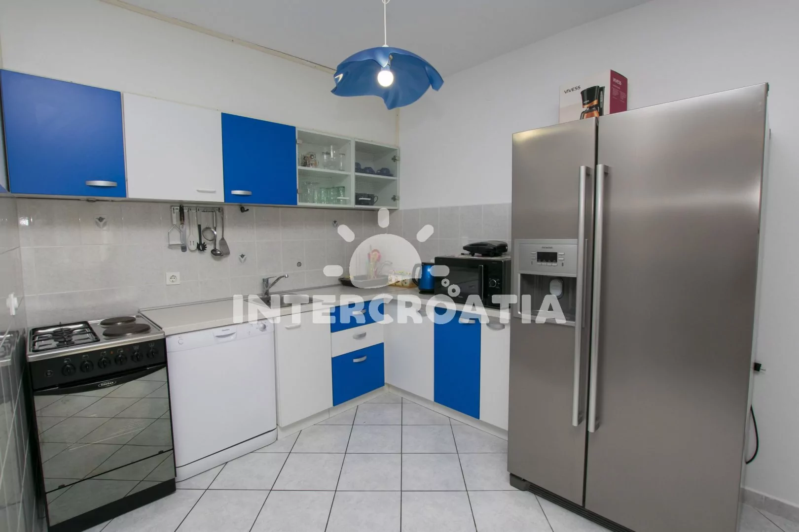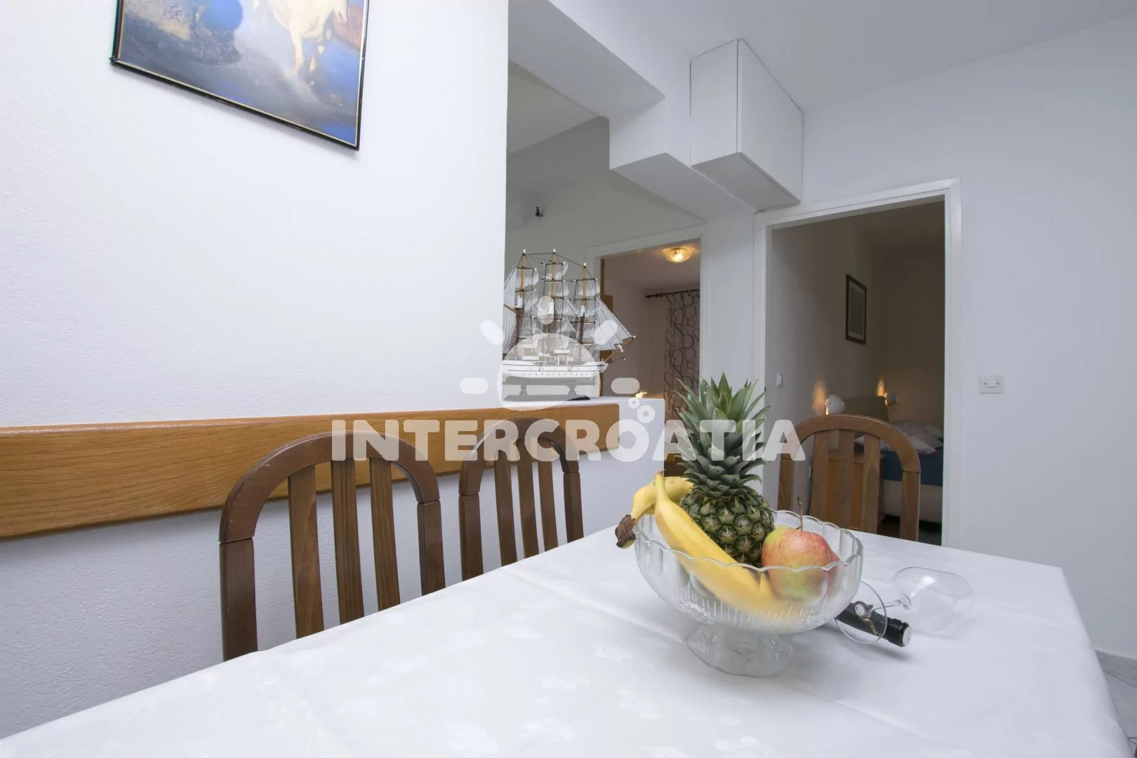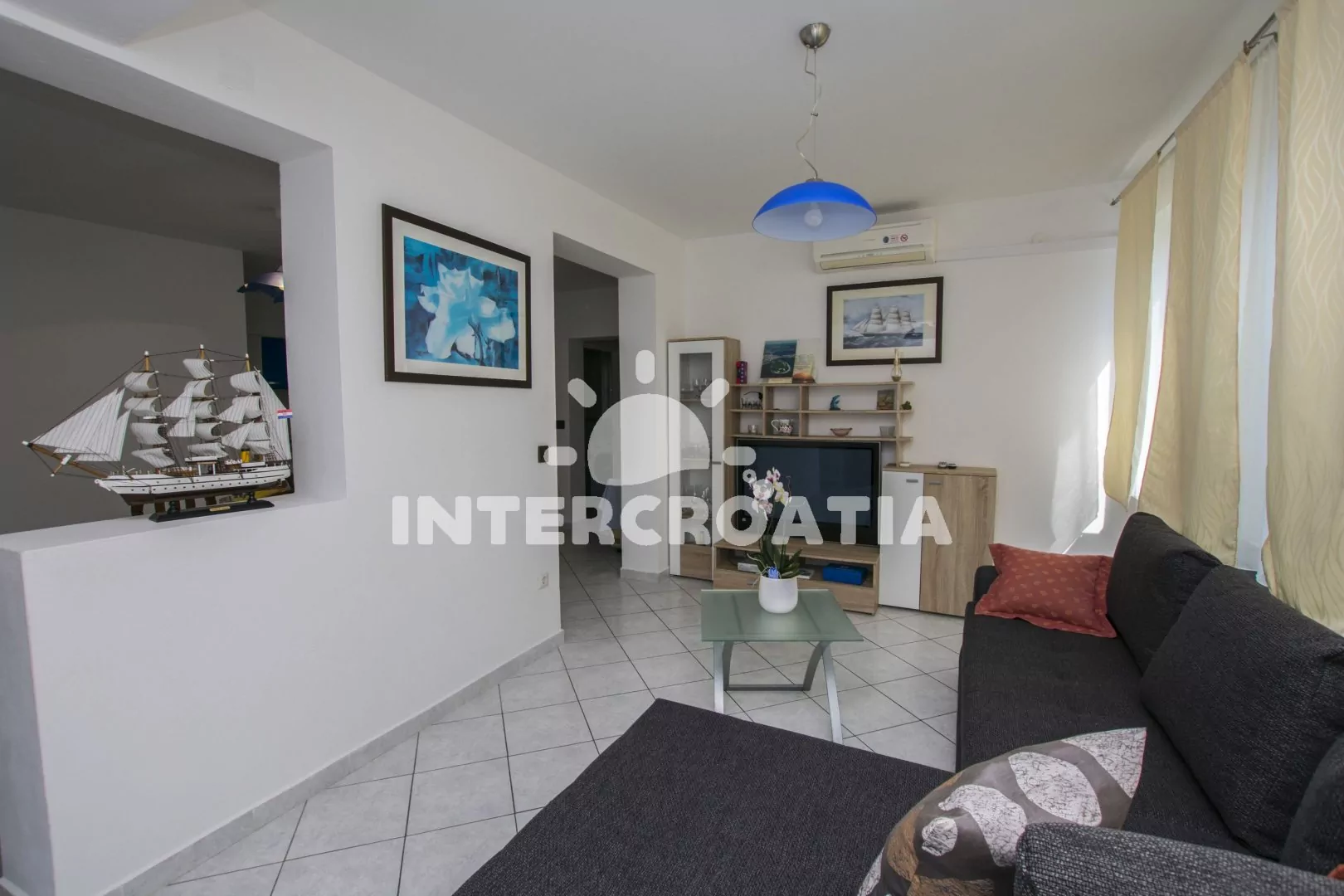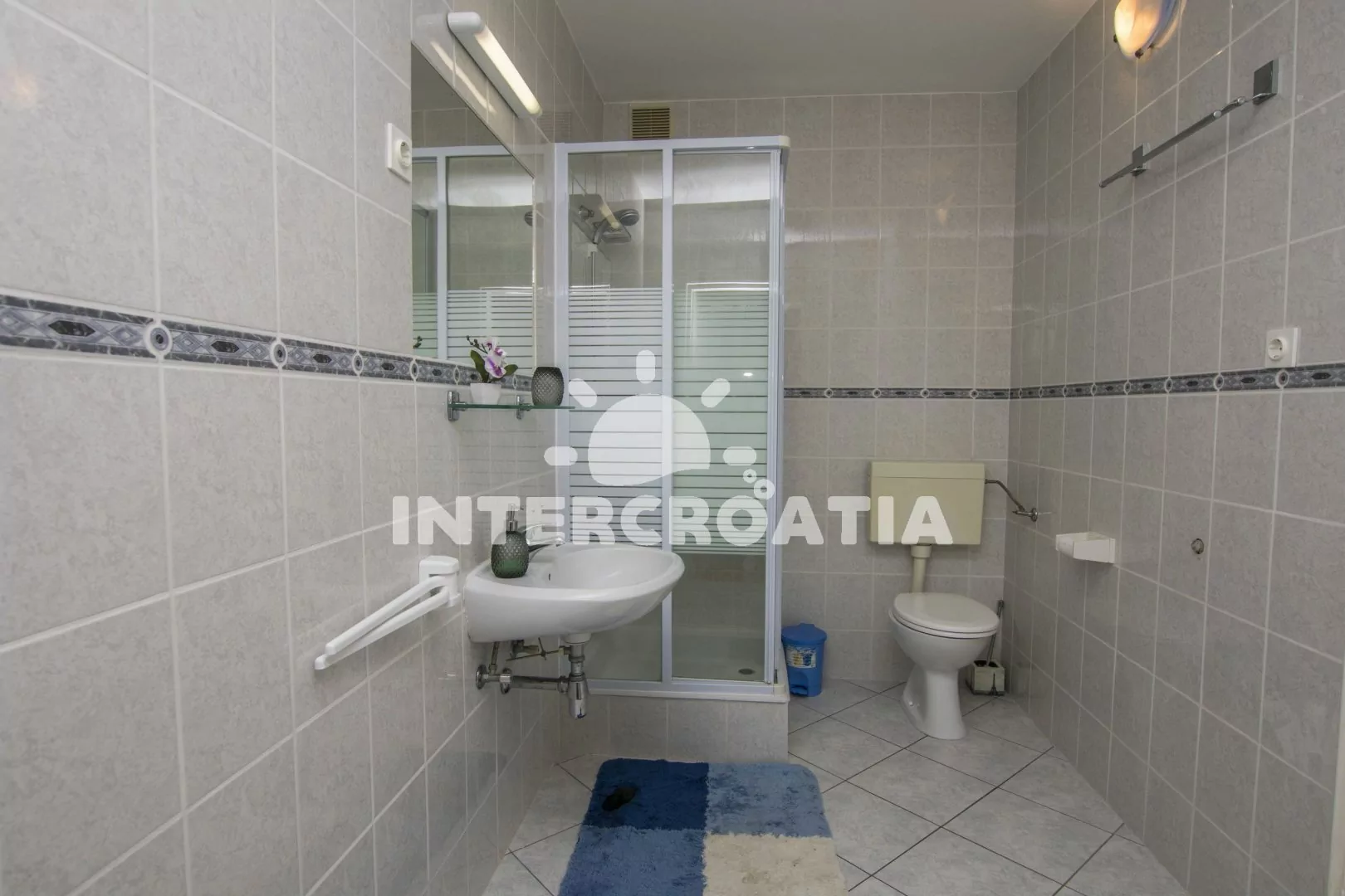 Apartmán (80 m2) s balkonem, posezením, výhledem do zahrady a částečně na moře se nachází ve 2. patře domu. Apartmán má 3 ložnice, 2 koupelny a je vhodný pro 6 až 7 osob. Obývací pokoj je spojený s kuchyní. Kuchyňská linka je vybavena sporákem s troubou, myčkou na nádobí, rychlovarnou konvicí, kávovarem, mikrovlnnou troubou, toustovačem, nádobím a lednicí s mrazákem. Obývací pokoj s jídelním stolem, pohovkou (rozložitelná na extra lůžko pro 1 osobu), televizí se satelitním programem a klimatizací. Koupelna se sprchovým koutem, umyvadlem, fénem a wc. Hostům je k dispozici parkování u objektu zdarma. První ložnice s dvěma jednolůžky a vstupem na balkon. Druhá ložnice s dvoulůžkem a vstupem na balkon. Třetí ložnice s dvoulůžkem. První koupelna se sprchovým koutem, umyvadlem a wc. Druhá koupelna s vanou, umyvadlem, pračkou, fénem, bidetem a wc. Hostům je k dispozici parkování u objektu zdarma.