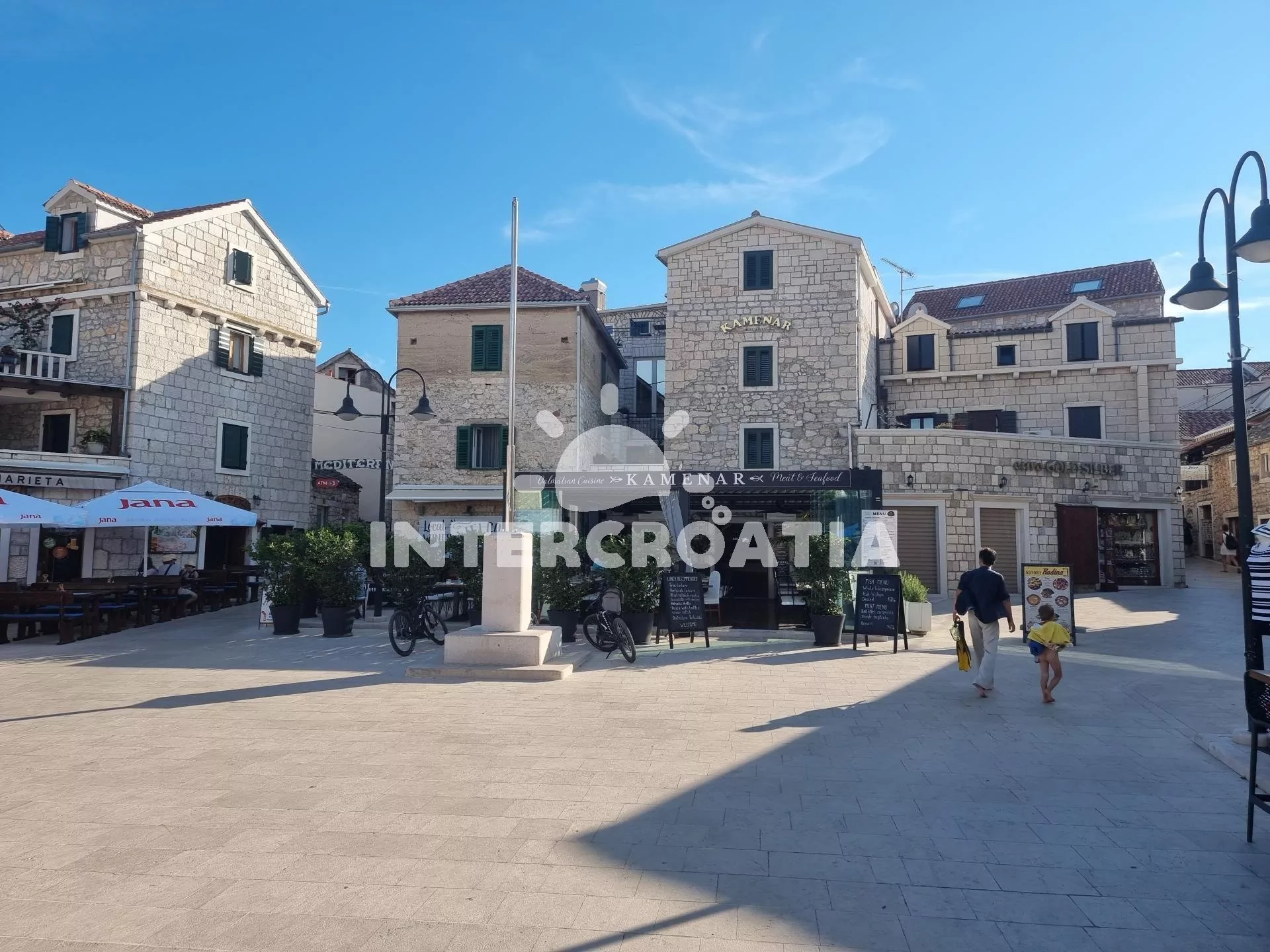 Vzdálenosti: Moře a pláž 250 m, centrum 650 m, supermarket 220 m, bar 260 m, restaurace 280 m, čerpací stanice 300 m, veřejná doprava 460 m, pošta 470 m, lékárna 480 m, půjčovna cyklistických kol a směnárna 490 m, banka 540 m, půjčovna motorových člunů 550 m, tenisové kurty 660 m, mini golf 780 m, ambulance 900 m, potápění 990 m, diskotéka 1,2 km, přístav 1,9 km, park Plitvice 45 km, letiště (Split) 30 km, trajekt (Split) 60 km.