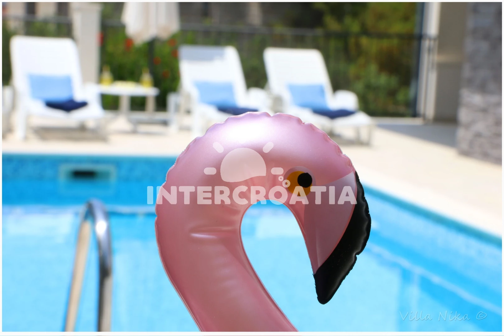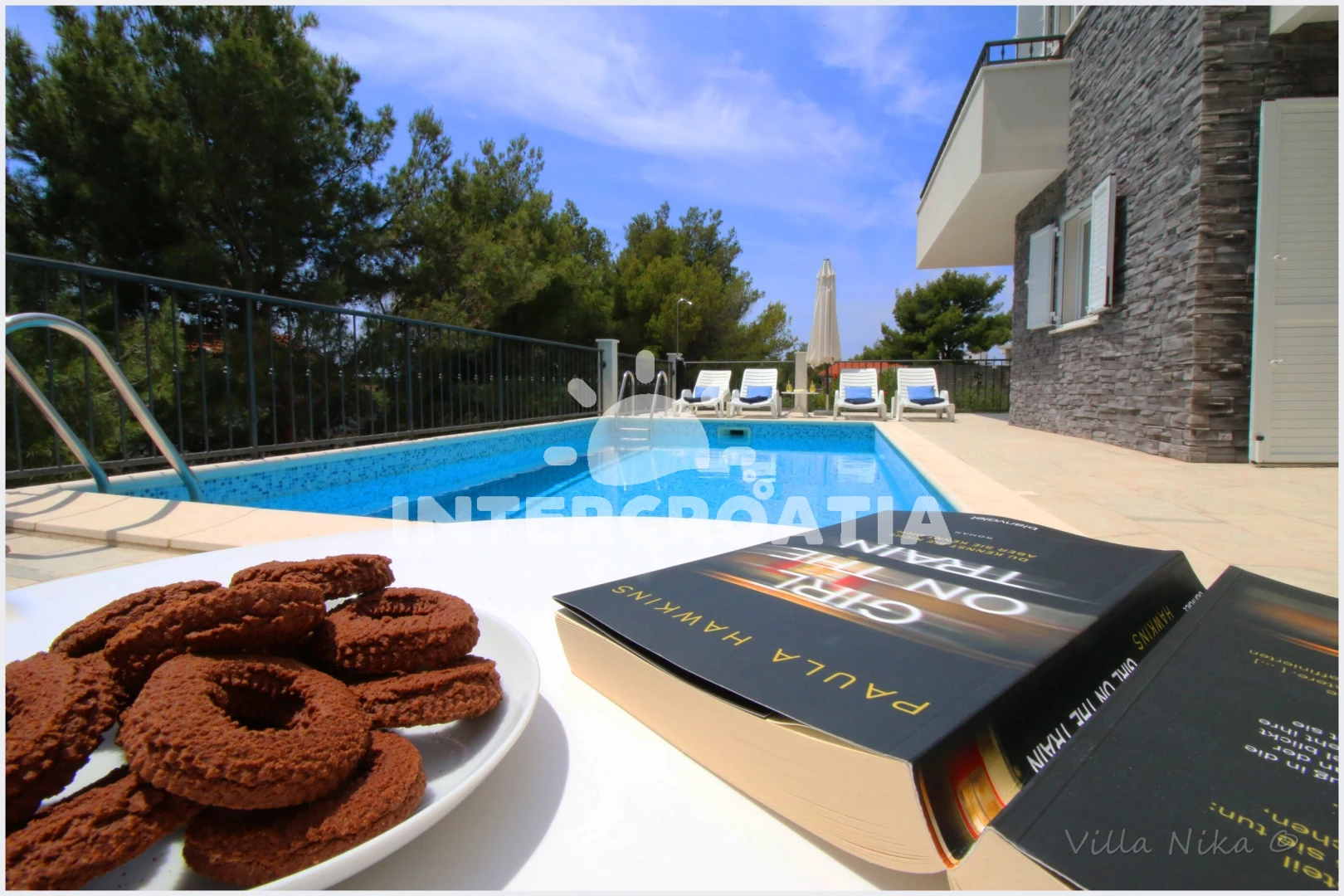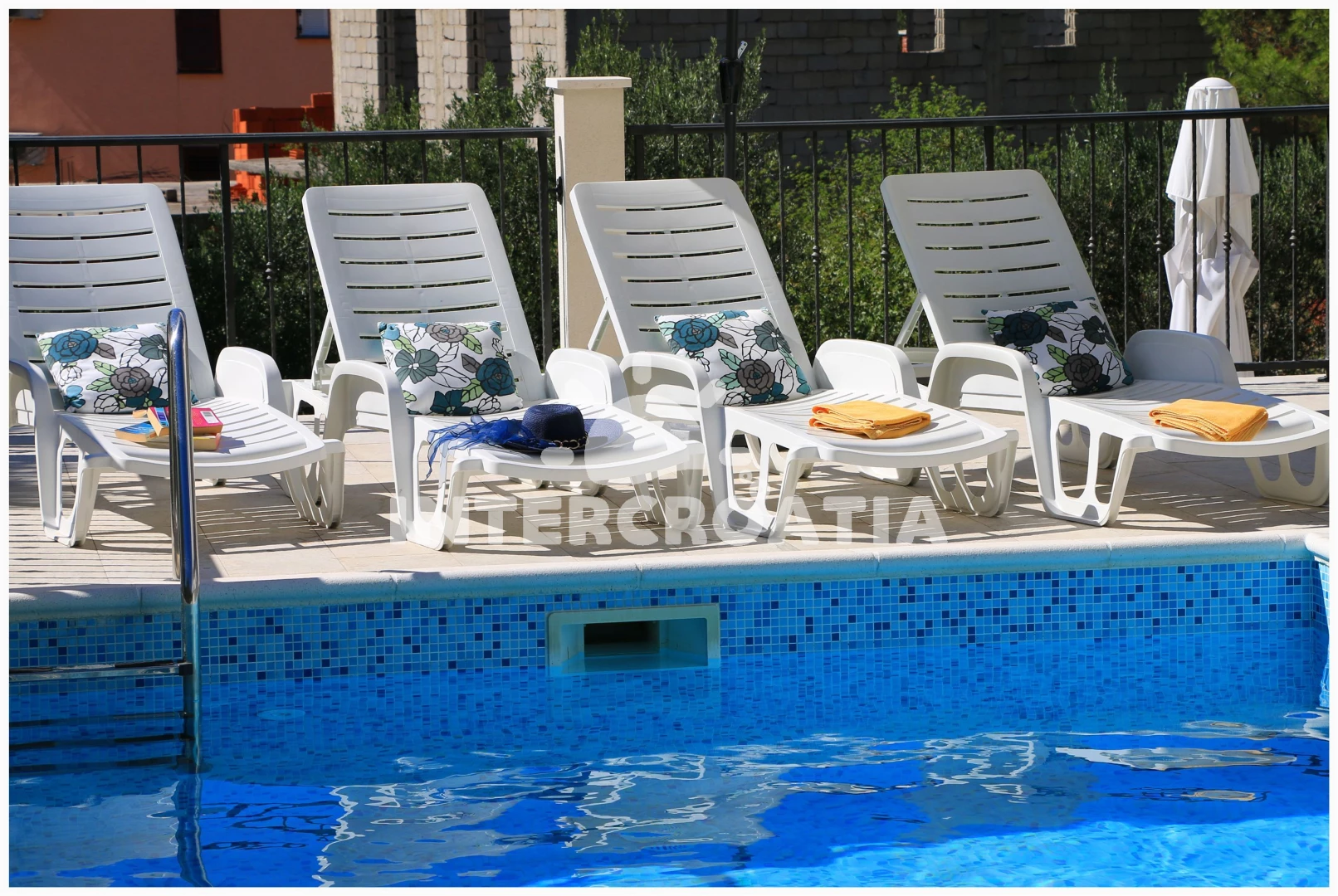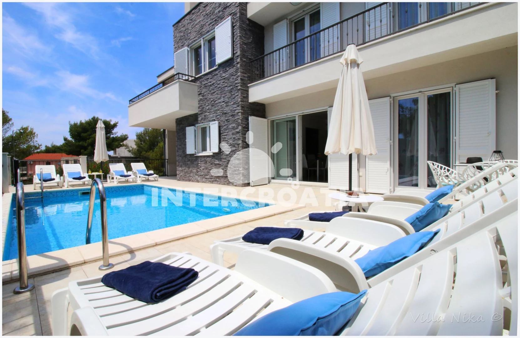 Apartmán se nachází 950 m od moře a pláže. Pláž je oblázková a větší kamení. Apartmán disponuje bazénem s lehátky pro ubytované hosty. U objektu je k dispozici společná zahrada s posezením a grilem. Parkování je před domem.