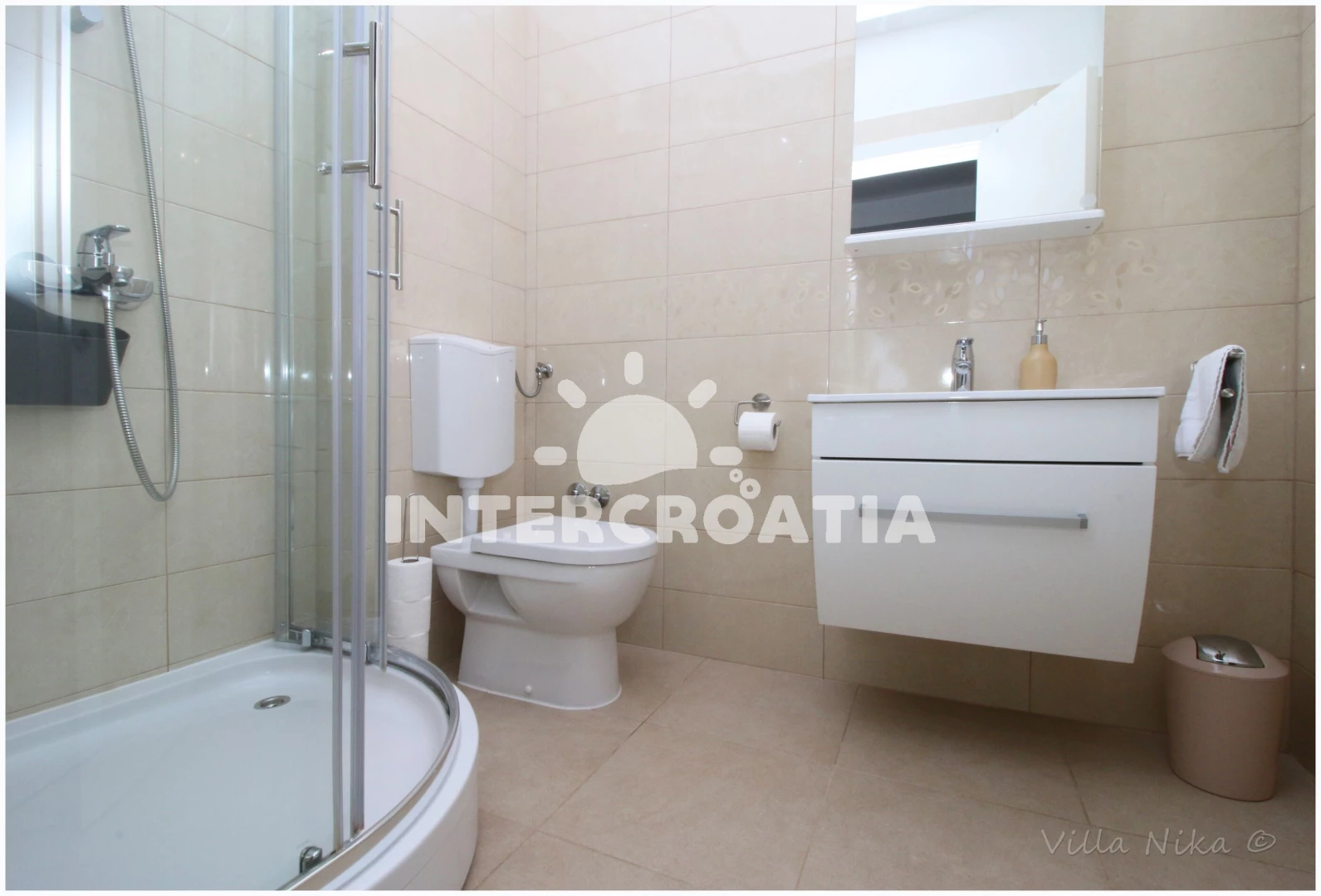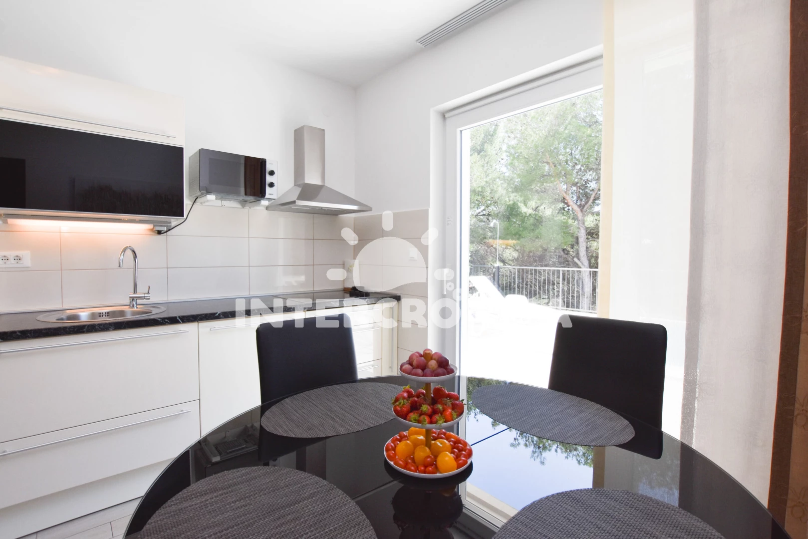 Vzdálenosti: Moře 150 m, pláž 950 m (oblázková a větší kamení), čerpací stanice 460 m, pošta 950 m, banka 950 m, půjčovna kol 950 m, veřejná doprava 950 m, centrum 950 m, restaurace 950 m, bar 950 m, směnárna 950 m, supermarket 950 m, lékárna 950 m, půjčovna motorových člunů 1 km, tenisové kurty 1 km, mini golf 1 km, potápění 1,1 km, diskotéka 2 km, ambulance 2 km, marina 2,5 km, letiště (Split) 30 km, park Plitvice 45 km, trajekt (Split) 60 km,