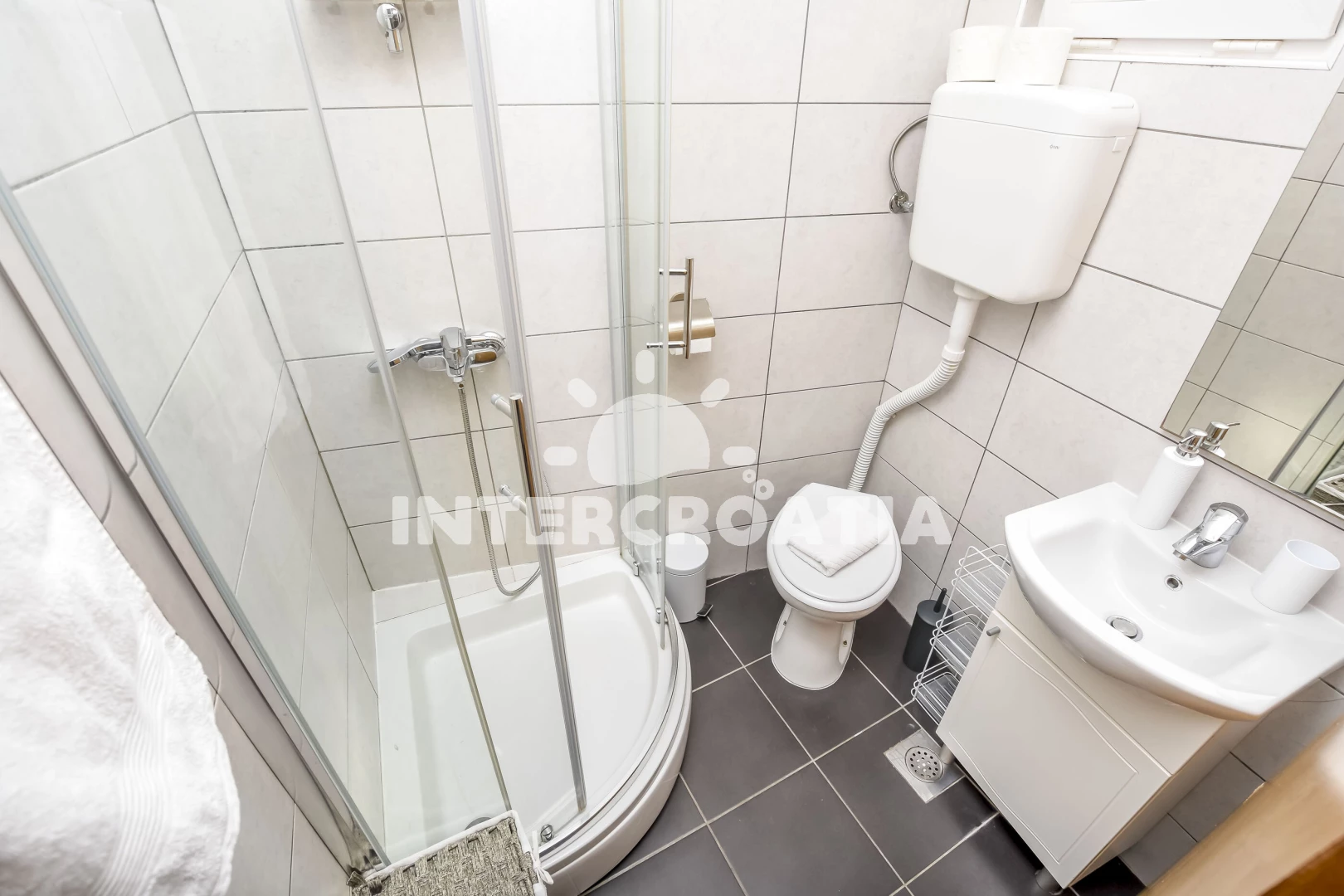 Vzdálenosti: Moře 40 m, pláž 90 m (oblázková a větší kamení), bar 40 m, centrum 40 m, restaurace 40 m, směnárna 70 m, lékárna 280 m, supermarket 300 m, banka 300 m, půjčovna kol 330 m, veřejná doprava 350 m, pošta 350 m, mini golf 500 m, tenisové kurty 500 m, čerpací stanice 555 m, ambulance 1,7 km, diskotéka 1,8 km, trajekt (Šibenik) 30 km, letiště (Split) 43 km,