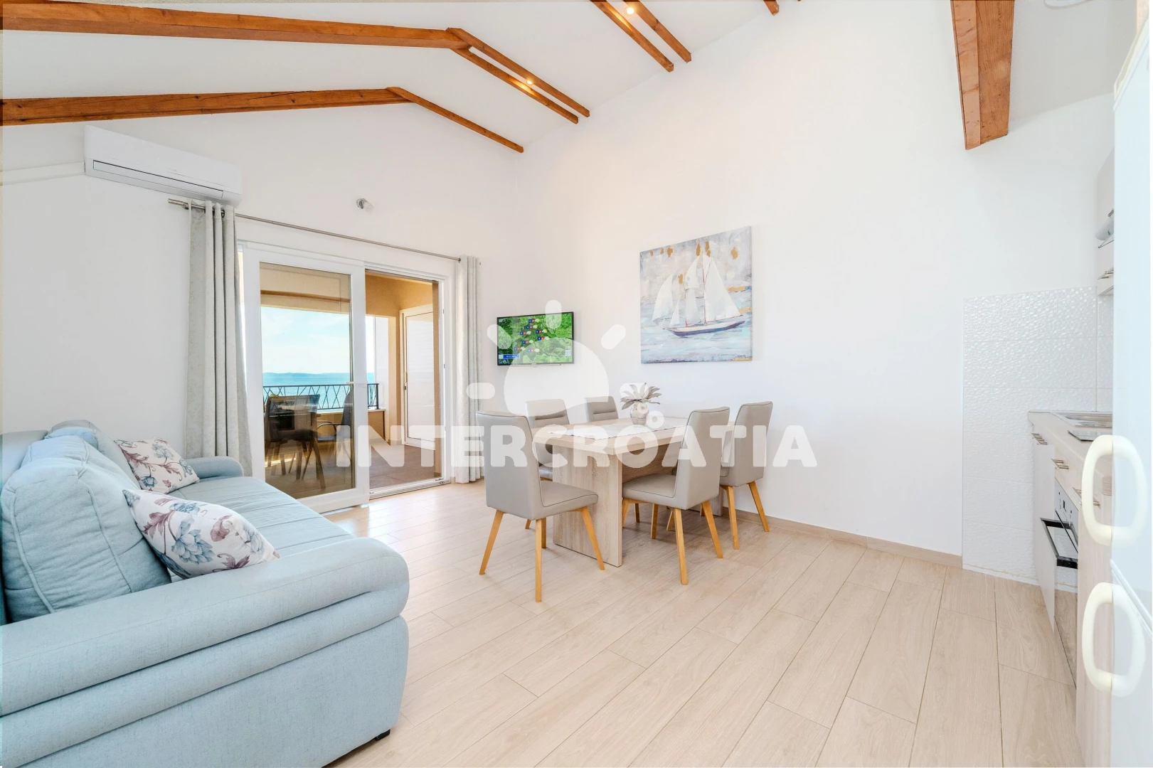 Apartmán se nachází 10 m od moře a pláže. Pláž je oblázková a betonové desky. U objektu je k dispozici společná zahrada s posezením a grilem.
