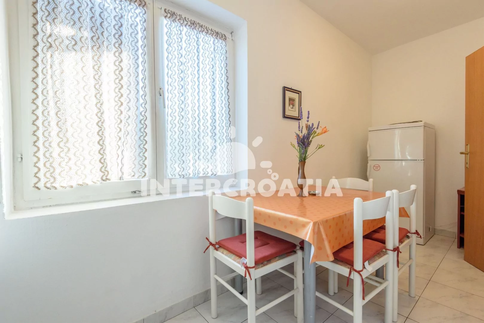 Apartmán (50 m2) s terasou, venkovním posezením a výhledem do zahrady i na moře, nacházející se v 1. patře domu. Vstup, obývací místnost spojená s kuchyňským koutem. Kuchyňská linka se sporákem,…