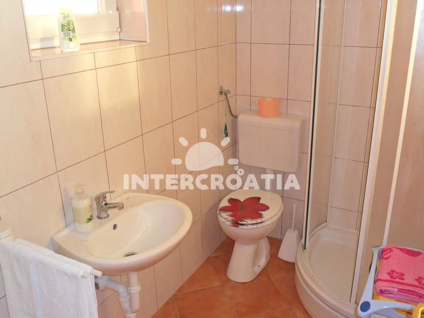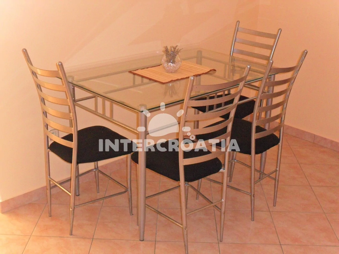 Apartmán v prvním patře domu pro 4 osoby s výhledem do zahrady. Obývací pokoj je spojený s kuchyní. Kuchyňská linka s elektrickým dvouplotýnkovým sporákem, rychlovarnou konvicí, mikrovlnnou troubou, nádobím a lednicí s mrazákem. Obývací pokoj s jídelním stolem pro 4 osoby, televizí se satelitním programem, radiem, klimatizací a vstupem na balkon. První ložnice je vybavena s jedním dvoulůžkem. Druhá ložnice s dvěma jednolůžky. Koupelna se sprchovým koutem, umyvadlem, fénem a wc. Hostům je k dispozici parkování u objektu zdarma.
