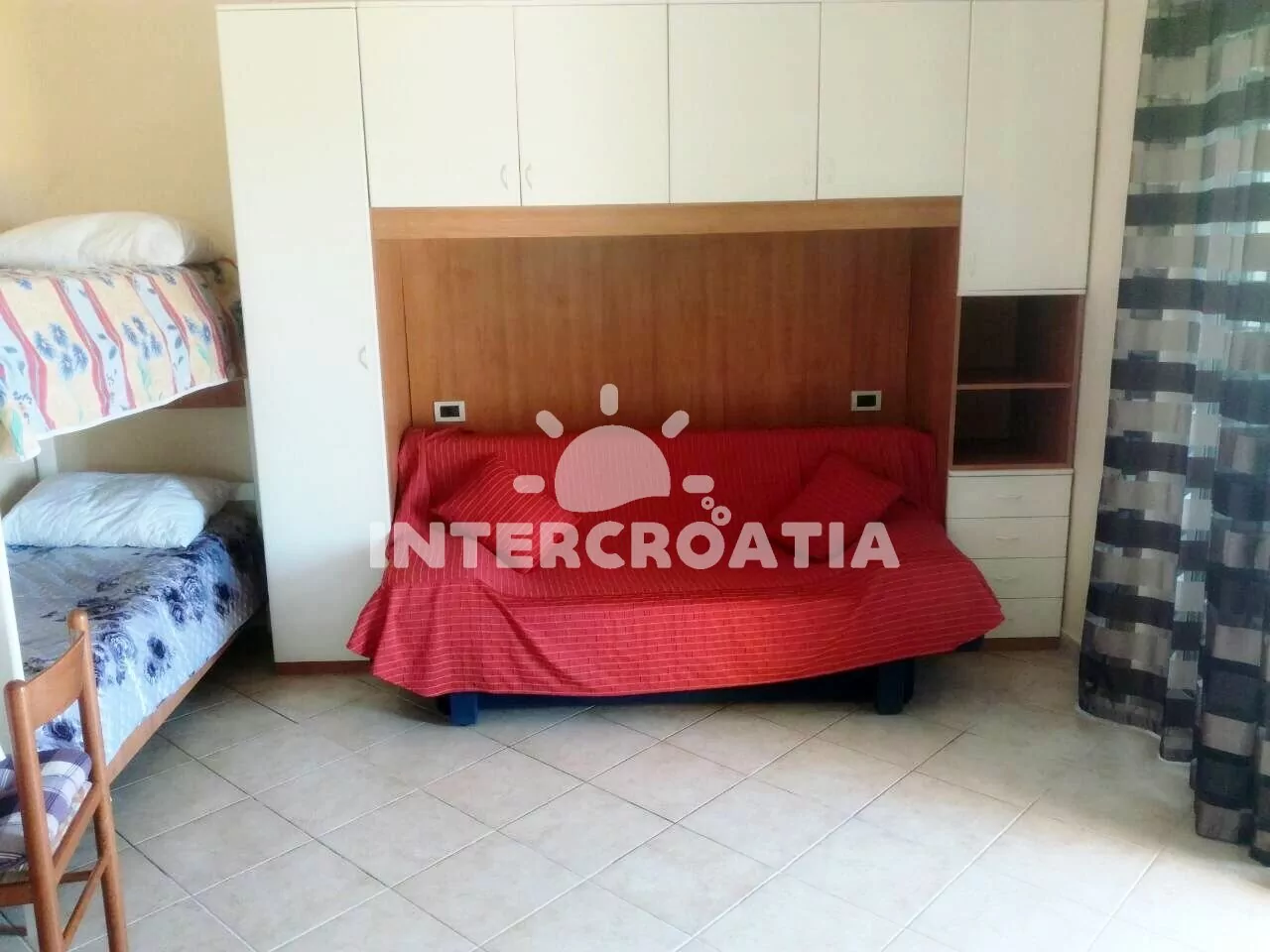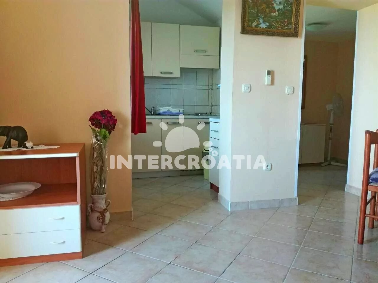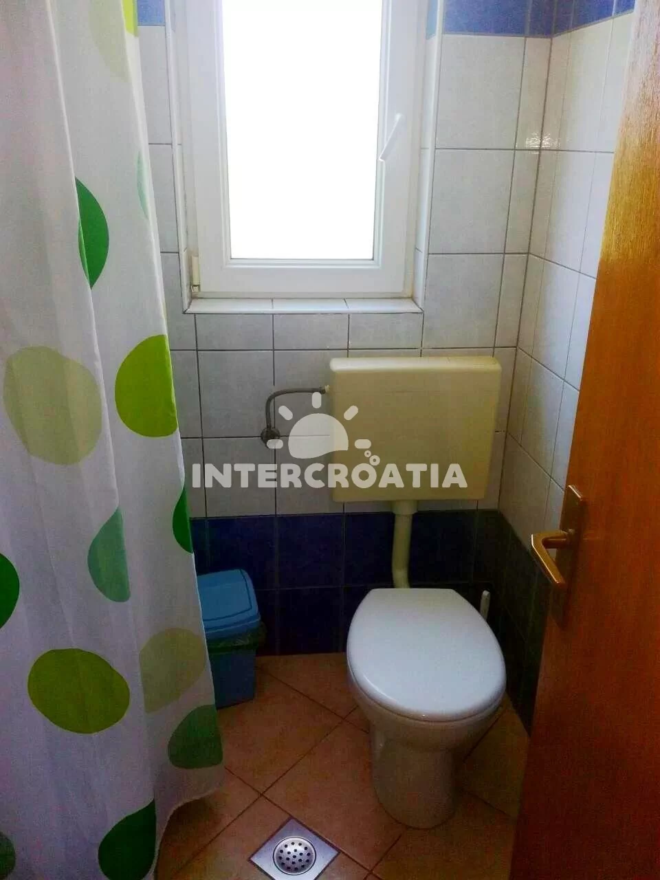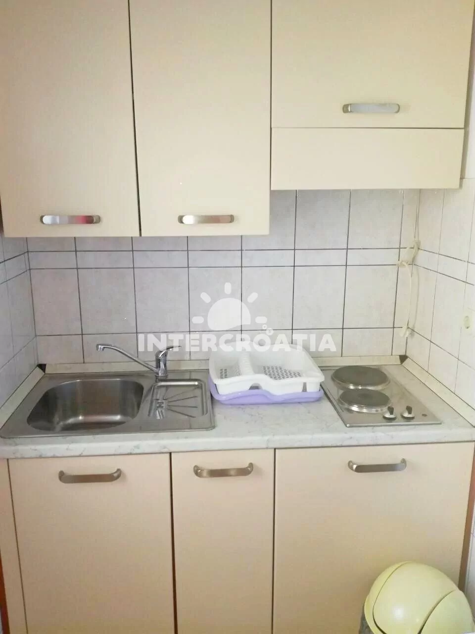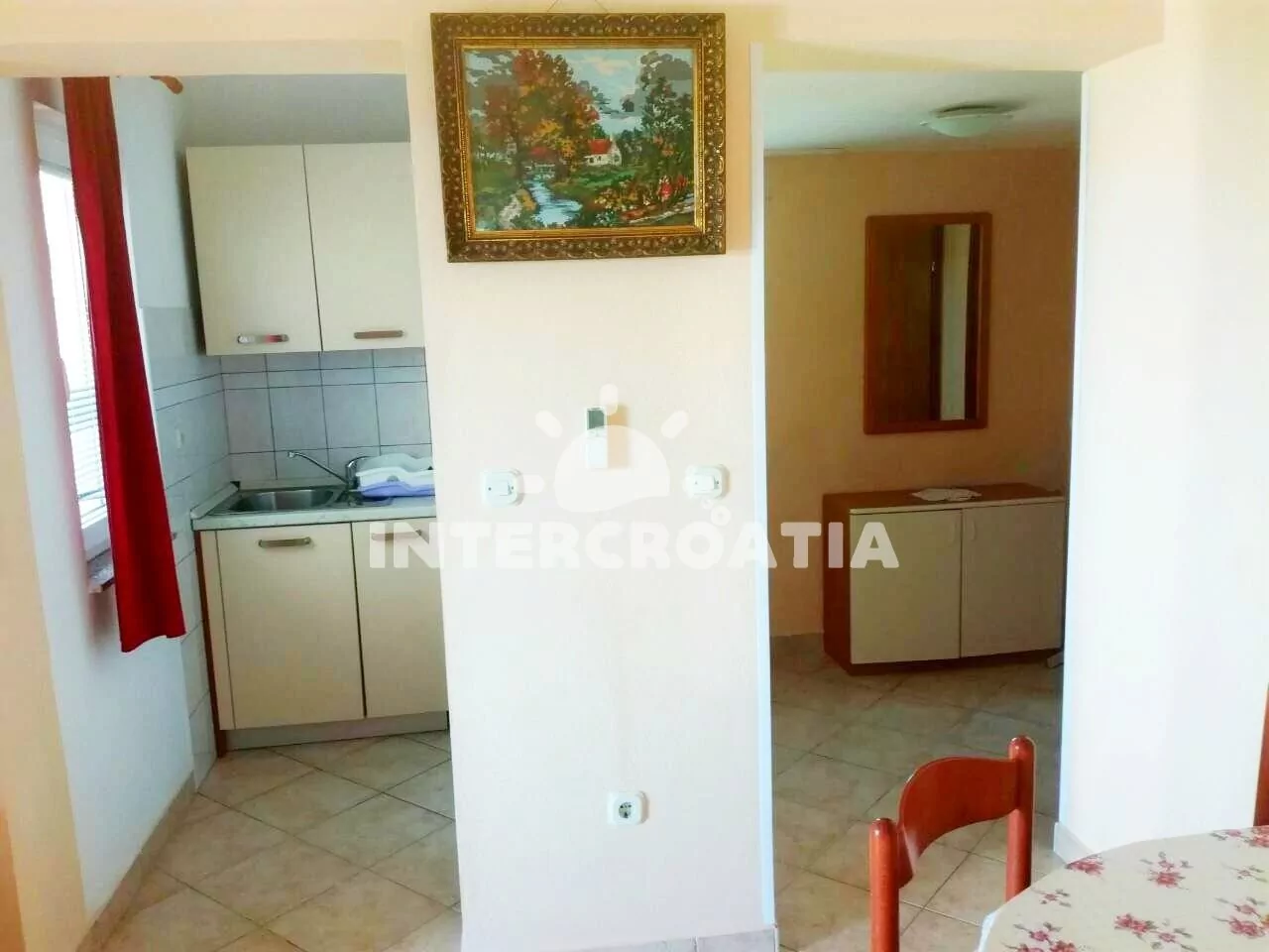 Apartmán s výhledme na moře a balkonem s posezením, se nachází v druhém patře domu a je vhodný pro až 3 osoby. Kuchyň je částečně oddělena od obývacího pokoje. Kuchyňská linka s elektrickým dvouplotýnkovým sporákem, mikrovlnnou troubou, rychlovarnou konvicí, kávovarem, nádobím, lednicí s mrazákem a jídelním stolem. Obývací pokoj je vybavený jedním patrovým lůžkem, rozložitelnou pohovkou (extra lůžko pro 1 osobu), televizí se satelitním programem, radiem a vstupem na balkon. Koupelna se sprchovým koutem, umyvadlem, pračkou a wc. Hostům je dále k dispozici WiFi, klimatizace, dětská postýlka a parkování u objektu zdarma.