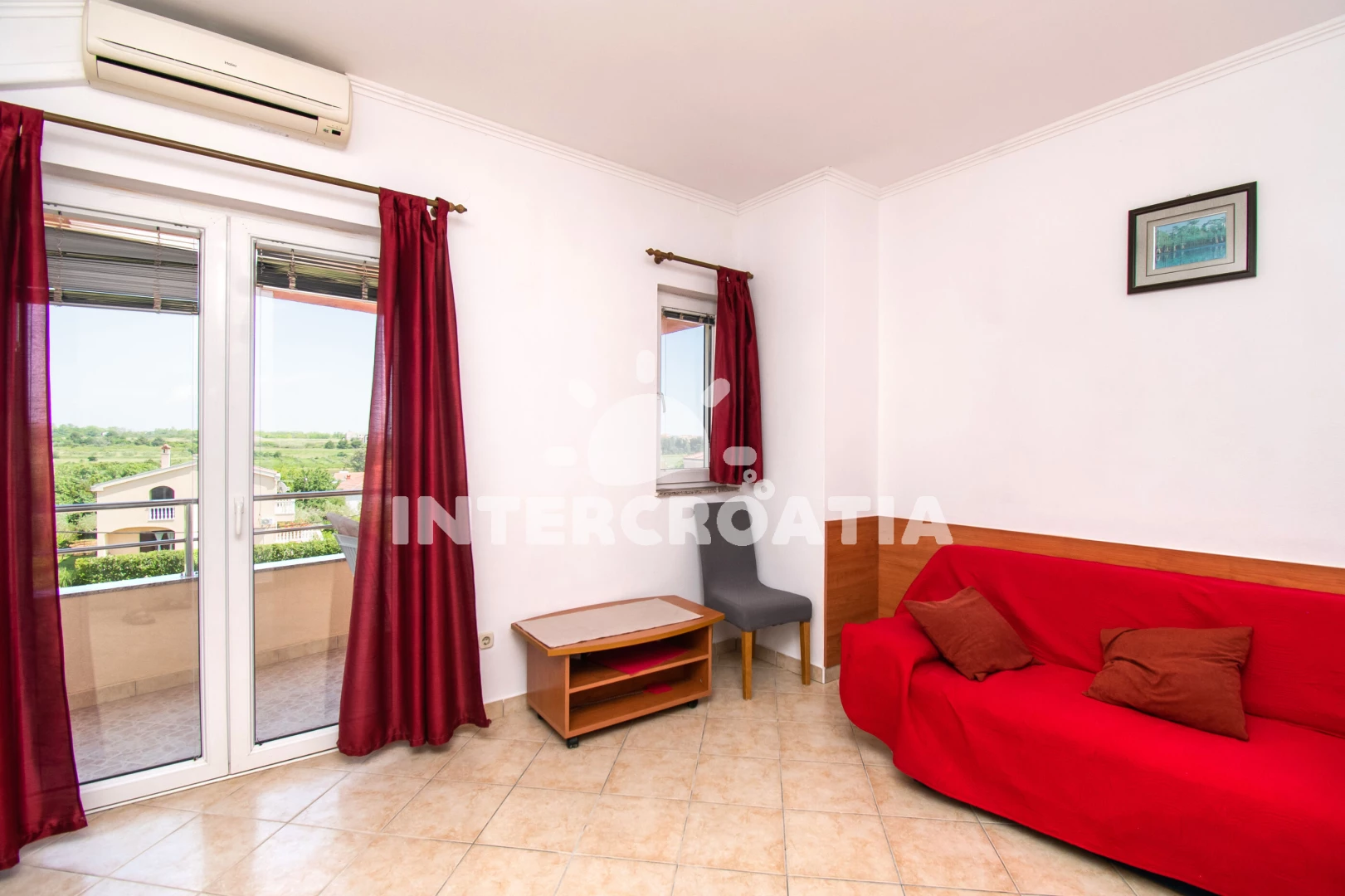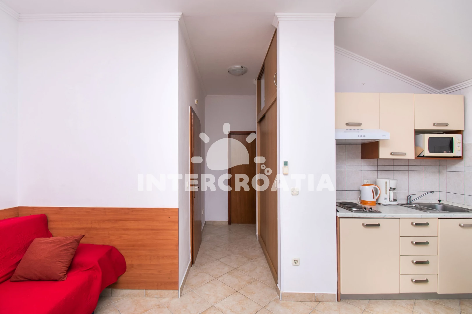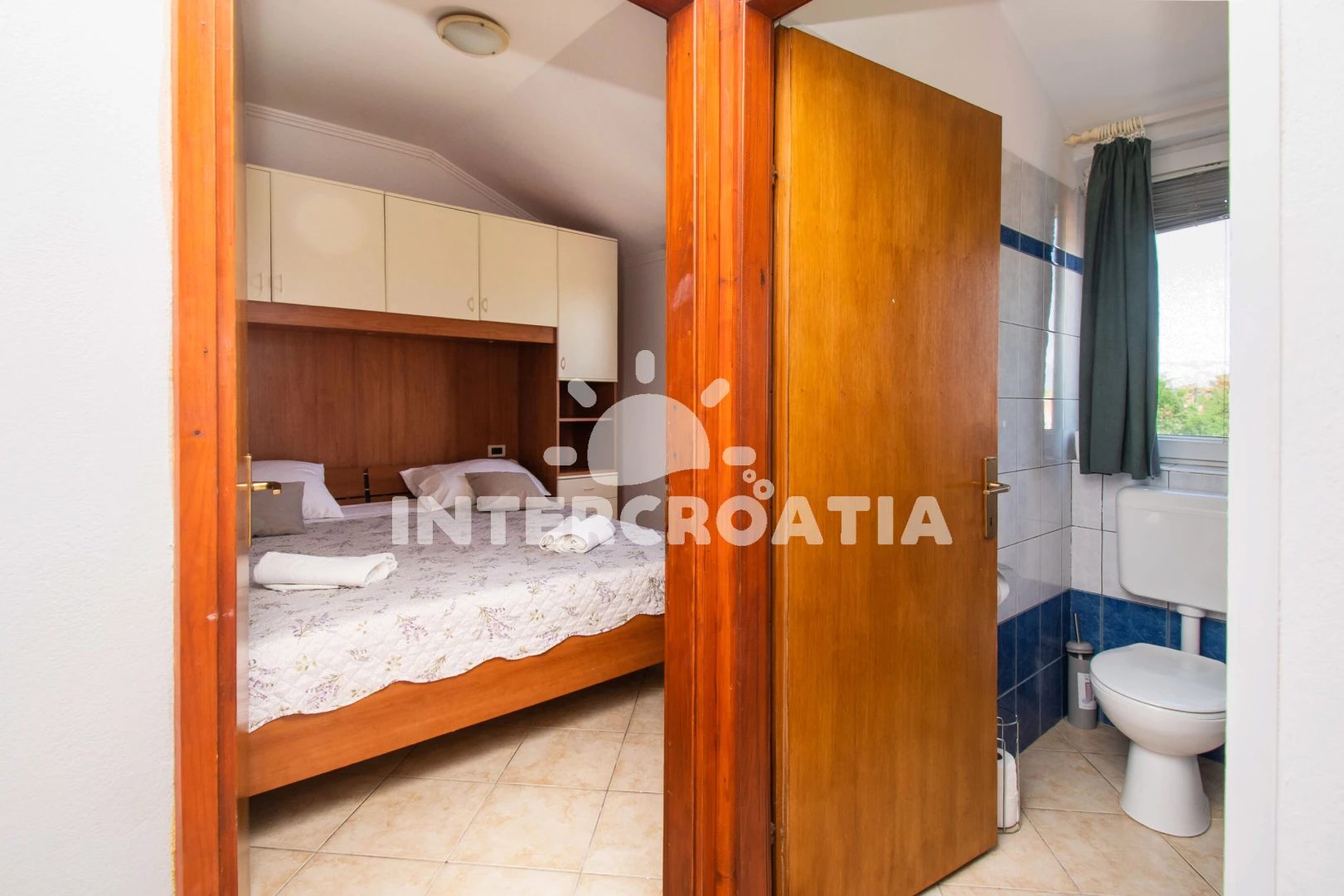 Apartmán s výhledem na moře a balkonem s posezením, se nachází v druhém patře domu a je vhodný pro 2 až 4 osoby. Obývací pokoj je spojený s kuchyní. Kuchyňská linka s elektrickým dvouplotýnkovým sporákem, mikrovlnnou troubou, rychlovarnou konvicí, kávovarem, nádobím, lednicí s mrazákem a jídelním stolem pro 4 osoby. Obývací pokoj s rozložitelnou pohovkou (extra lůžko pro 2 osoby), televizí a radiem. Ložnice je vybavena jedním dvoulůžkem. Koupelna se sprchovým koutem, umyvadlem, pračkou (na požádání) a wc. Hostům je dále k dispozici WiFi, klimatizace, dětská postýlka a parkování u objektu zdarma.