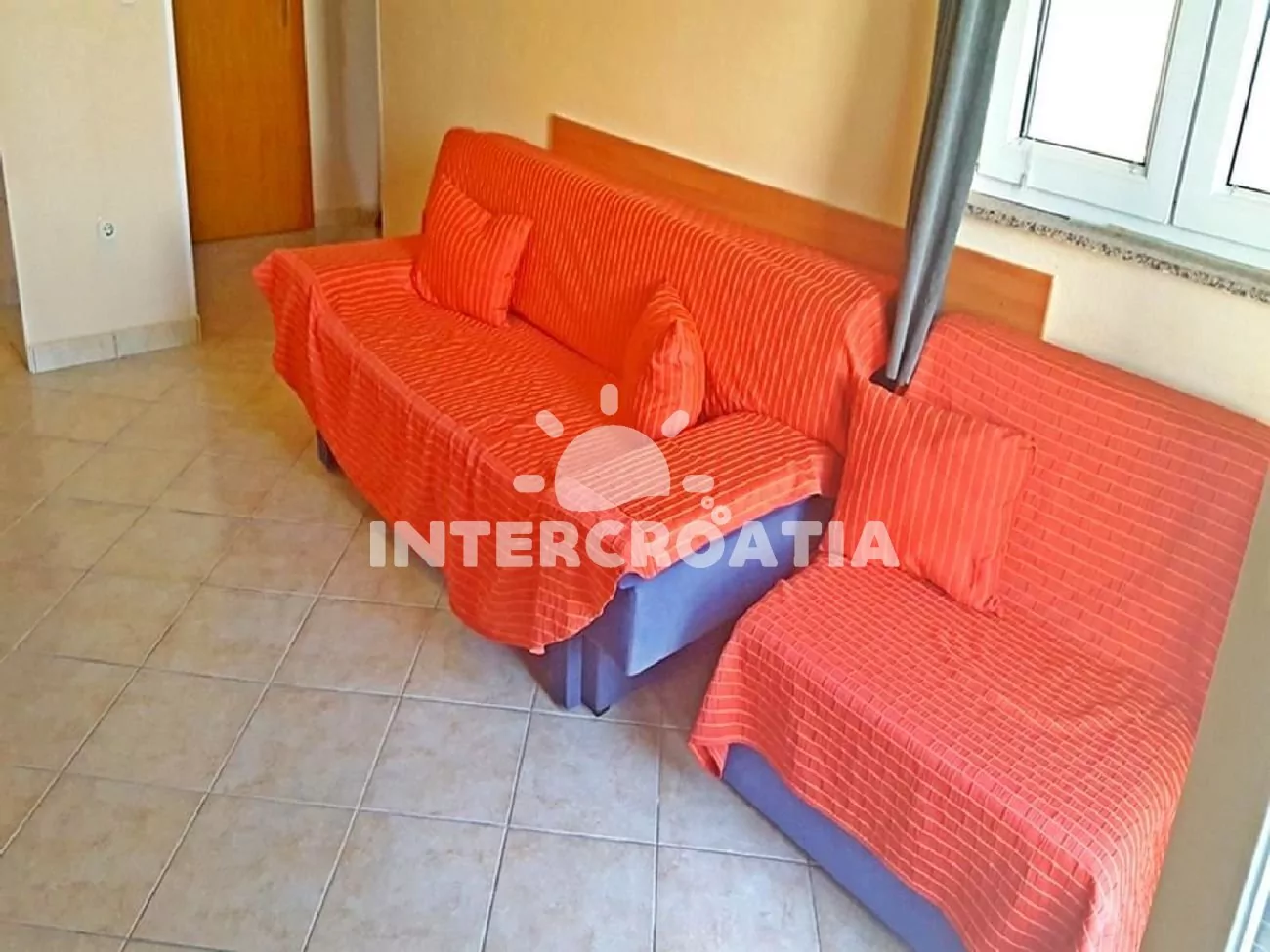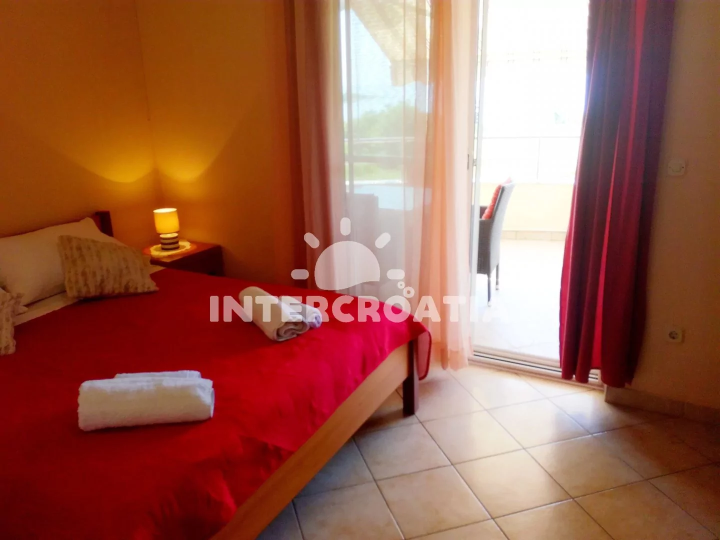 Apartmán s výhledem na moře a balkonem s posezením, se nachází v druhém patře domu a je vhodný pro 2 až 5 osob. Obývací pokoj je spojený s kuchyní. Kuchyňská linka se sporákem, mikrovlnnou troubou, rychlovarnou konvicí, kávovarem, nádobím, lednicí s mrazákem a jídelním stolem pro 4 osoby. Obývací pokoj s rozložitelnou pohovkou (extra lůžko pro 2 osoby) a jednou přistýlkou (rozložitelné extra lůžko pro 1 osobu), televizí a radiem. Ložnice s jedním dvoulůžkem a vstupem na balkon. Koupelna se sprchovým koutem, umyvadlem, pračkou a wc. Hostům je dále k dispozici WiFi, klimatizace, dětská postýlka a parkování u objektu zdarma.