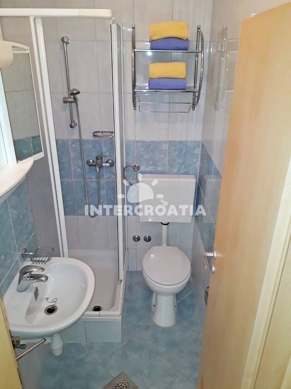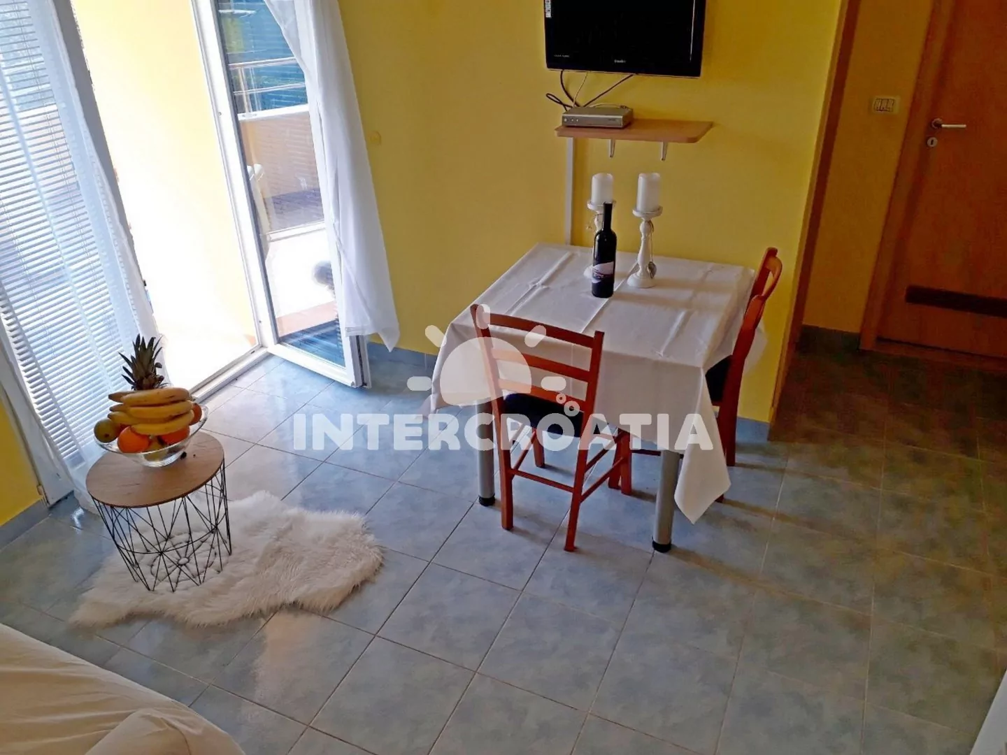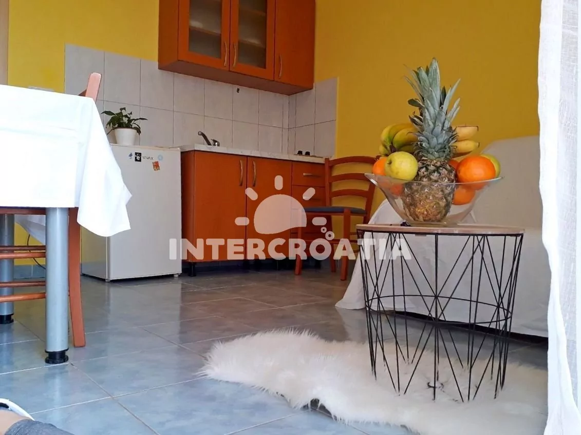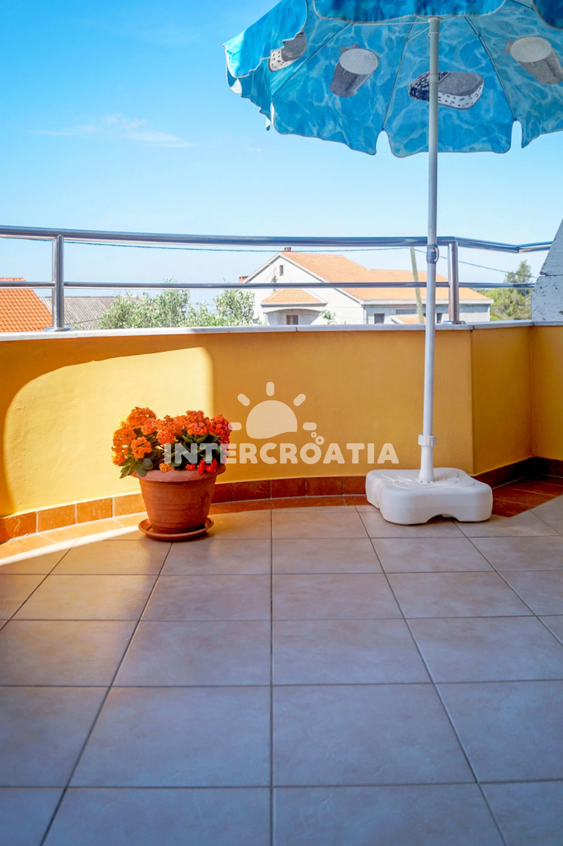 Apartmán v prvním patře domu s terasou, výhledem do zahrady a klidné ulice je vhodný pro 2 až 3 osoby. Obývací pokoj je spojený s kuchyní. Kuchyňská linka je vybavena dvouplotýnkovým sporákem, rychlovarnou konvicí, nádobím a lednicí s mrazákem. Obývací pokoj s jídelním stolem, pohovkou (rozložitelná na extra lůžko pro 1 osobu), televizí, klimatizací a vstupem na terasu. Ložnice s jedním dvoulůžkem. Koupelna se sprchovým koutem, umyvadlem, fénem a wc.