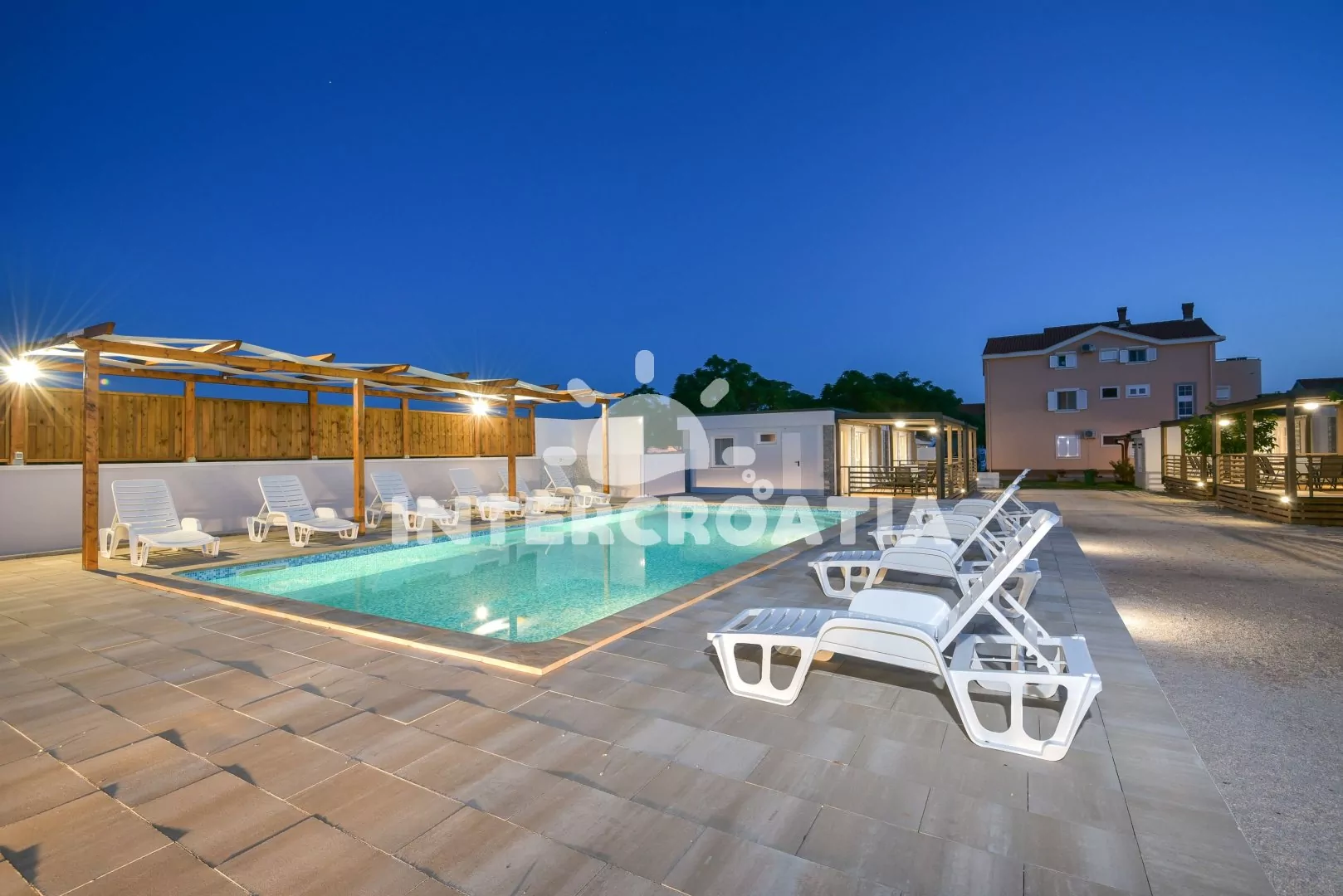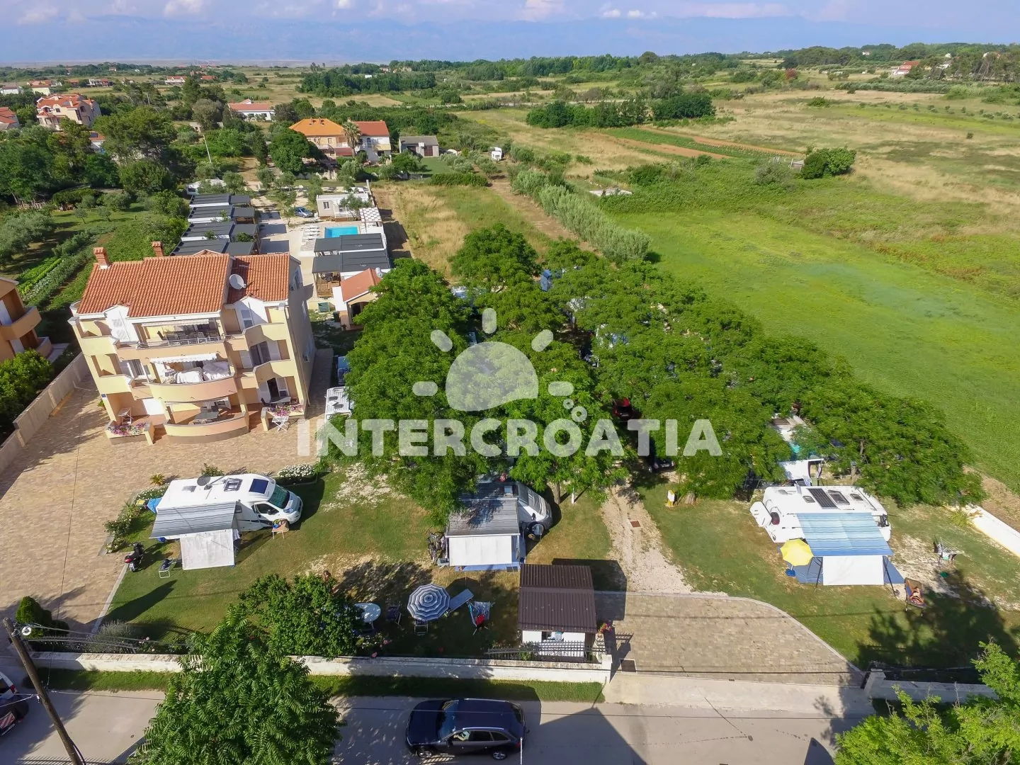 Rezidenční objekt s vilou se nachází na klidném místě v obci Privlaka a je vzdálená pouze 2 minuty chůze od pláže, na kterou nechodí příliš mnoho lidí, takže je ideální pro hosty, kteří hledají klidnější dovolenou. Hosté mají k dispozici velký bazén o rozloze 50 m2, který se nachází za vilou a je k dispozici i pro hosty z kempu a bungalovu. Vedle bazénu je posezení kde si můžete dát osvěžující nápoj a odpočinout na lehátkách, a jen 20 metrů od bazénu se nachází letní kuchyně, kde majitelé připravují místní speciality jako jsou čerstvé ryby a jiné mořské plody , maso a domácí saláty které si lze objednat den předem. V blízkostí se také nachází typická dalmatská restaurace - konoba Planura, kde si můžete vychutnat některé ze specialit místní kuchyně. Hostům jsou k dispozici parkovací místa na pozemku objektu.