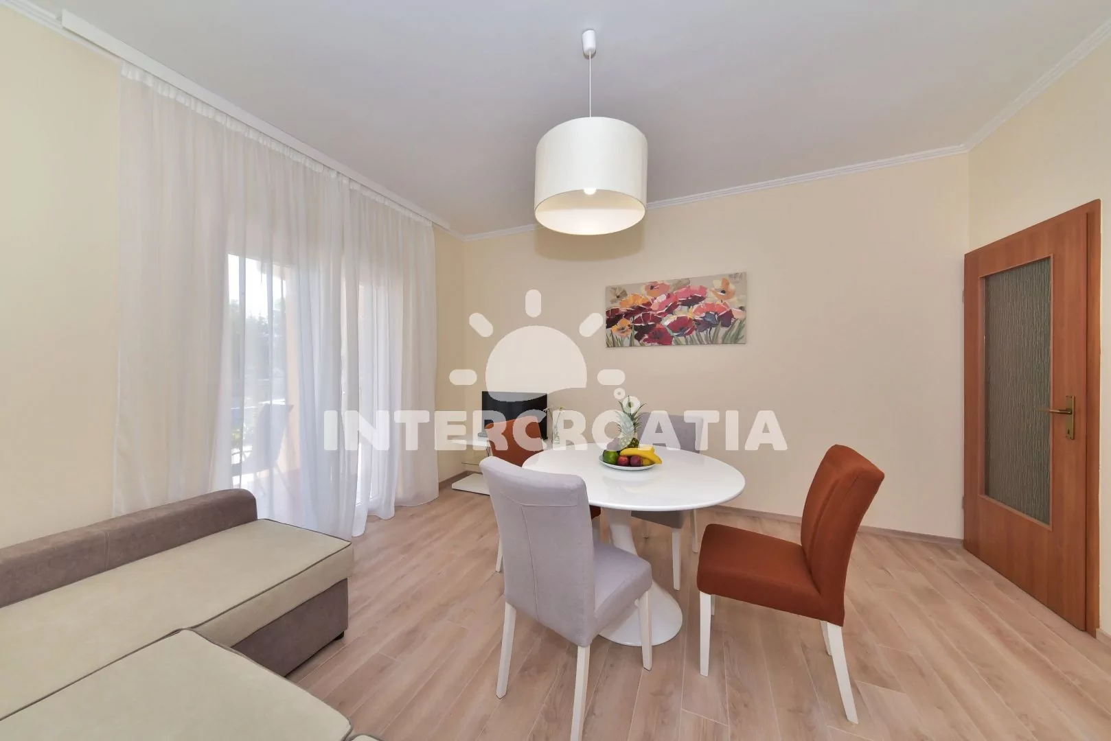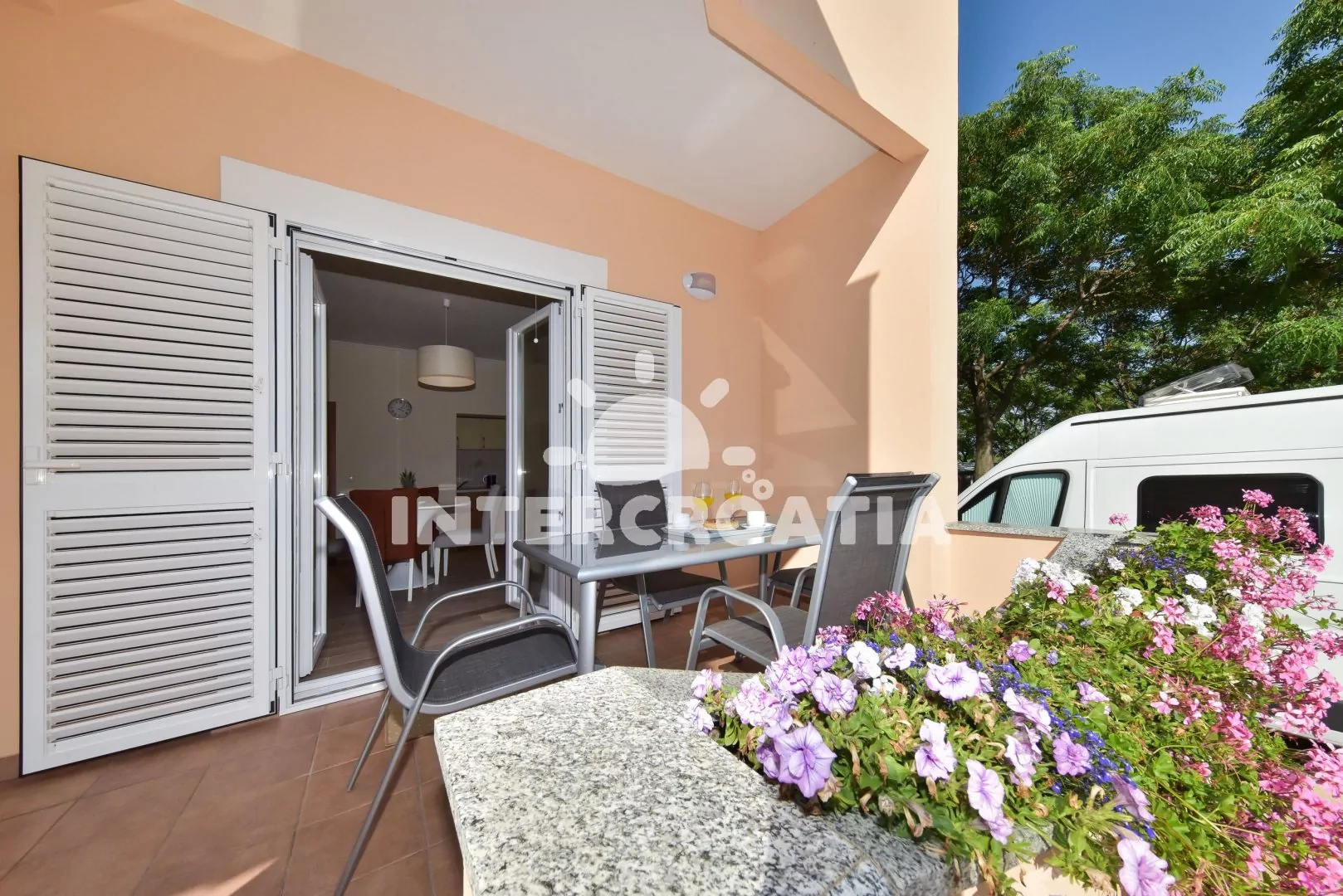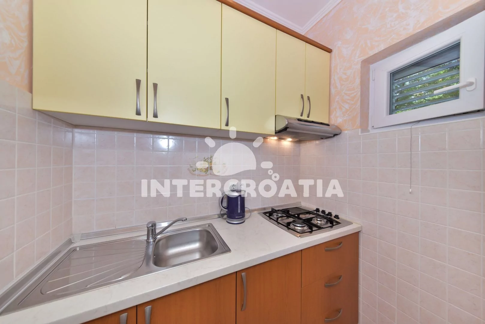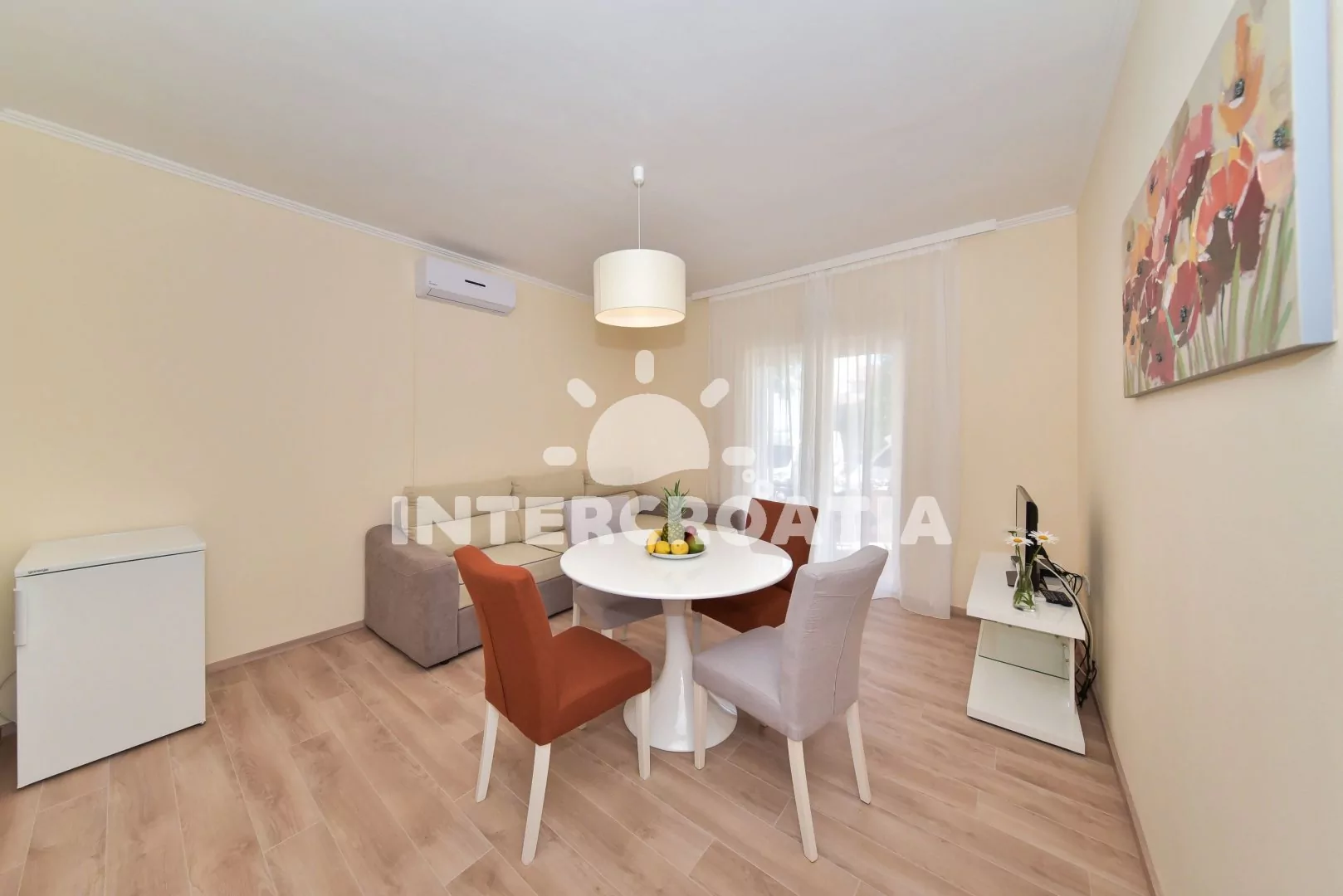 Moderně a vkusně zařízený apartmán s terasou, výhledem na moře a klidné ulice se nachází v přízemí vily a je vhodný pro 2 až 4 osoby. Obývací pokoj je spojený s kuchyní. Kuchyňská linka je vybavena varnou deskou, digestoří, mikrovlnnou troubou, rychlovarnou konvicí, nádobím a lednicí s mrazákem. Obývací pokoj s jídelním stolem pro 4 osoby, rohovou pohovkou (rozložitelná na extra lůžko pro 2 osoby), televizí, klimatizací a vstupem na terasu. Ložnice s jedním dvoulůžkem a vstupem na terasu. Koupelna se sprchovým koutem, umyvadlem, fénem a wc. Hostům je k dispozici parkování u objektu zdarma.
