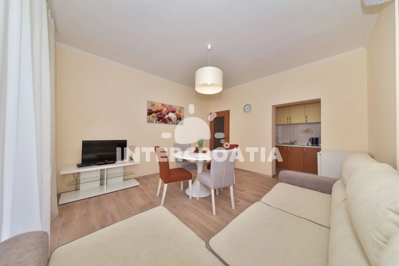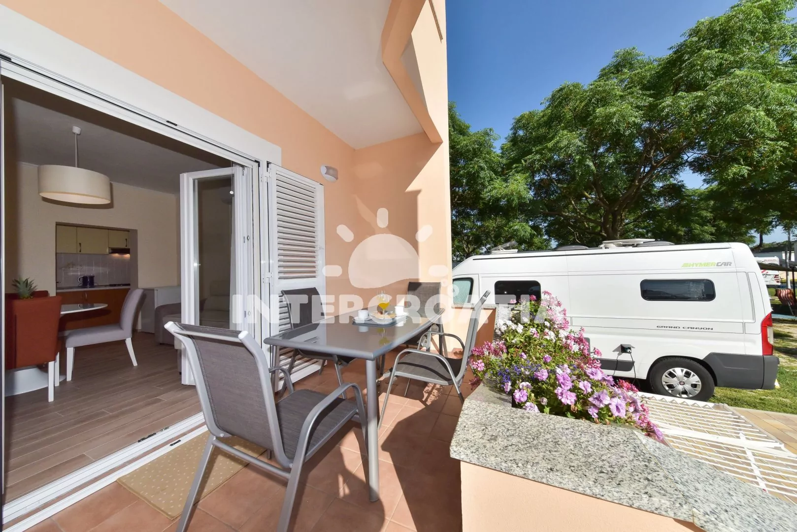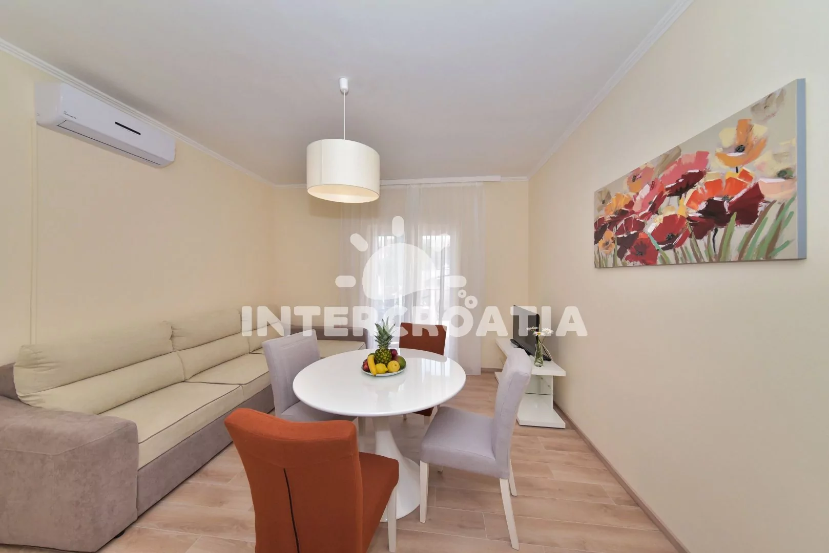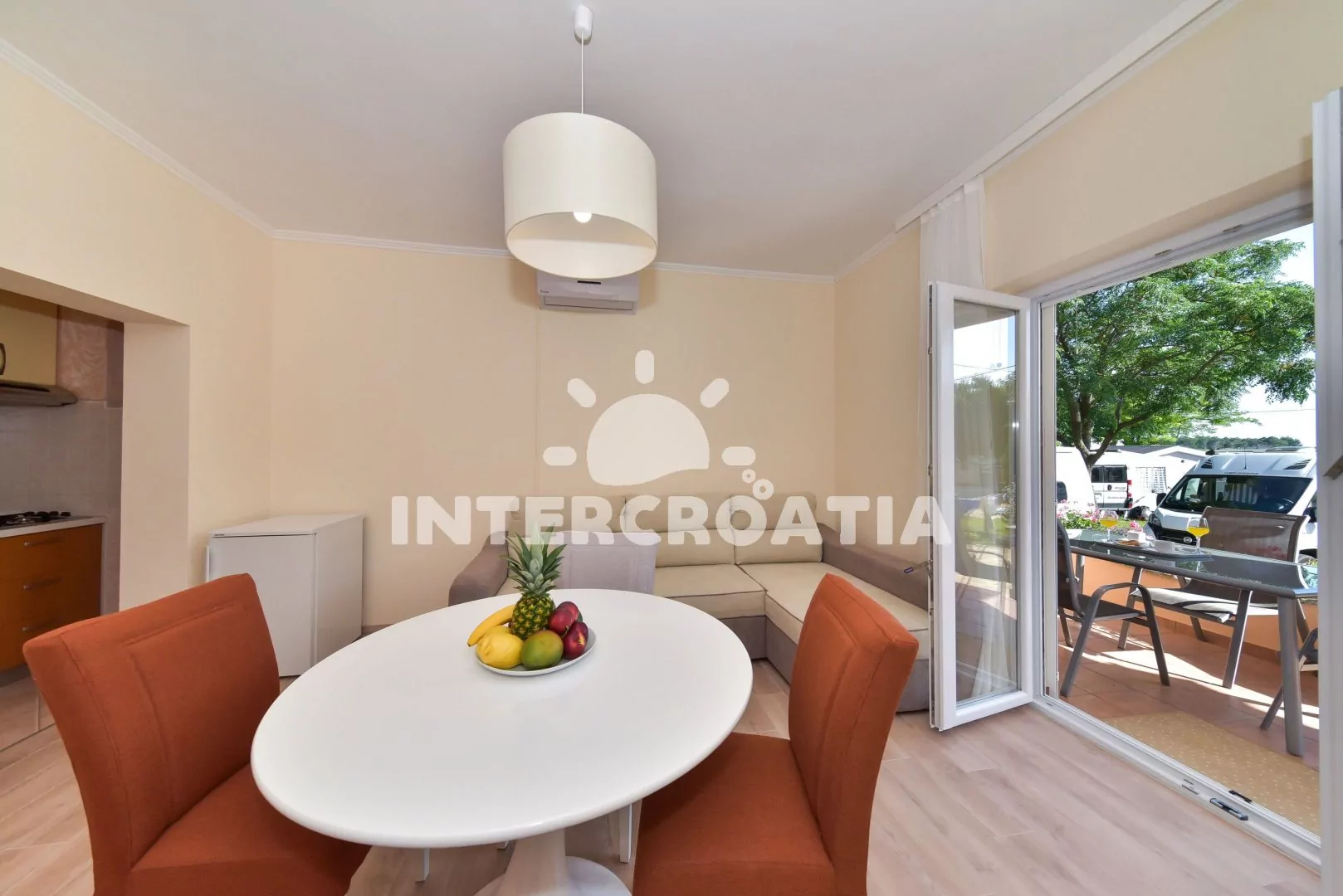 Moderně a vkusně zařízený apartmán s terasou, výhledem na moře a klidné ulice se nachází v přízemí vily a je vhodný pro 2 až 4 osoby. Obývací pokoj je spojený s kuchyní. Kuchyňská linka je vybavena varnou deskou, digestoří, mikrovlnnou troubou, rychlovarnou konvicí, nádobím a lednicí s mrazákem. Obývací pokoj s jídelním stolem pro 4 osoby, rohovou pohovkou (rozložitelná na extra lůžko pro 2 osoby), televizí, klimatizací a vstupem na terasu. Ložnice s jedním dvoulůžkem a vstupem na terasu. Koupelna se sprchovým koutem, umyvadlem, fénem a wc. Hostům je k dispozici parkování u objektu zdarma.
