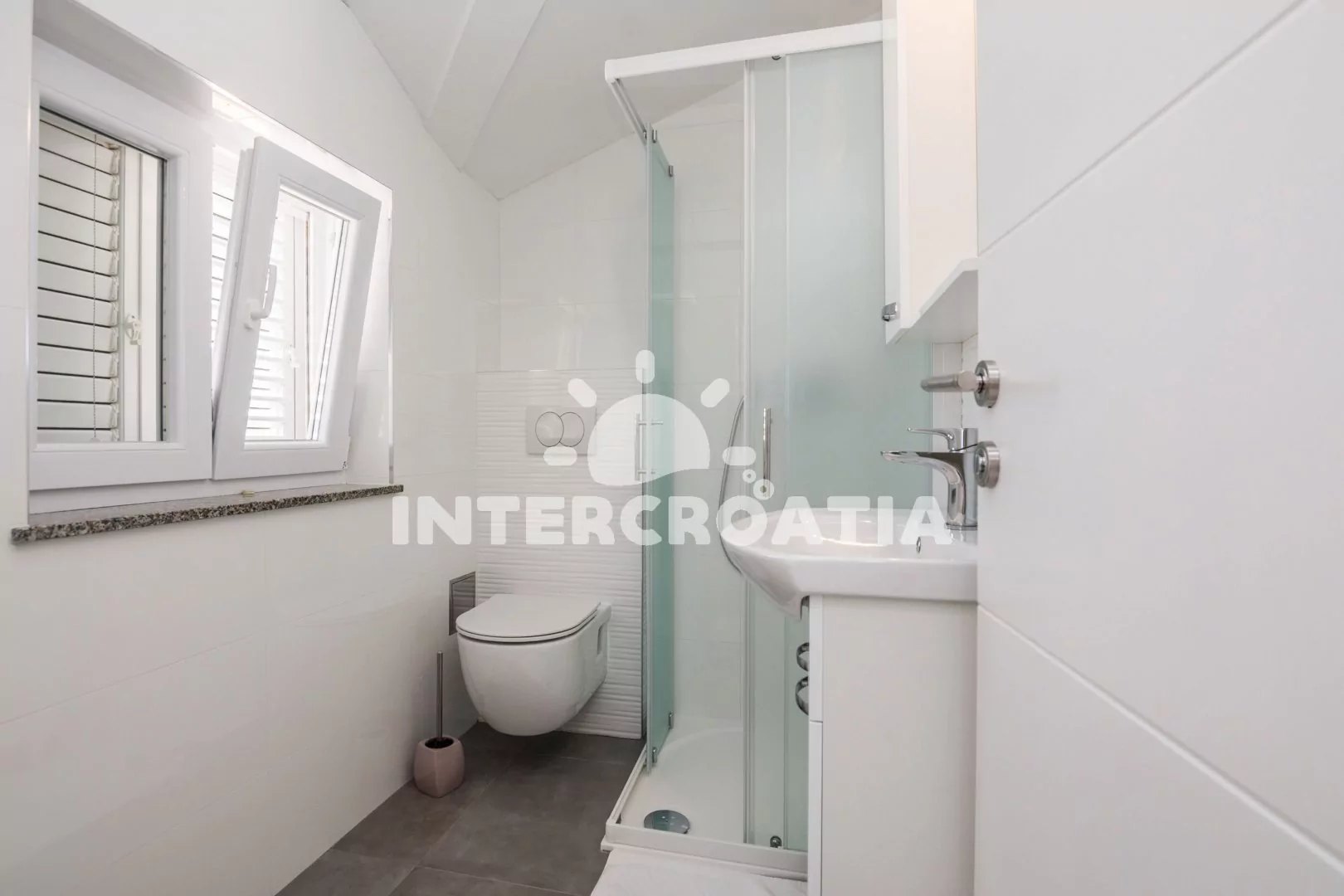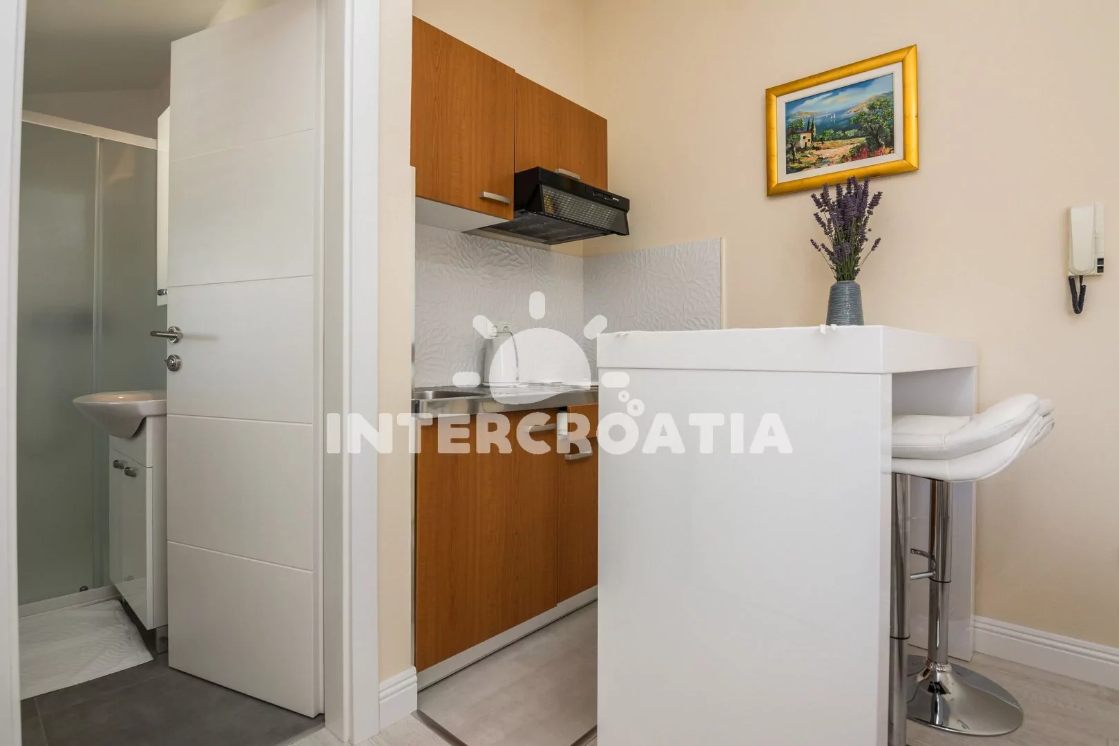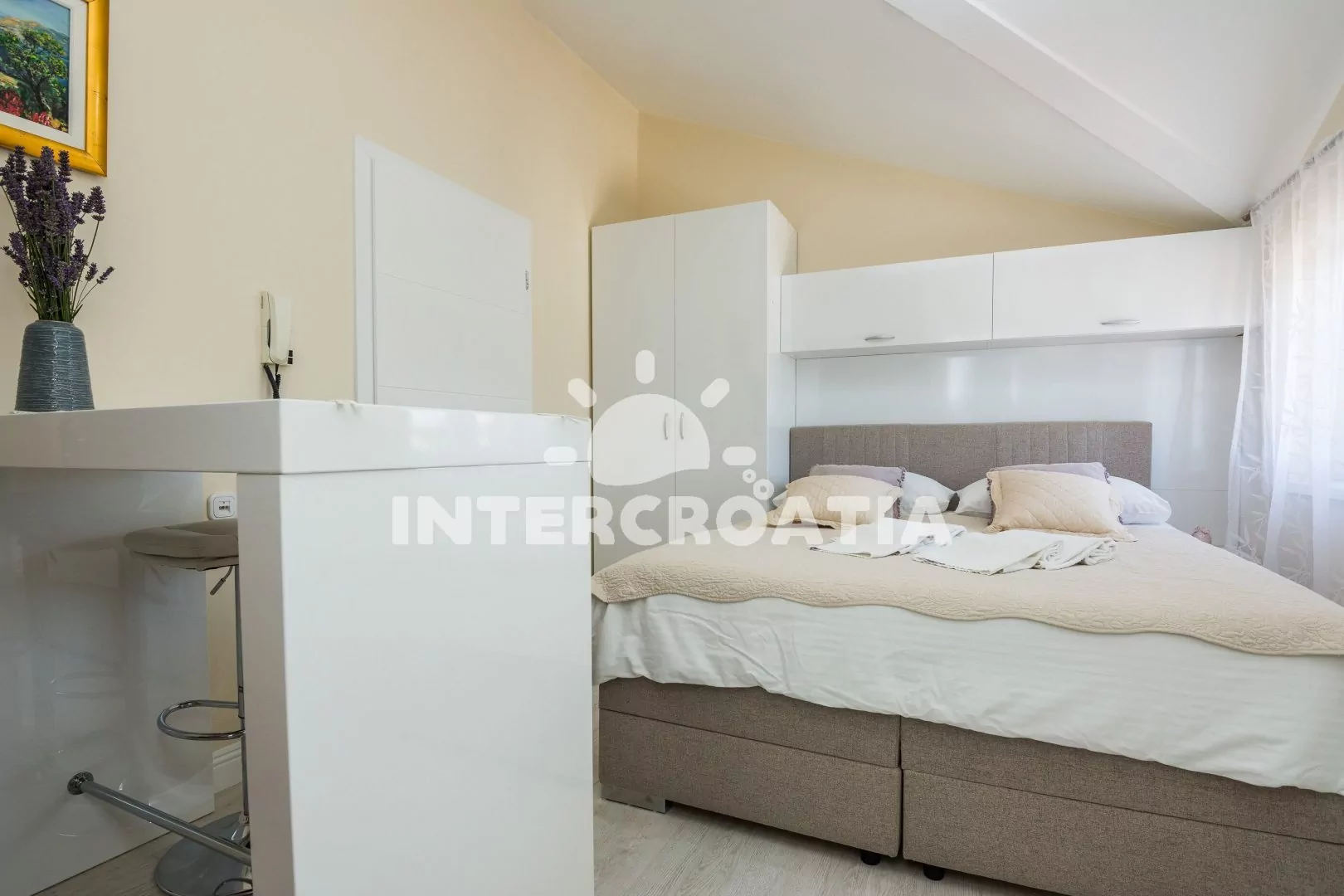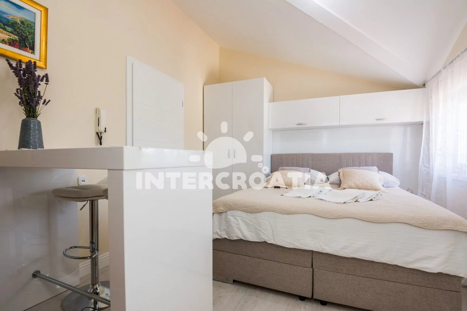Podkrovní apartmán typu studio s terasou a výhledem na moře je vhodný pro 2 osoby. Kuchyňská linka je vybavena dvouplotýnkovým sporákem, digestoří, mikrovlnnou troubou, rychlovarnou konvicí, kávovarem, nádobím a lednicí s mrazákem. Obývací místnost s jídelním stolem pro 2 osoby, televizí, klimatizací a jedním dvoulůžkem. Koupelna se sprchovým koutem, umyvadlem, fénem a wc. Hostům je k dispozici parkování u objektu zdarma.