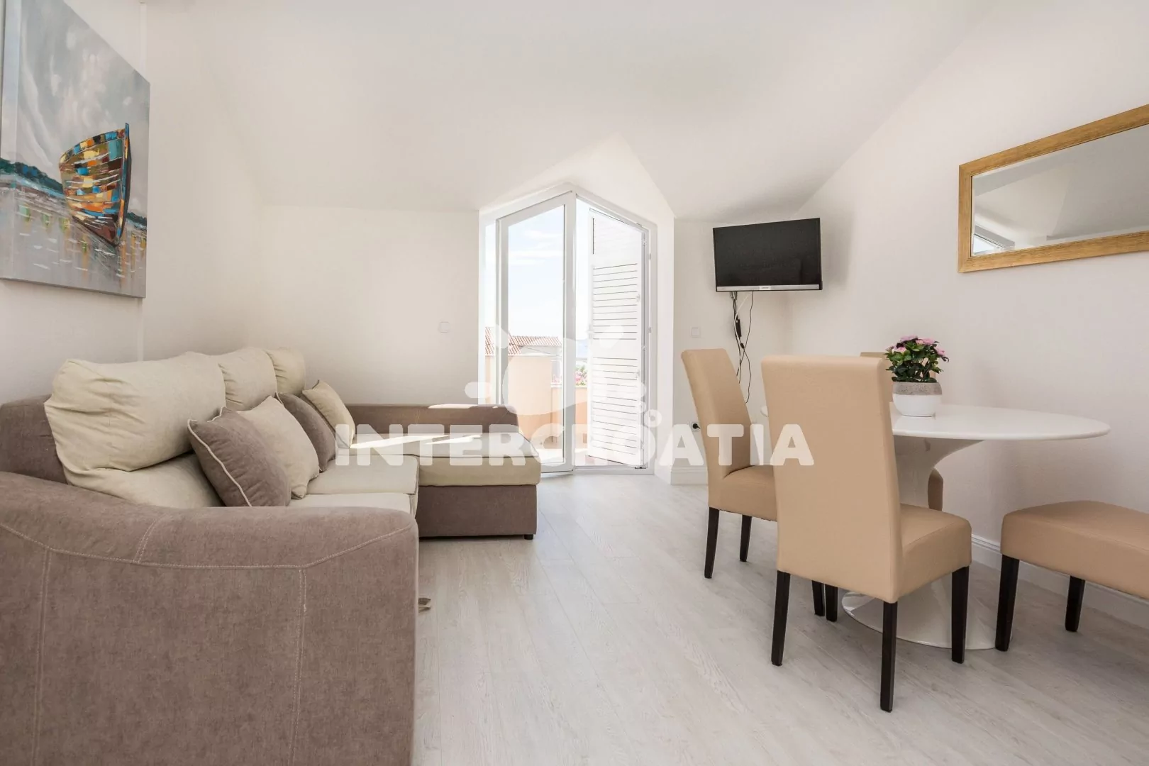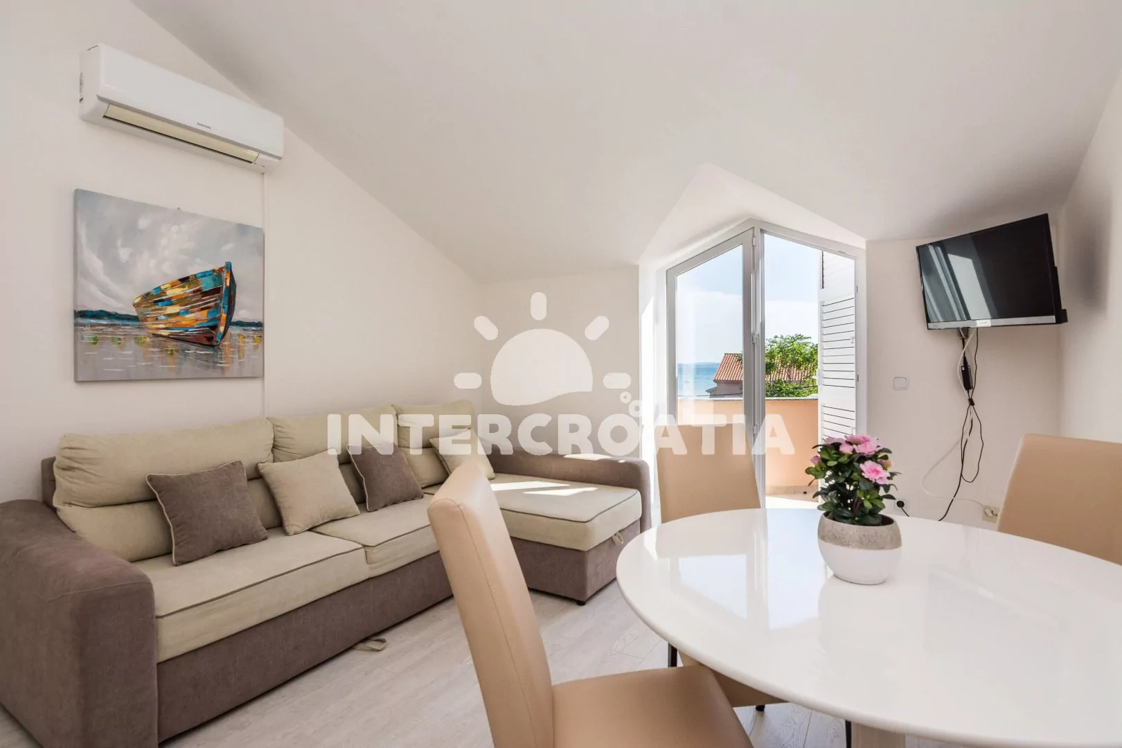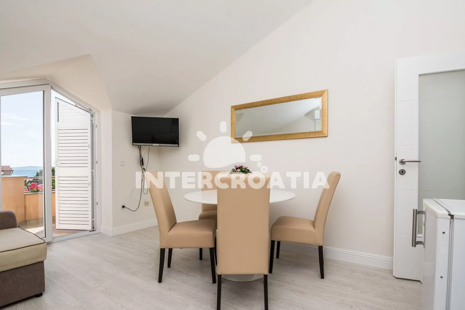 Vkusně zařízený podkrovní apartmán s terasou a výhledem na moře je vhodný pro 2 až 4 osoby. Obývací pokoj je spojený s kuchyní. Kuchyňská linka je vybavena varnou deskou, digestoří, mikrovlnnou…