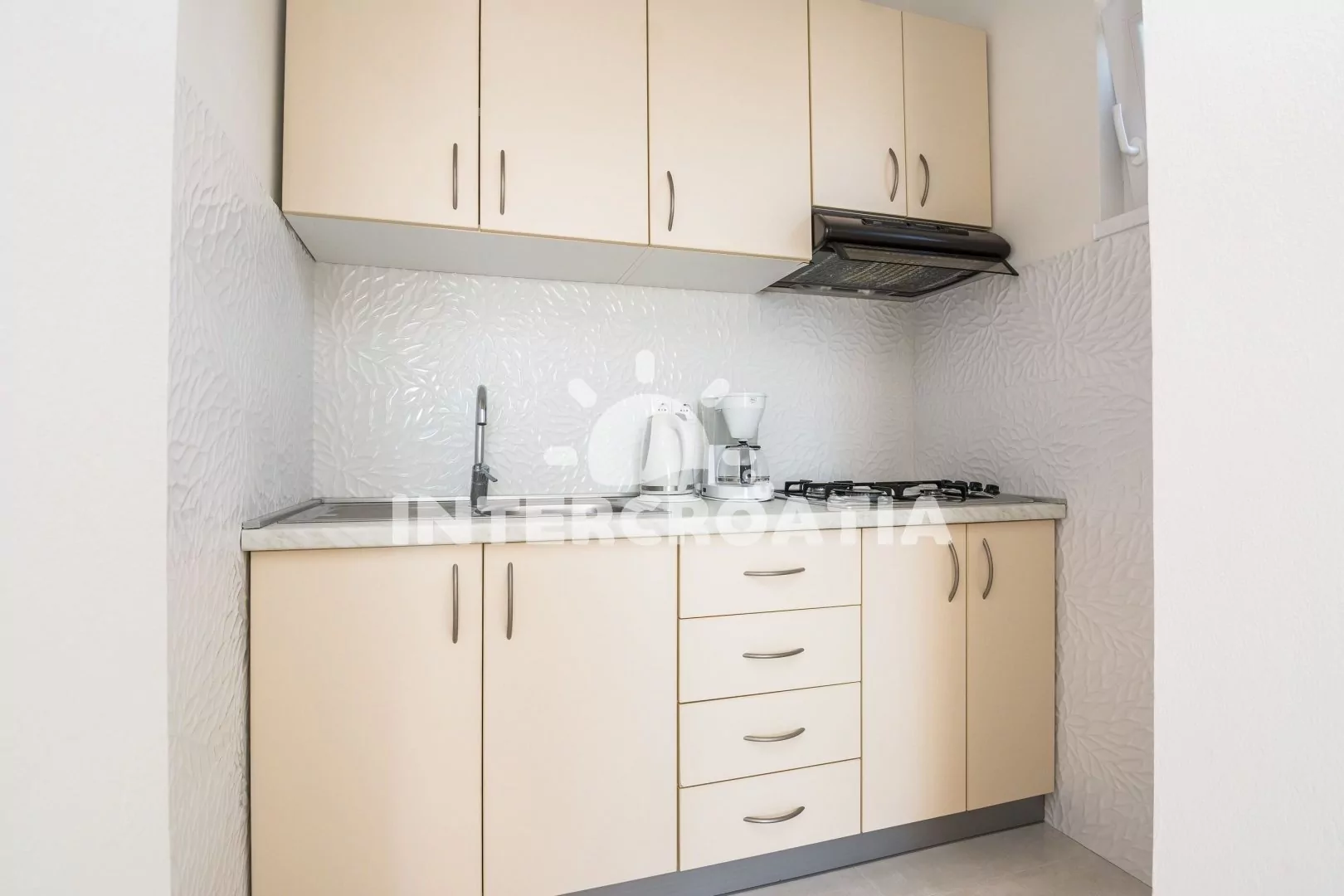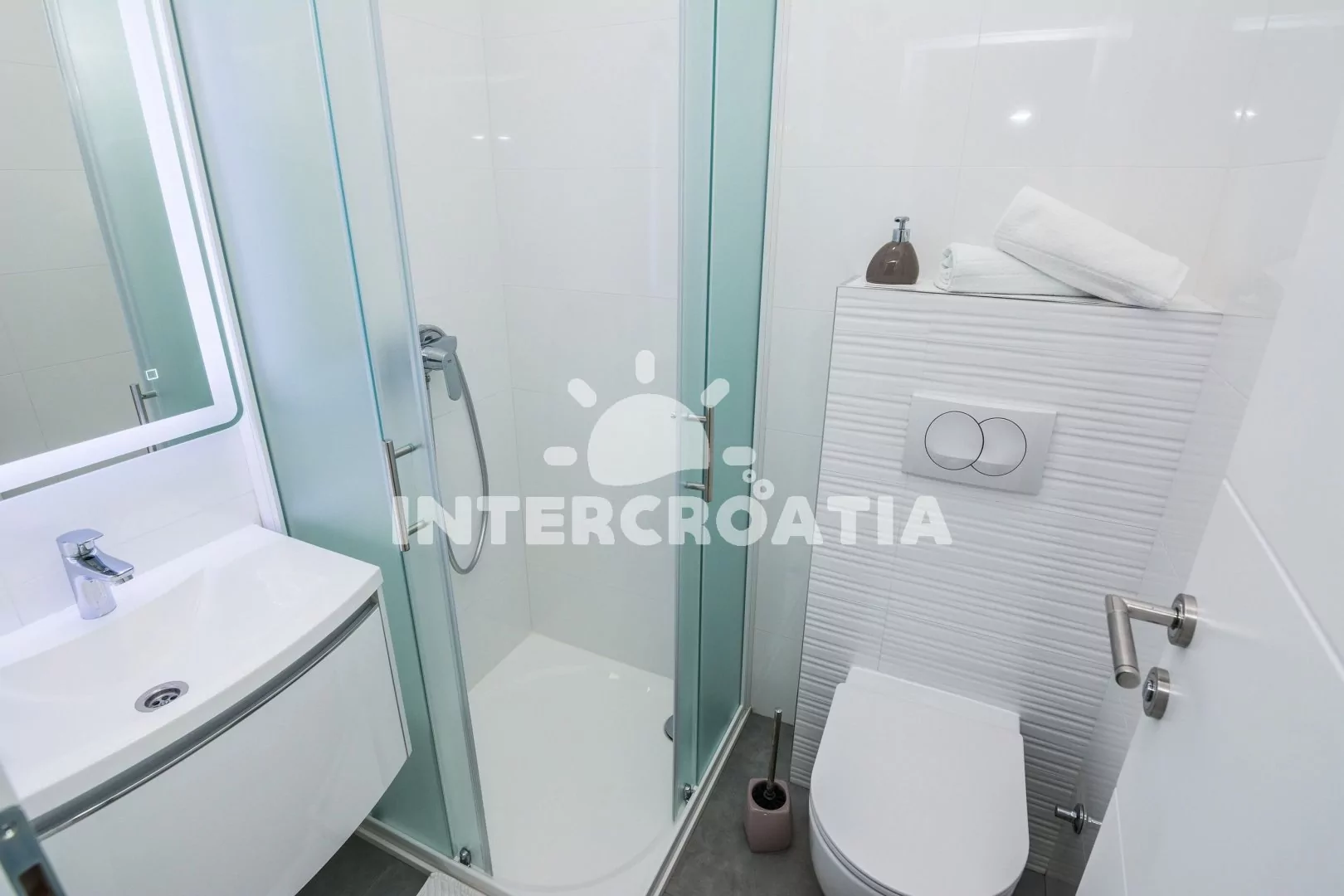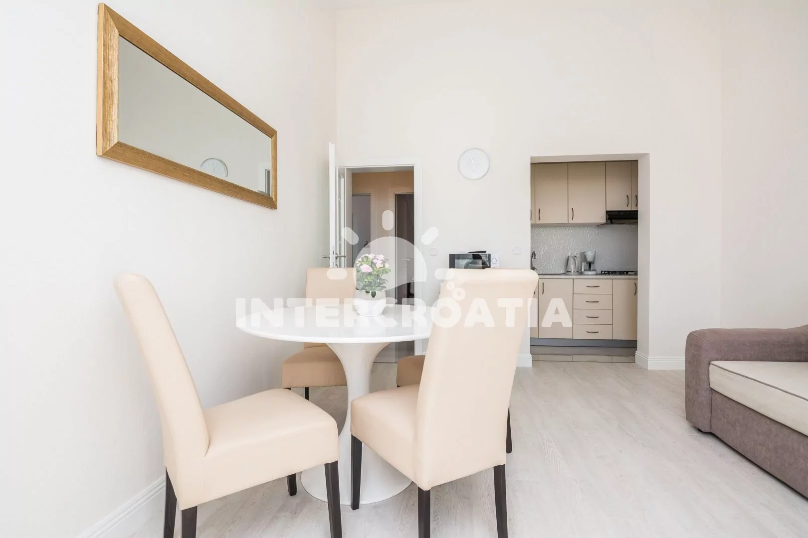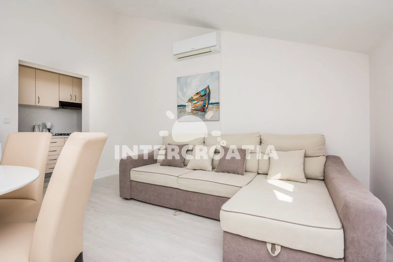 Vkusně zařízený podkrovní apartmán s terasou a výhledem na moře je vhodný pro 2 až 4 osoby. Obývací pokoj je spojený s kuchyní. Kuchyňská linka je vybavena varnou deskou, digestoří, mikrovlnnou…