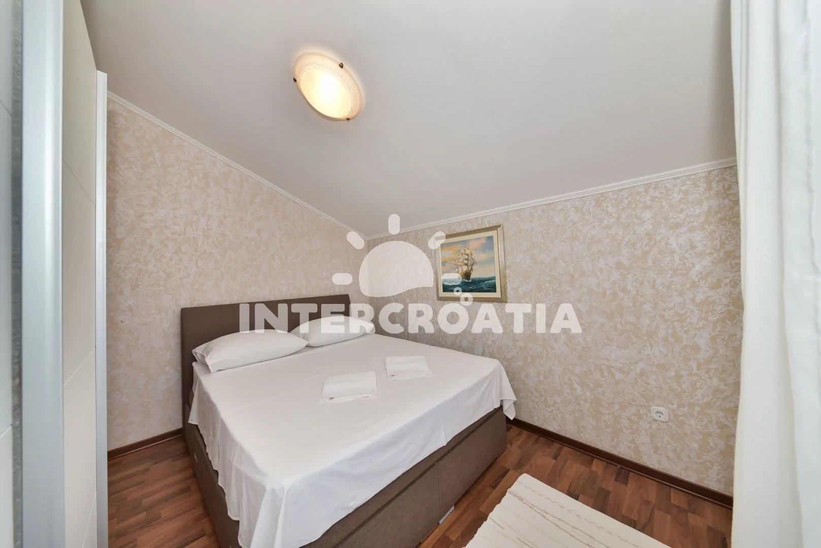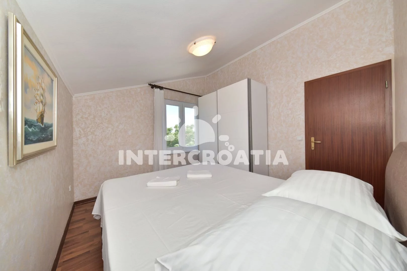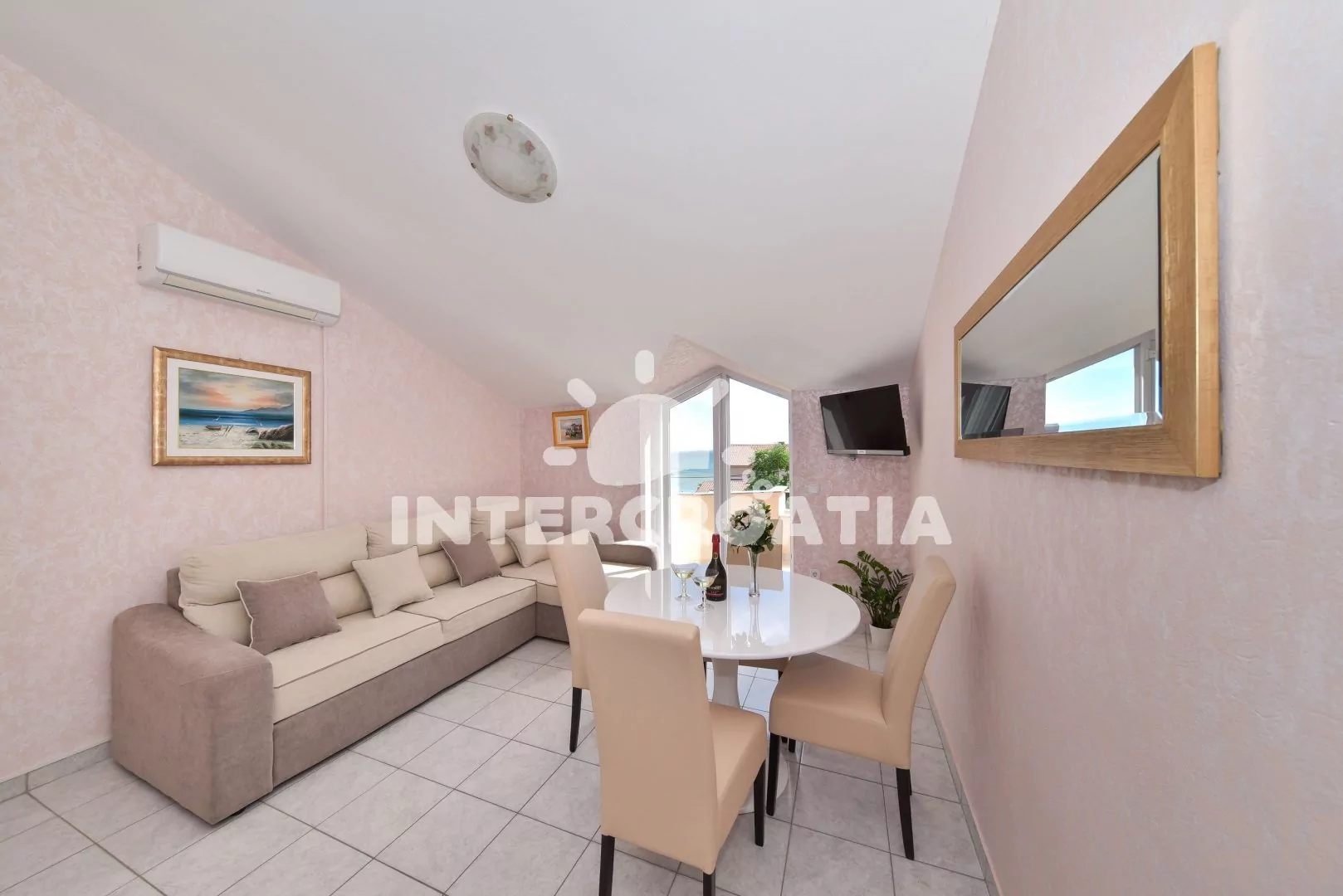 Vkusně zařízený podkrovní apartmán s terasou a výhledem na moře je vhodný pro 2 až 4 osoby. Obývací pokoj je spojený s kuchyní. Kuchyňská linka je vybavena varnou deskou, digestoří, mikrovlnnou troubou, rychlovarnou konvicí, kávovarem, nádobím a lednicí s mrazákem. Obývací pokoj s jídelním stolem pro 4 osoby, rohovou pohovkou (rozložitelná na extra lůžko pro 2 osoby), televizí, klimatizací a vstupem na terasu. Ložnice s jedním dvoulůžkem. Koupelna se sprchovým koutem, umyvadlem, fénem a wc. Hostům je k dispozici parkování u objektu zdarma.