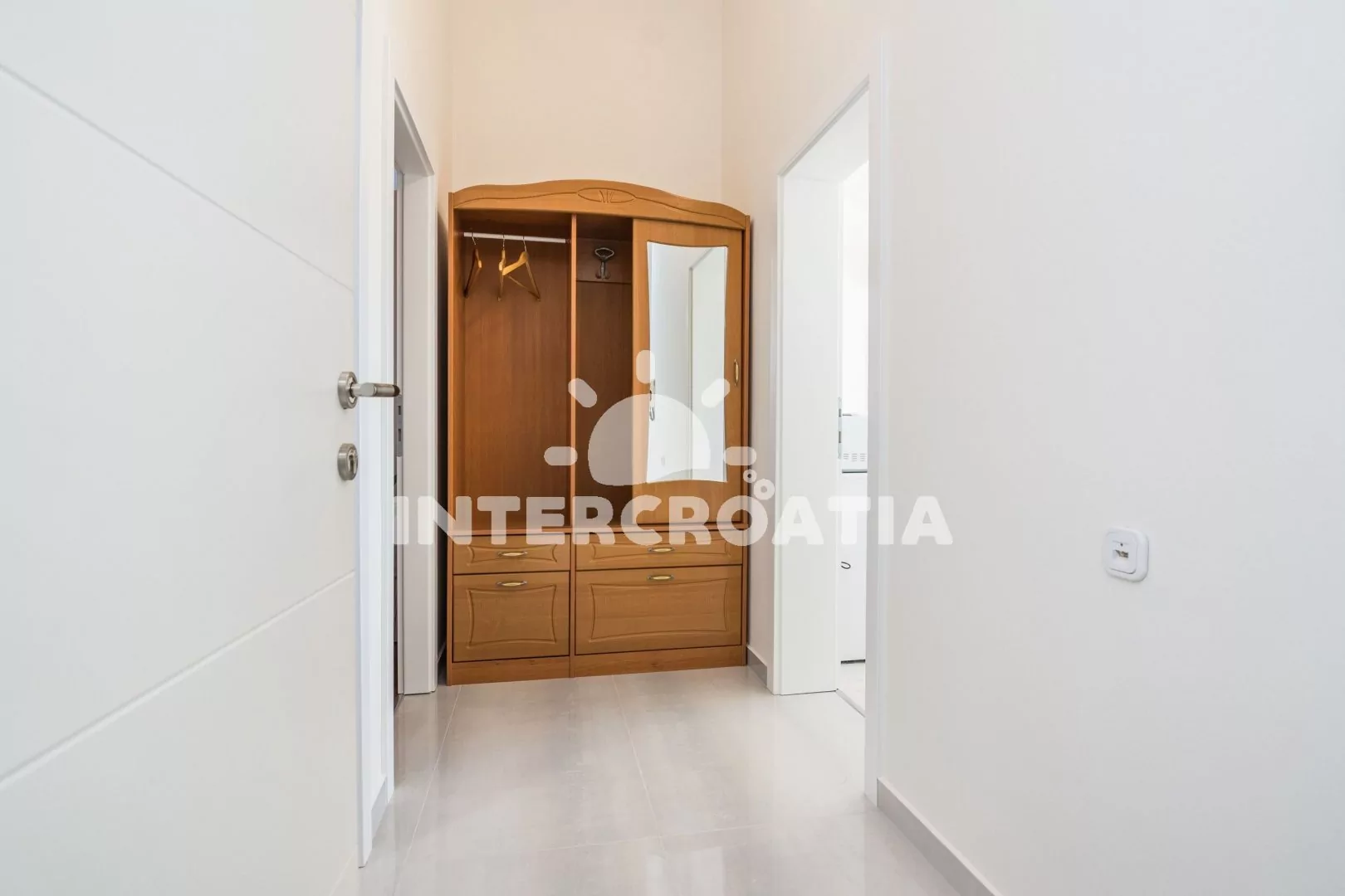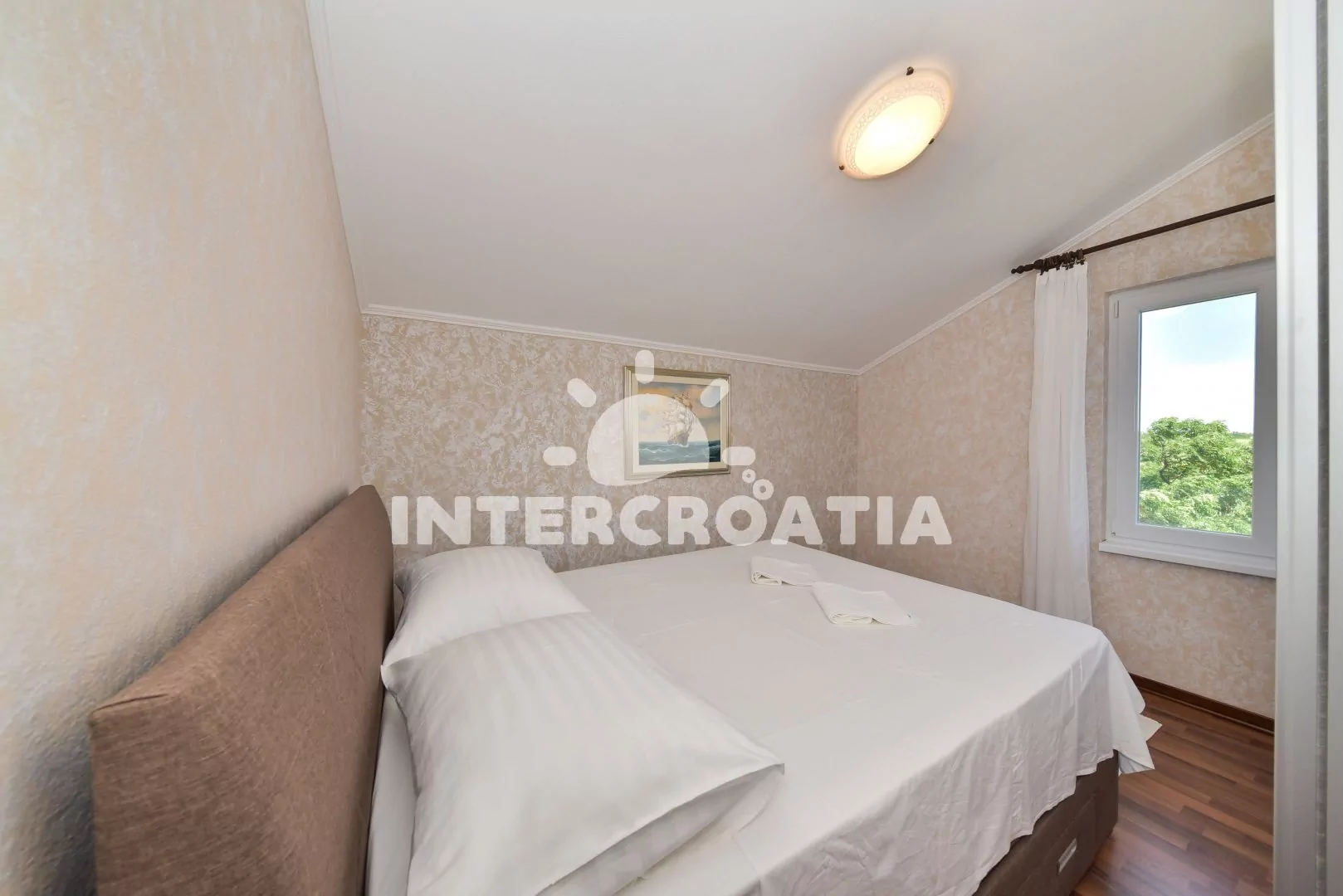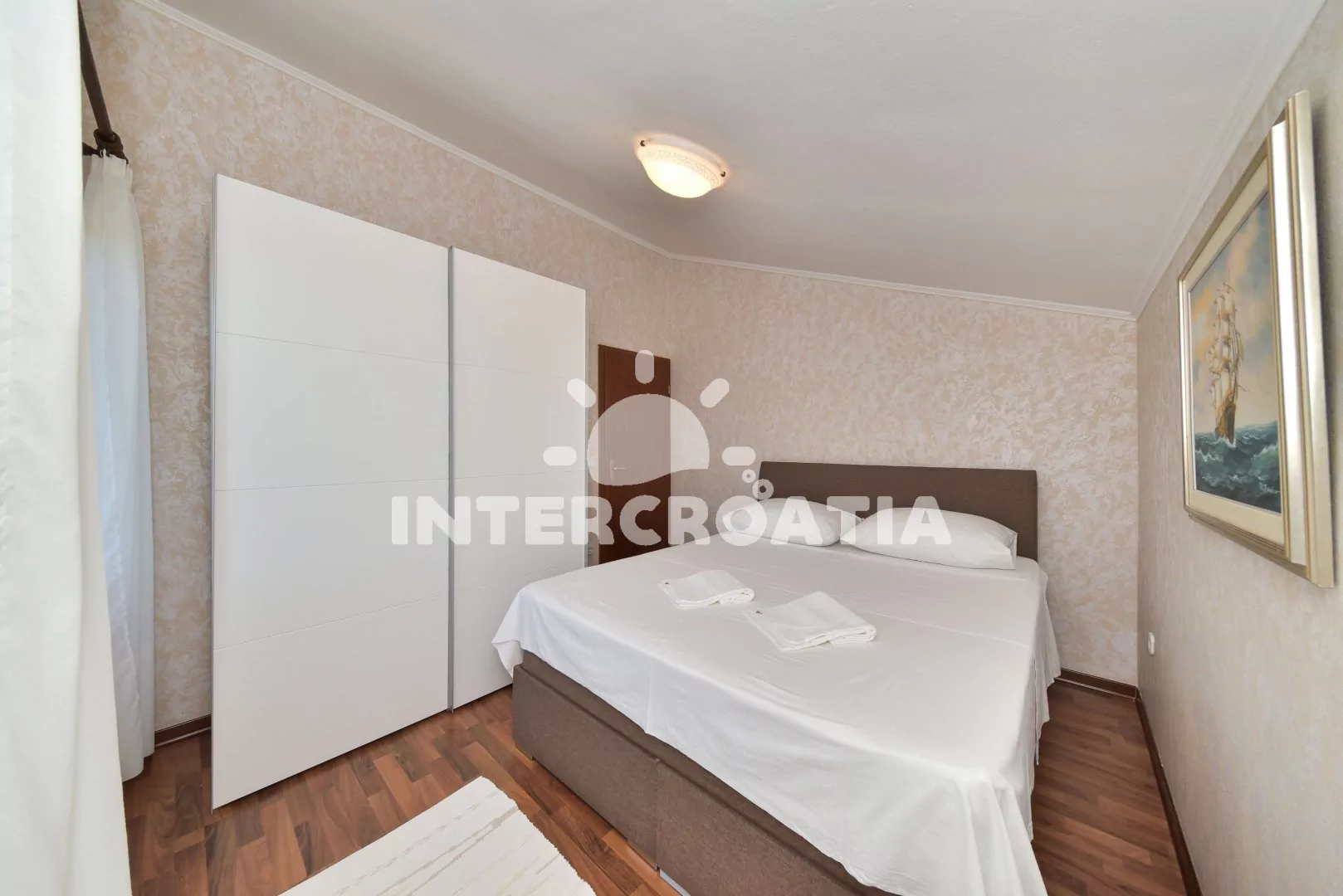 Vkusně zařízený podkrovní apartmán s terasou a výhledem na moře je vhodný pro 2 až 4 osoby. Obývací pokoj je spojený s kuchyní. Kuchyňská linka je vybavena varnou deskou, digestoří, mikrovlnnou troubou, rychlovarnou konvicí, kávovarem, nádobím a lednicí s mrazákem. Obývací pokoj s jídelním stolem pro 4 osoby, rohovou pohovkou (rozložitelná na extra lůžko pro 2 osoby), televizí, klimatizací a vstupem na terasu. Ložnice s jedním dvoulůžkem. Koupelna se sprchovým koutem, umyvadlem, fénem a wc. Hostům je k dispozici parkování u objektu zdarma.