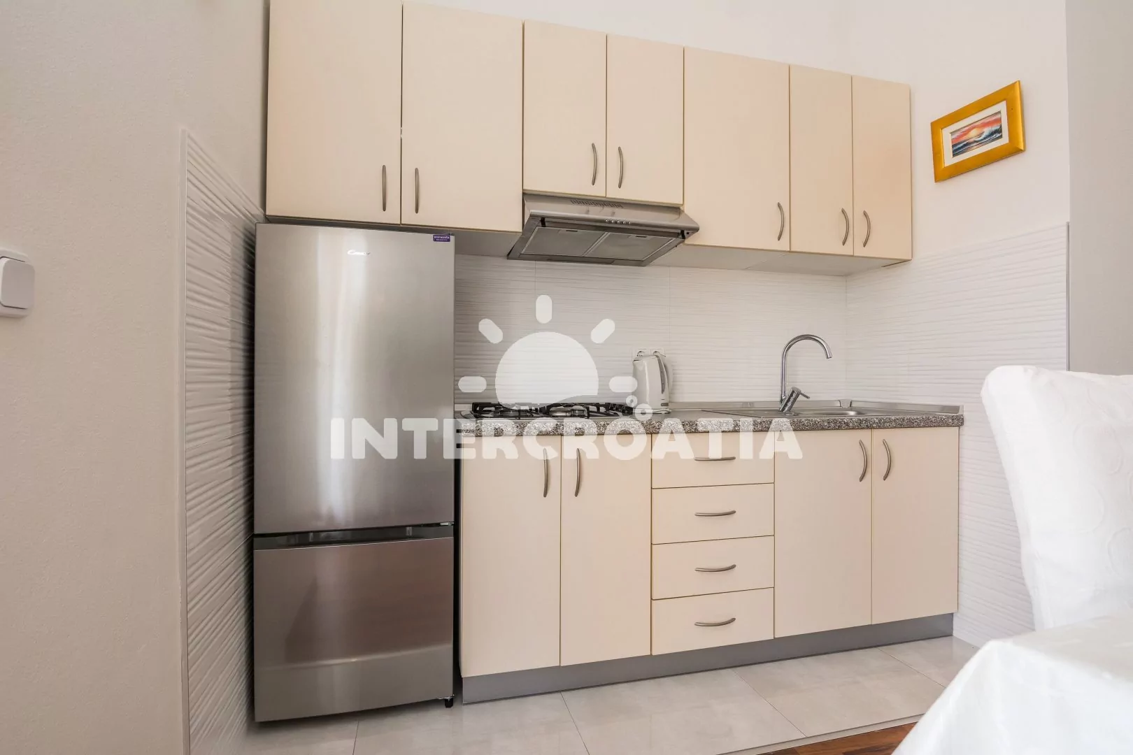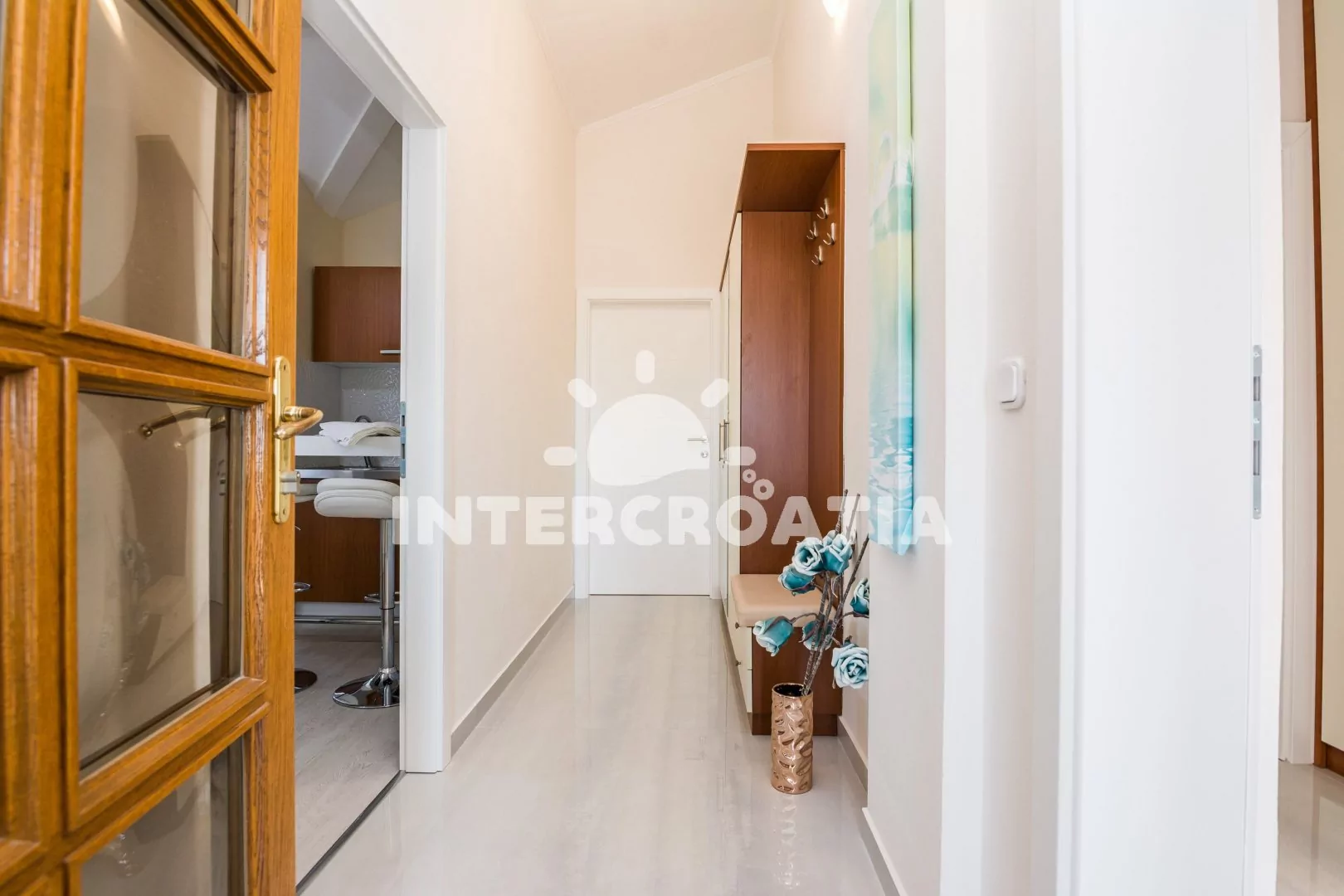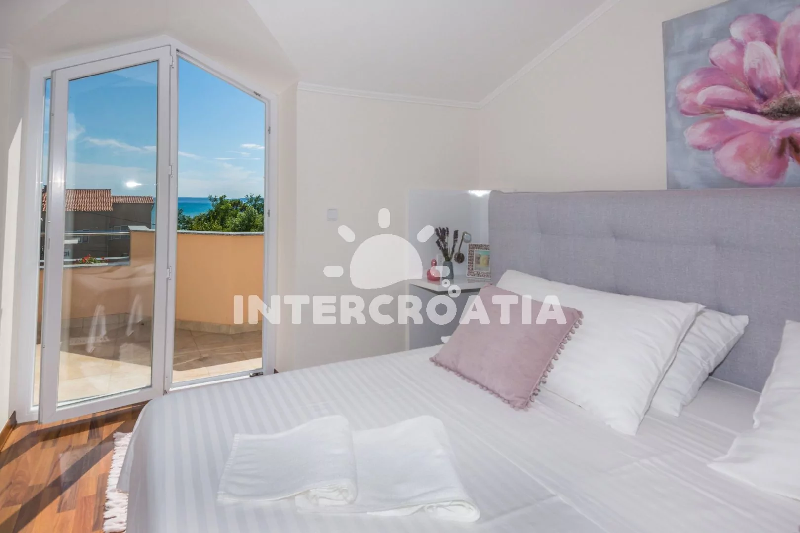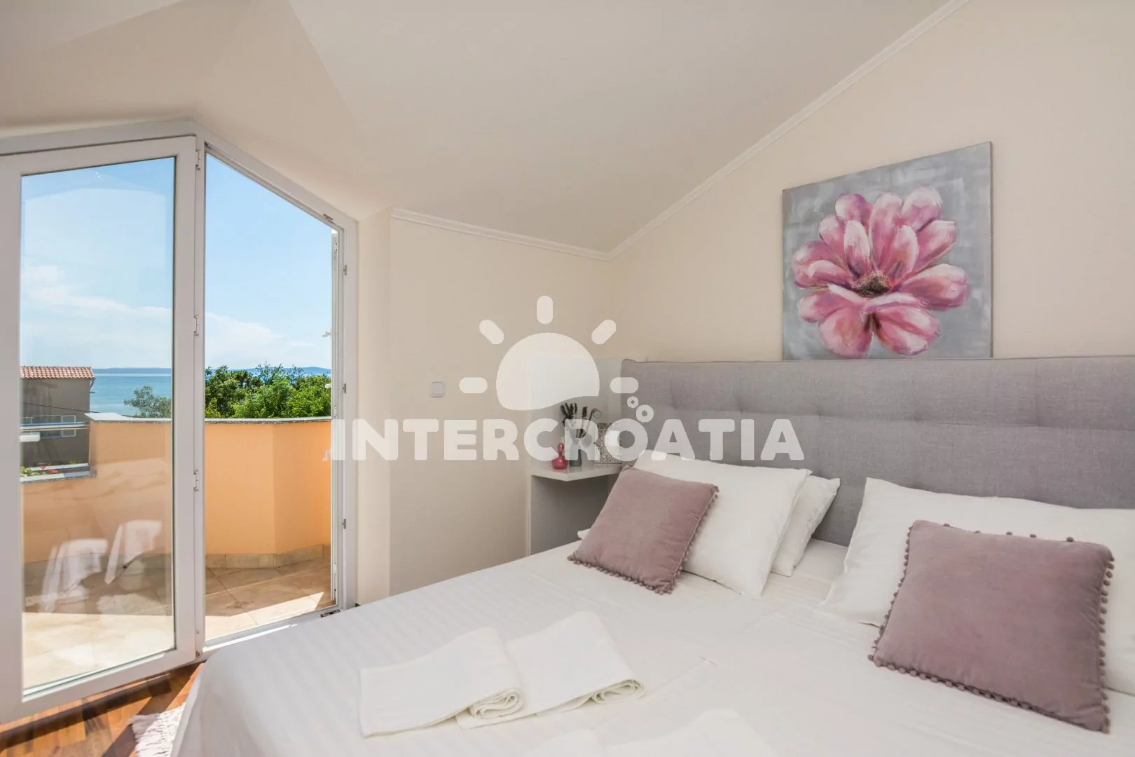 Moderně zařízený podkrovní apartmán s terasou a výhledem na moře je vhodný pro 2 až 4 osoby. Obývací pokoj je spojený s kuchyní. Kuchyňská linka je vybavena varnou deskou, digestoří, mikrovlnnou troubou, rychlovarnou konvicí, kávovarem, nádobím a lednicí s mrazákem. Obývací pokoj s jídelním stolem pro 4 osoby, rohovou pohovkou (rozložitelná na extra lůžko pro 2 osoby), televizí, klimatizací a vstupem na terasu. Ložnice s jedním dvoulůžkem. Koupelna se sprchovým koutem, umyvadlem, fénem a wc. Hostům je k dispozici parkování u objektu zdarma.