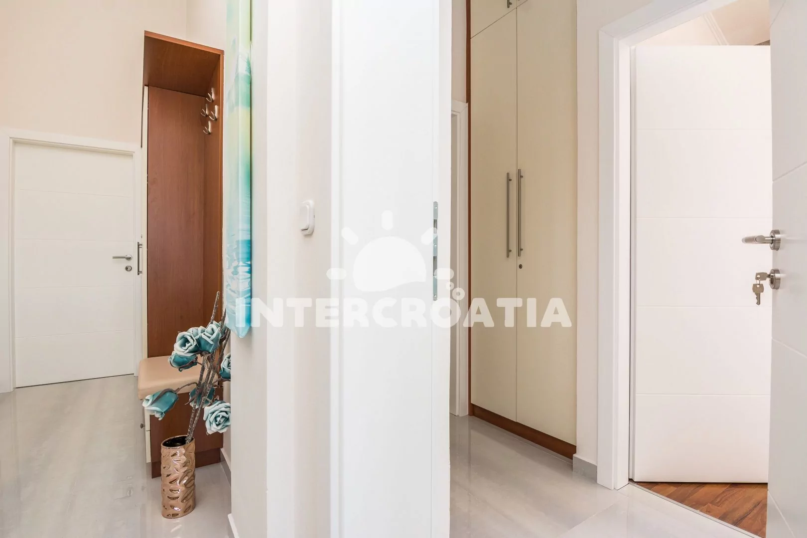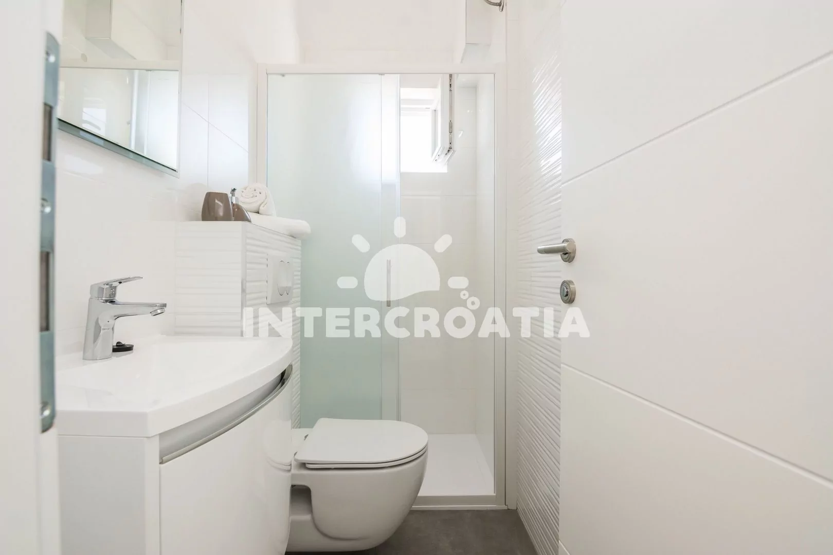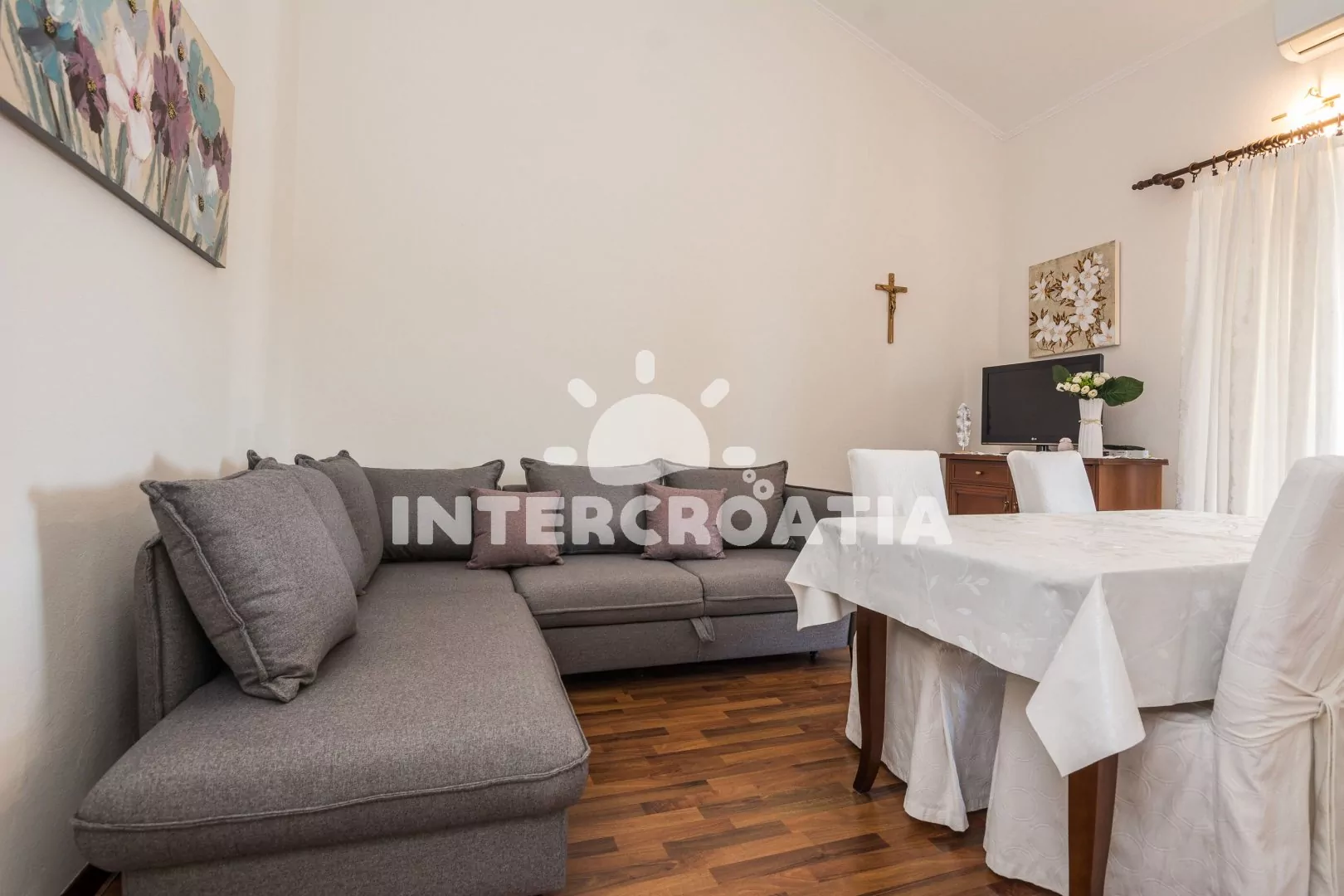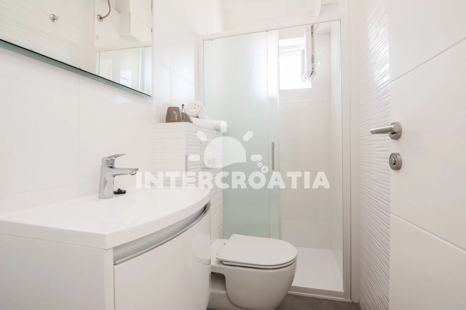 Moderně zařízený podkrovní apartmán s terasou a výhledem na moře je vhodný pro 2 až 4 osoby. Obývací pokoj je spojený s kuchyní. Kuchyňská linka je vybavena varnou deskou, digestoří, mikrovlnnou troubou, rychlovarnou konvicí, kávovarem, nádobím a lednicí s mrazákem. Obývací pokoj s jídelním stolem pro 4 osoby, rohovou pohovkou (rozložitelná na extra lůžko pro 2 osoby), televizí, klimatizací a vstupem na terasu. Ložnice s jedním dvoulůžkem. Koupelna se sprchovým koutem, umyvadlem, fénem a wc. Hostům je k dispozici parkování u objektu zdarma.