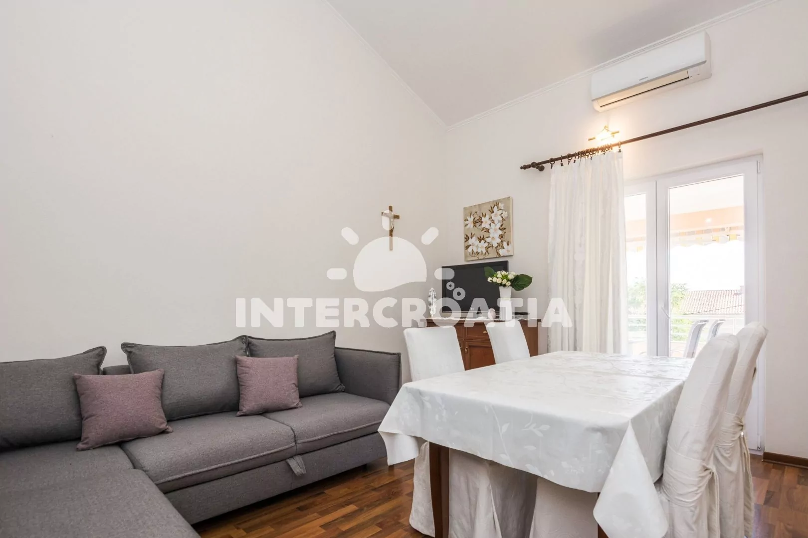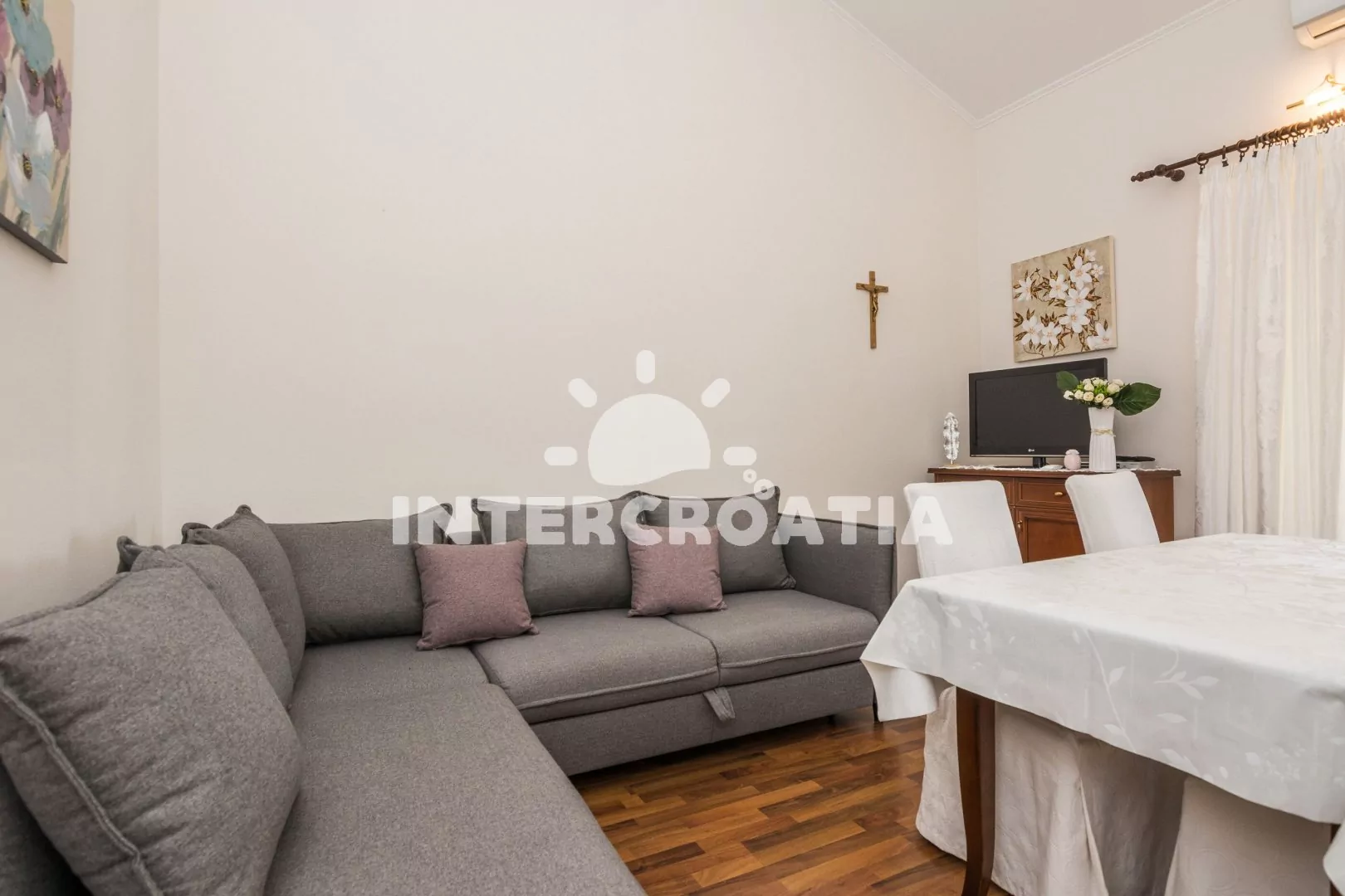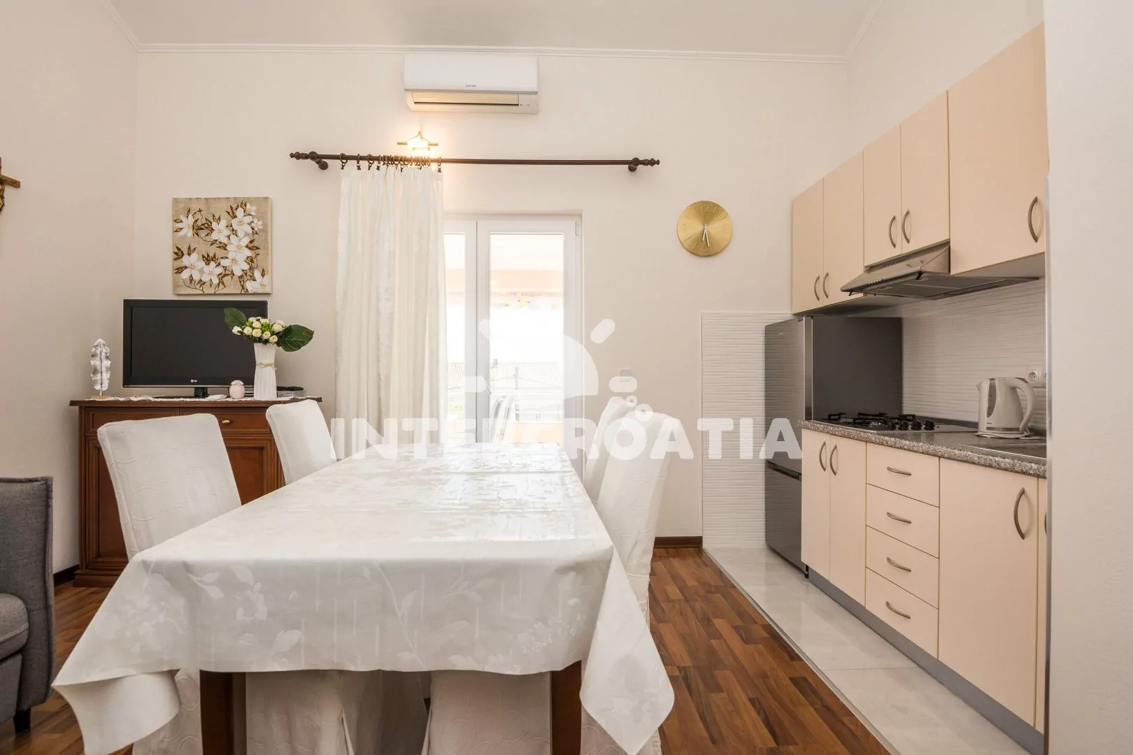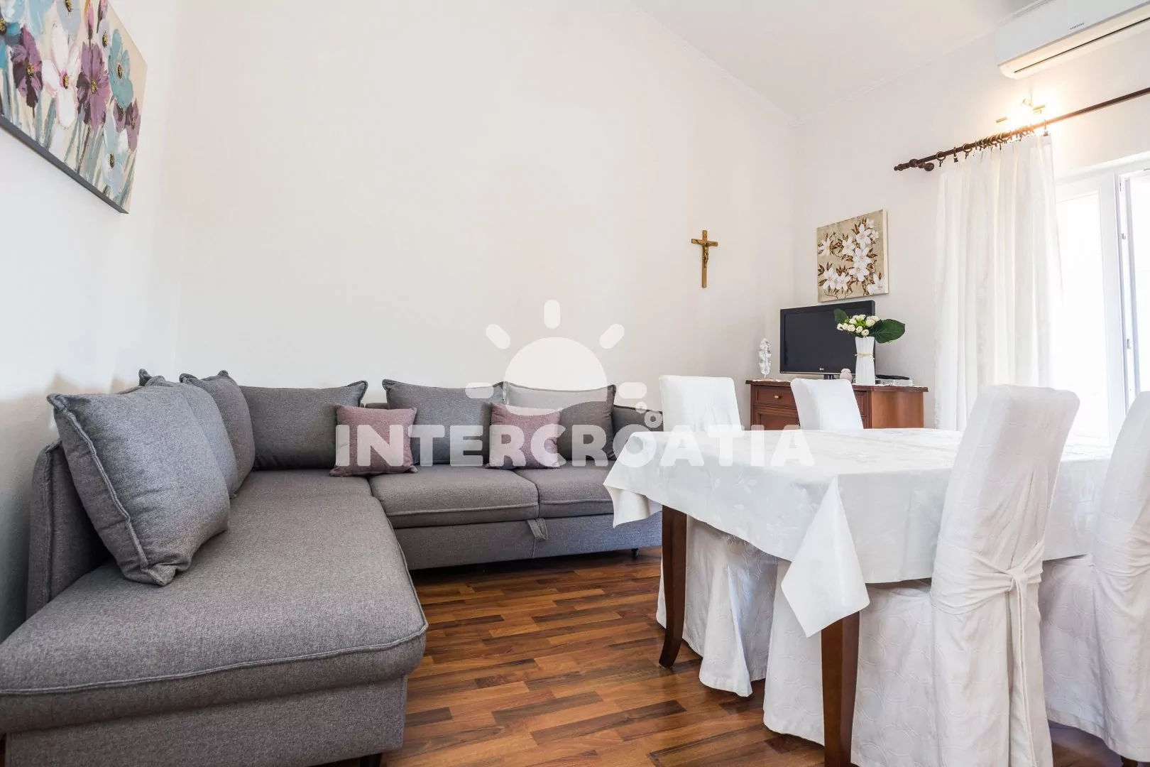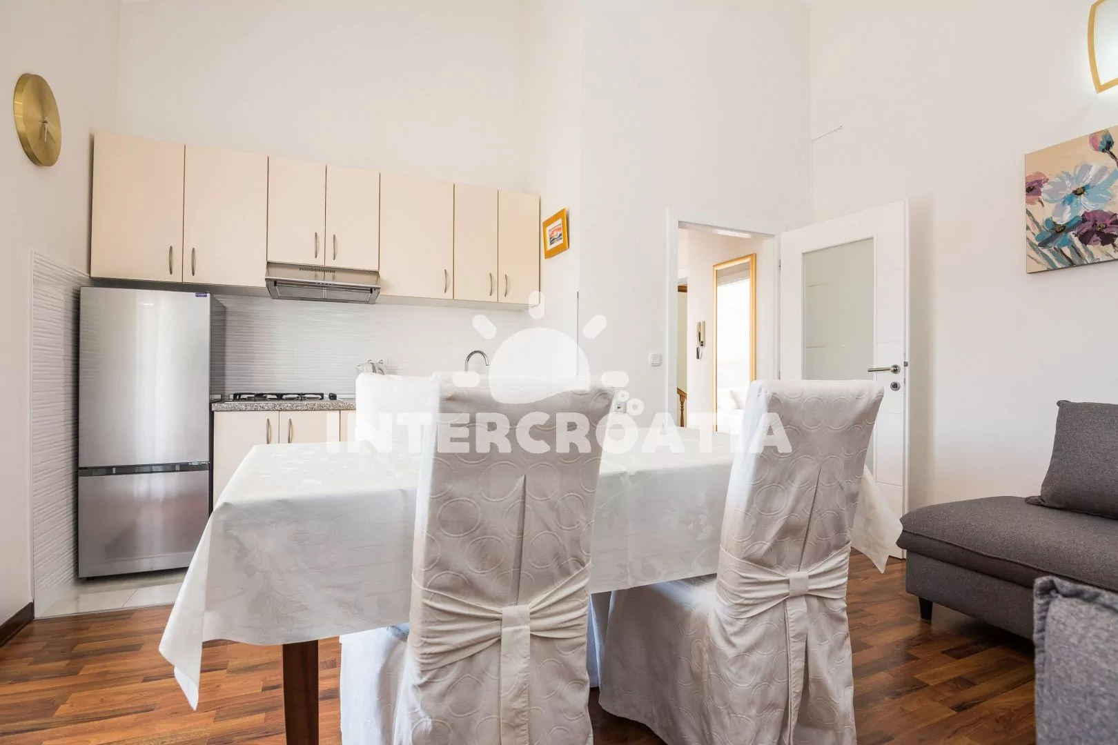 Moderně zařízený podkrovní apartmán s terasou a výhledem na moře je vhodný pro 2 až 4 osoby. Obývací pokoj je spojený s kuchyní. Kuchyňská linka je vybavena varnou deskou, digestoří, mikrovlnnou…