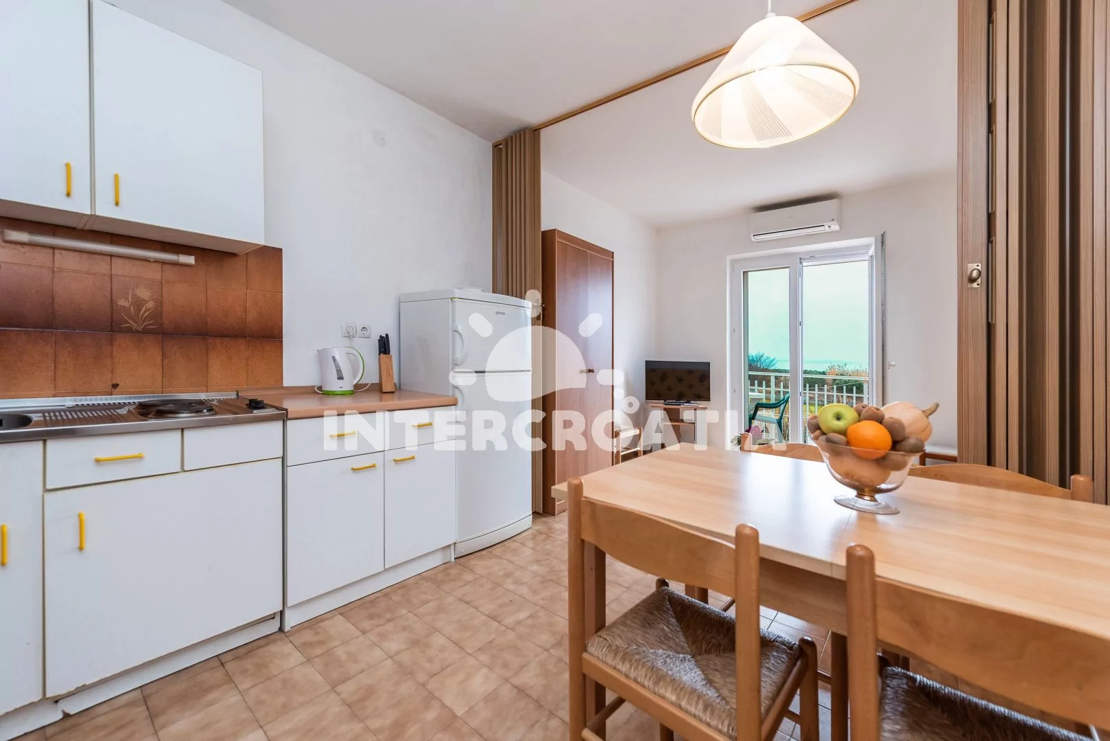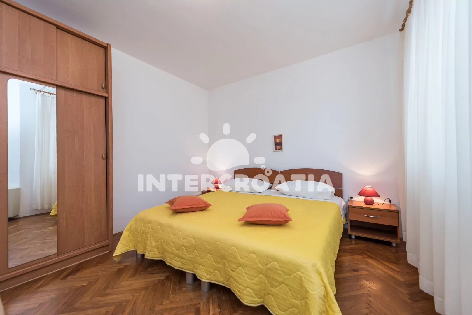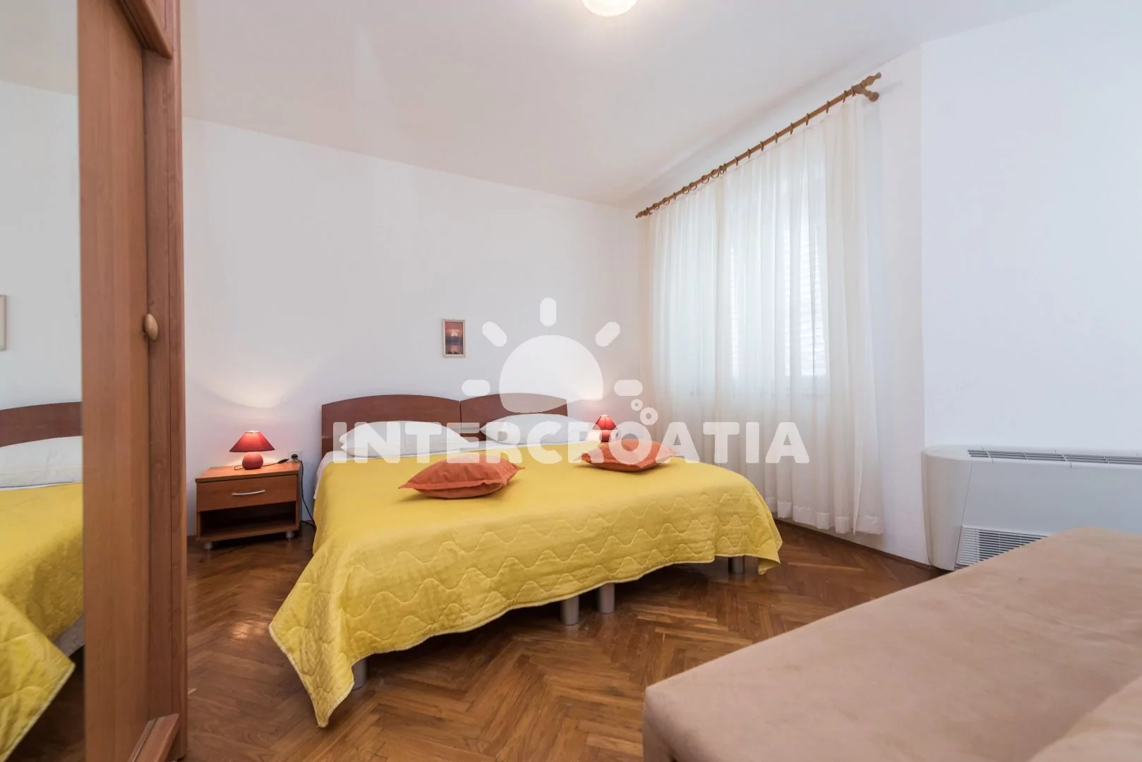 Apartmán (40 m2) s balkonem a výhledem na moře se nachází v 1. patře vily a je vhodný pro 2 až 4 osoby. Obývací pokoj je spojený s kuchyní. Kuchyňská linka je vybavena dvouplotýnkovým vařičem, rychlovarnou konvicí, nádobím a lednicí s mrazákem. Obývací pokoj s jídelním stolem pro 4 osoby, pohovkou (rozložitelná na extra lůžko pro 2 osoby), televizí se satelitním programem, klimatizací a vstupem na balkon. Ložnice s dvoulůžkem a vstupem na balkon. Koupelna se sprchovým koutem, umyvadlem a wc. Hostům je k dispozici parkování u objektu zdarma.