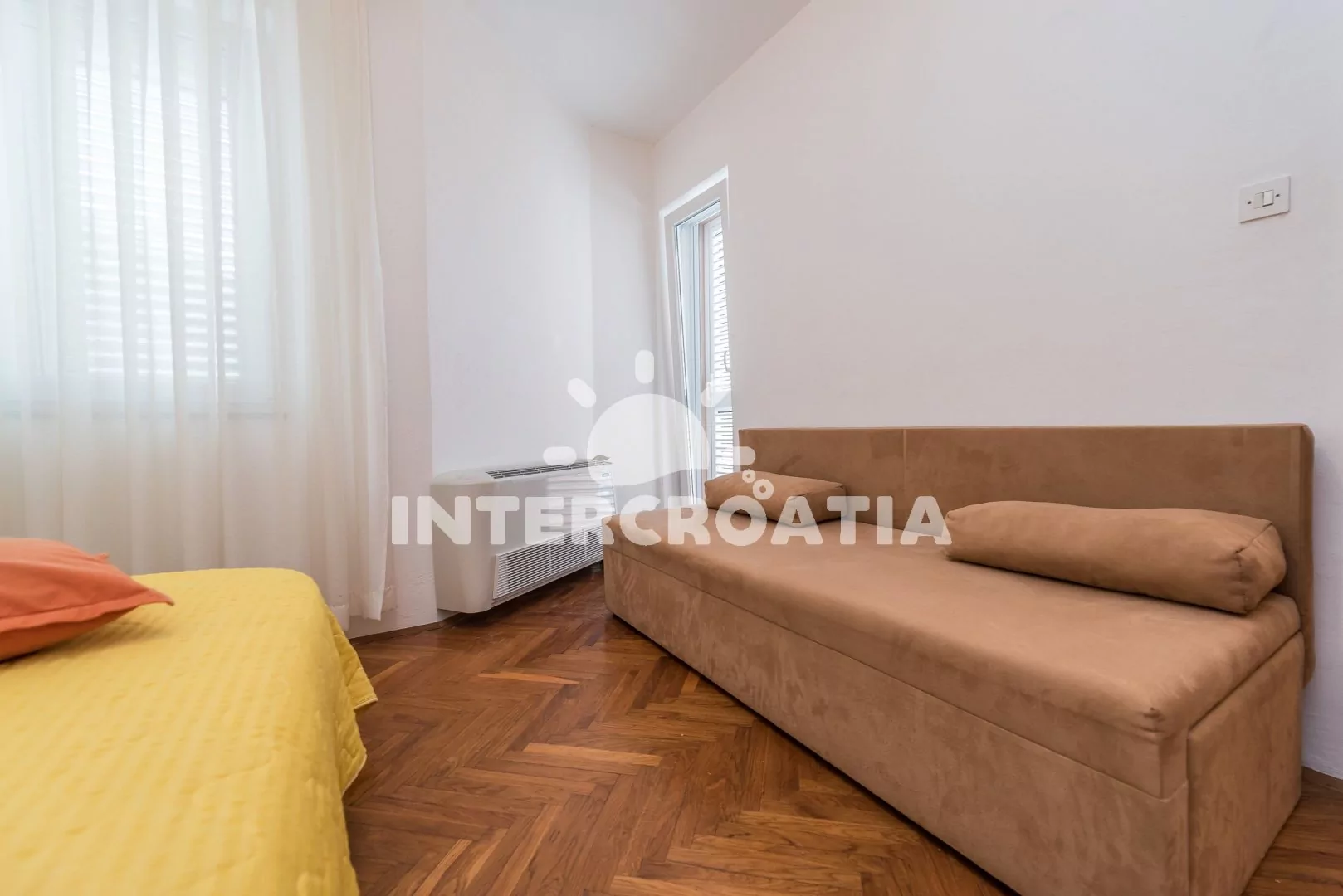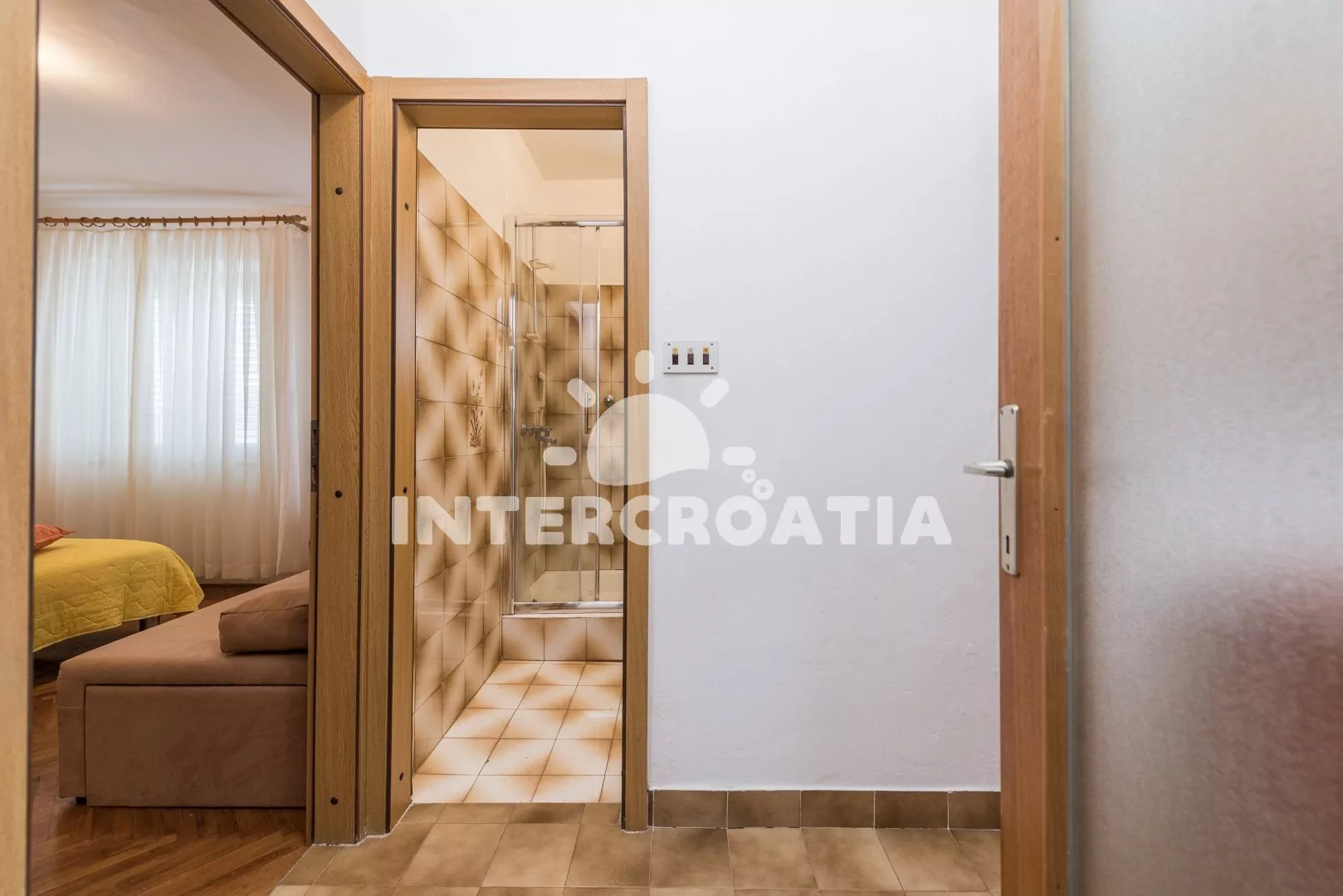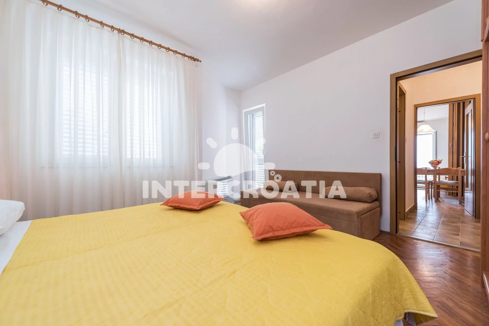 Apartmán (40 m2) s balkonem a výhledem na moře se nachází v 1. patře vily a je vhodný pro 2 až 4 osoby. Obývací pokoj je spojený s kuchyní. Kuchyňská linka je vybavena dvouplotýnkovým vařičem, rychlovarnou konvicí, nádobím a lednicí s mrazákem. Obývací pokoj s jídelním stolem pro 4 osoby, pohovkou (rozložitelná na extra lůžko pro 2 osoby), televizí se satelitním programem, klimatizací a vstupem na balkon. Ložnice s dvoulůžkem a vstupem na balkon. Koupelna se sprchovým koutem, umyvadlem a wc. Hostům je k dispozici parkování u objektu zdarma.