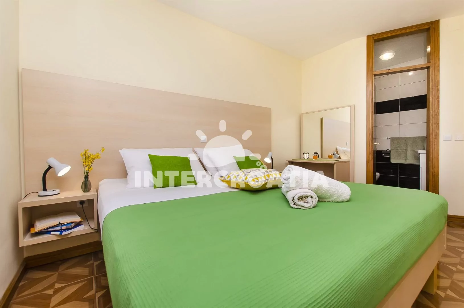 Apartmán (50 m2) s balkonem a venkovním posezením se nachází v 1. patře domu a je vhodný pro 2 až 4 osoby. Obývací pokoj je spojený s kuchyní. Kuchyňská linka je vybavena varnou deskou, digestoří, vestavěnou troubou, mikrovlnnou troubou, rychlovarnou konvicí, nádobím a lednicí s mrazákem. Obývací pokoj s jídelním stolem pro 4 osoby, pohovkou (rozložitelná na extra lůžko pro 2 osoby), televizí se satelitním programem, sejfem, klimatizací a vstupem na balkon. Ložnice je vybavena dvoulůžkem, koupelnou se sprchovým koutem, umyvadlem a wc. Druhá koupelna rovněž se sprchovým koutem, umyvadlem a wc. Hostům je k dispozici parkování u objektu zdarma.