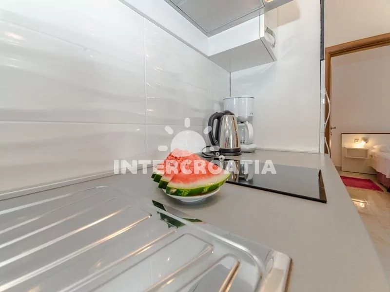 Luxusně zařízený apartmán (50 m2) s vlastní terasou se nachází v 1. patře domu a je vhodný pro 2 až 4 osoby. Obývací pokoj je spojený s kuchyní. Kuchyňská linka je vybavena dvouplotýnkovým vařičem,…