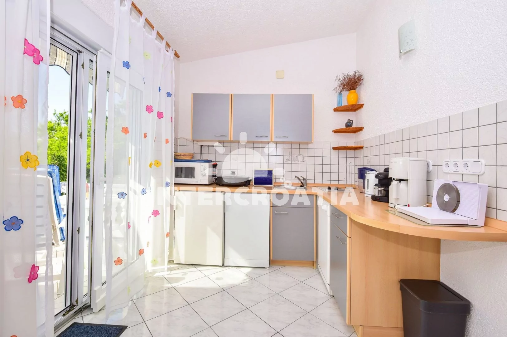 Apartmán (35 m2) s terasou, posezením a výhledem na moře se nachází v 1. patře domu. Apartmán má 1 ložnici a je vhodný pro 2 až 4 osoby. Obývací pokoj je spojený s kuchyní. Kuchyňská linka je vybavena dvouplotýnkovým vařičem, mikrovlnnou troubou, myčkou na nádobí, rychlovarnou konvicí, kávovarem, toustovačem, nádobím a lednicí s mrazákem. Obývací pokoj s jídelním stolem pro 4 osoby, pohovkou (rozložitelná na extra lůžko pro 2 osoby), televizí se satelitním programem, radiem, klimatizací a vstupem na terasu. Ložnice s jedním dvoulůžkem. Koupelna se sprchovým koutem, umyvadlem, bidetem a wc. Hostům je k dispozici parkování u objektu zdarma.