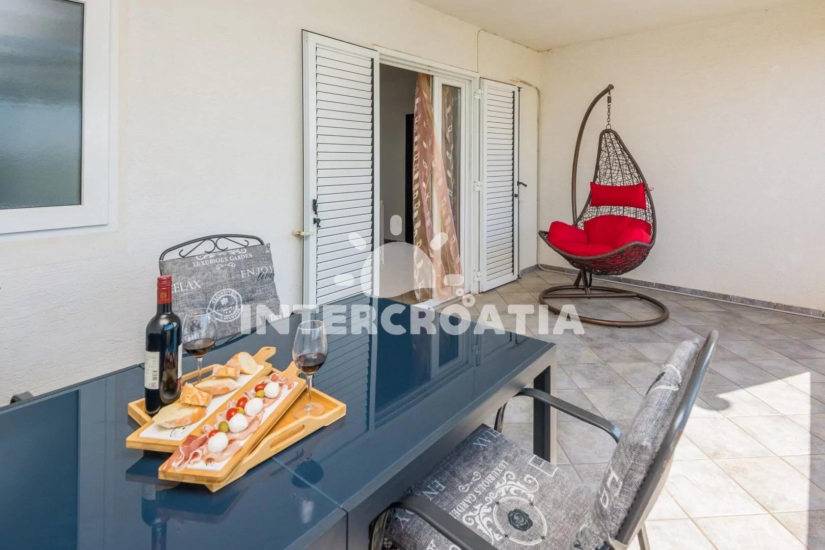 Apartmán (47 m2) s terasou, posezením a výhledem do dvora se nachází v 1. patře domu. Apartmán má 2 ložnice a je vhodný pro až 4 osoby. Obývací pokoj je spojený s kuchyní. Kuchyňská linka je vybavena sklokeramickou varnou deskou, myčkou na nádobí, mikrovlnnou troubou, rychlovarnou konvicí, kávovarem, toustovačem, nádobím a lednicí s mrazákem. Obývací pokoj s jídelním stolem pro 6 osob, pohovkou, televizí se satelitním programem, klimatizací a vstupem na terasu. První i druhá ložnice je vybavena vždy s jedním dvoulůžkem. Koupelna se sprchovým koutem, umyvadlem, fénem a wc. Hostům je k dispozici parkování u objektu zdarma.