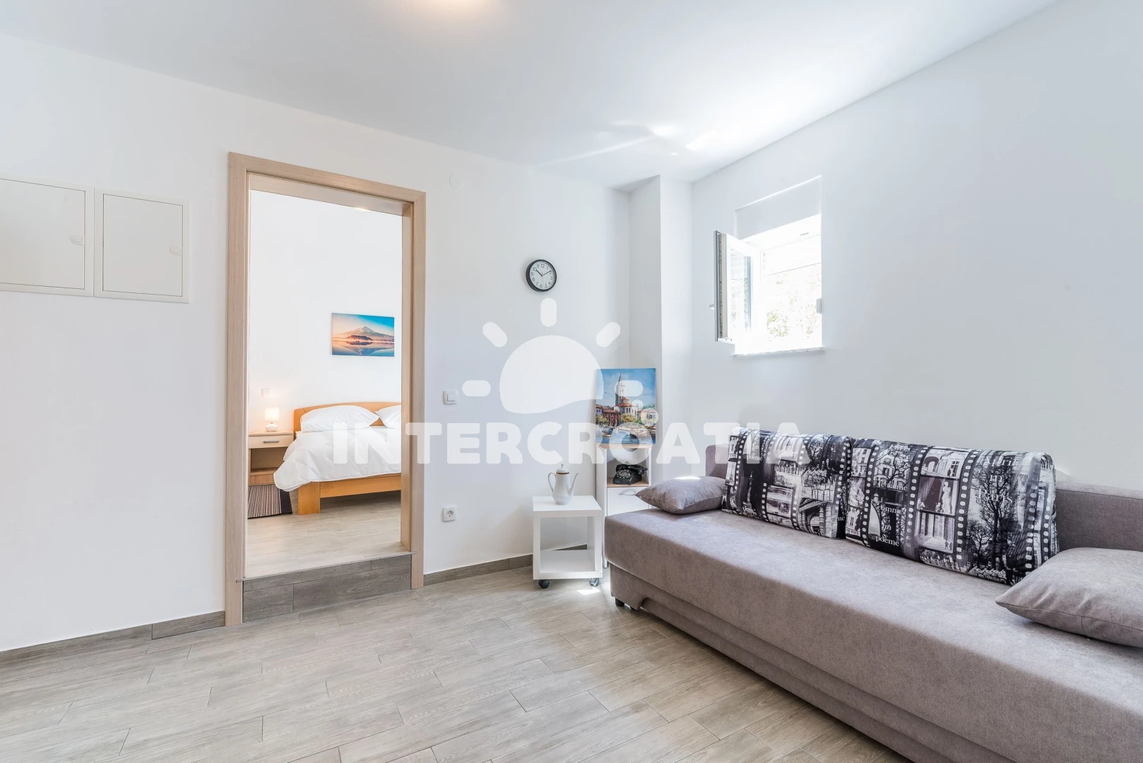 Apartmán se nachází 30 m od moře a pláže. Pláž je oblázková a betonové desky. U objektu je k dispozici společná zahrada s posezením a grilem. Parkování je před domem.