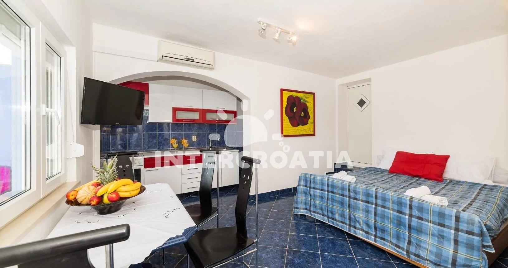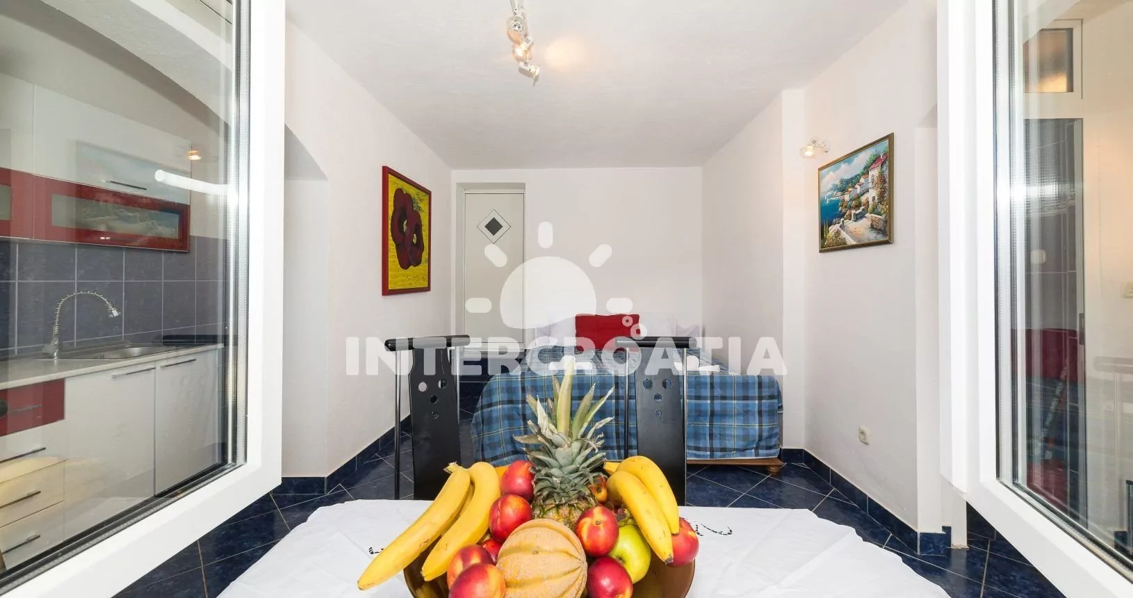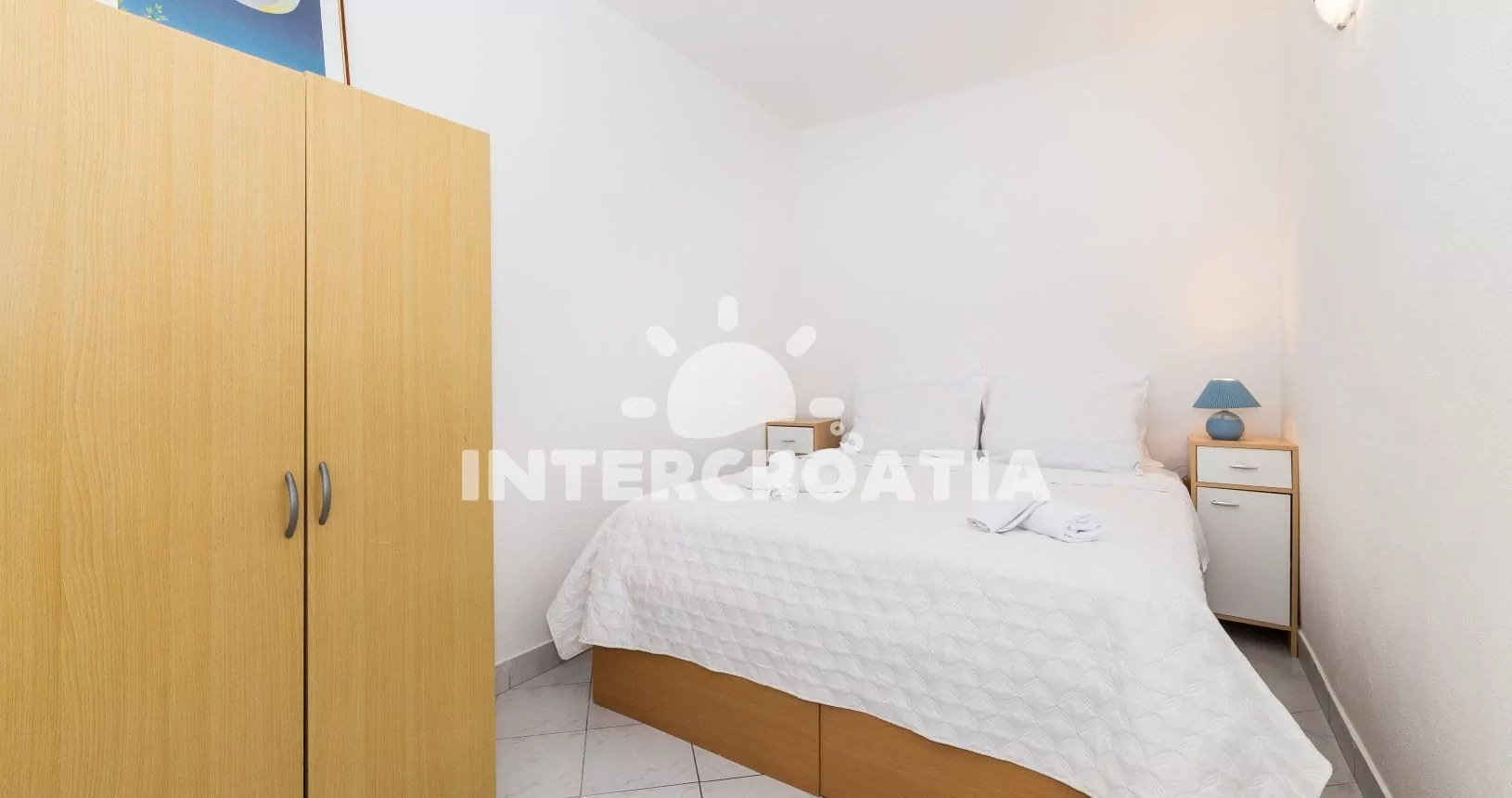 Apartmán (30 m2) s balkonem, posezením a výhledem na moře se nachází ve zvýšeném přízemí domu. Apartmán má 1 ložnici a je vhodný pro 2 osoby. Obývací pokoj je spojený s kuchyní. Kuchyňská linka je vybavena sporákem s troubou, digestoří, mikrovlnnou troubou, rychlovarnou konvicí, kávovarem, nádobím a lednicí s mrazákem. Obývací pokoj s jídelním stolem, pohovkou, televizí se satelitním programem, klimatizací a vstupem na balkon. Ložnice s jedním dvoulůžkem. Koupelna se sprchovým koutem, umyvadlem a wc. Hostům je k dispozici parkování u objektu zdarma.