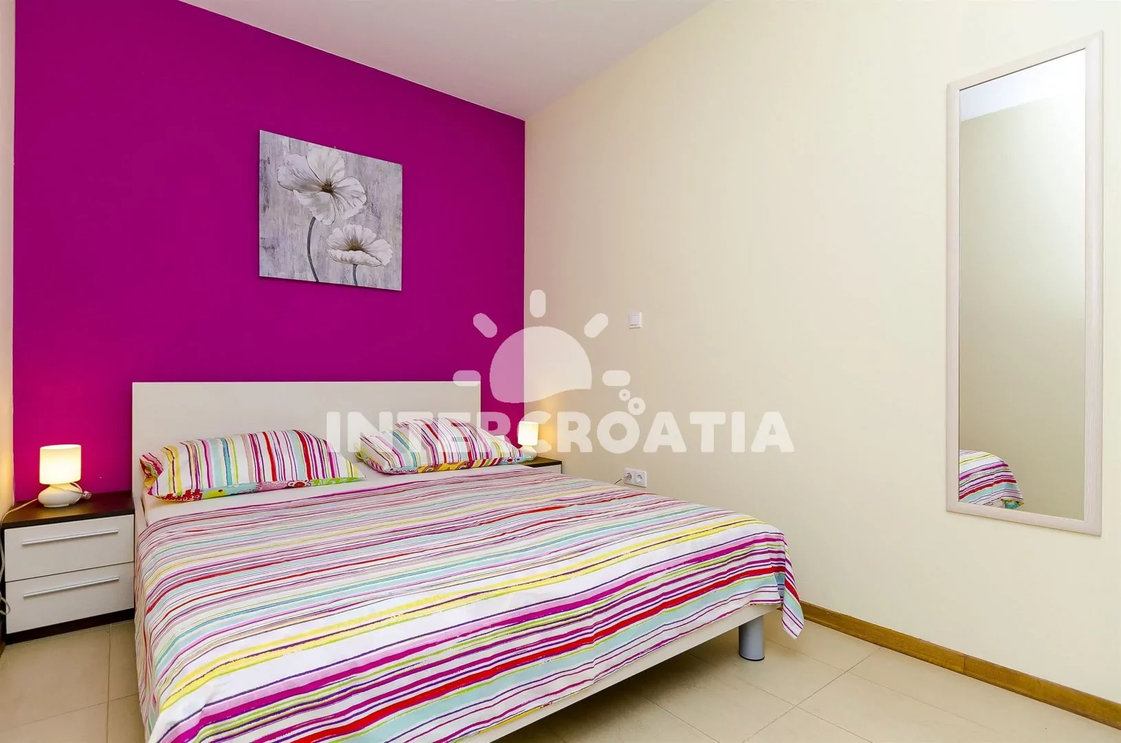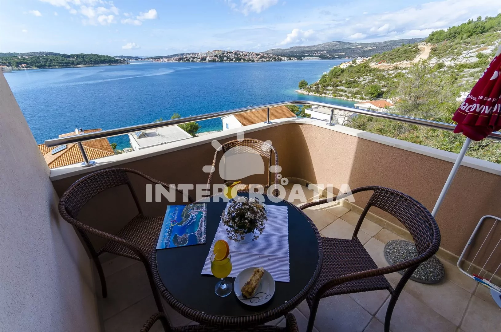 Moderně zařízený apartmán s balkonem, posezením a výhledem na moře, nacházející se v 1. patře domu. Vstup, obývací místnost spojená s kuchyní. Kuchyňská linka s varnou deskou (elektřina/plyn), troubou, lednicí s mrazákem, kávovarem, rychlovarnou konvicí, toustovačem a nádobím. V obývacím pokoji jídelní stůl pro 4 osoby, pohovka (rozložitelná na extra lůžko pro 2 osoby) a LCD televize se satelitem. Ložnice s dvoulůžkem. Koupelna se sprchovým koutem, umyvadlem a wc. Hosté mají k dispozici balkon s posezením, krásným výhledem na záliv a v zahradě gril. Parkování u objektu.