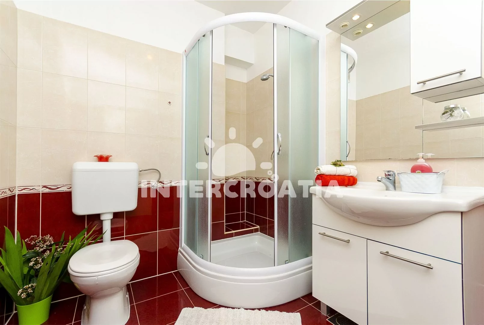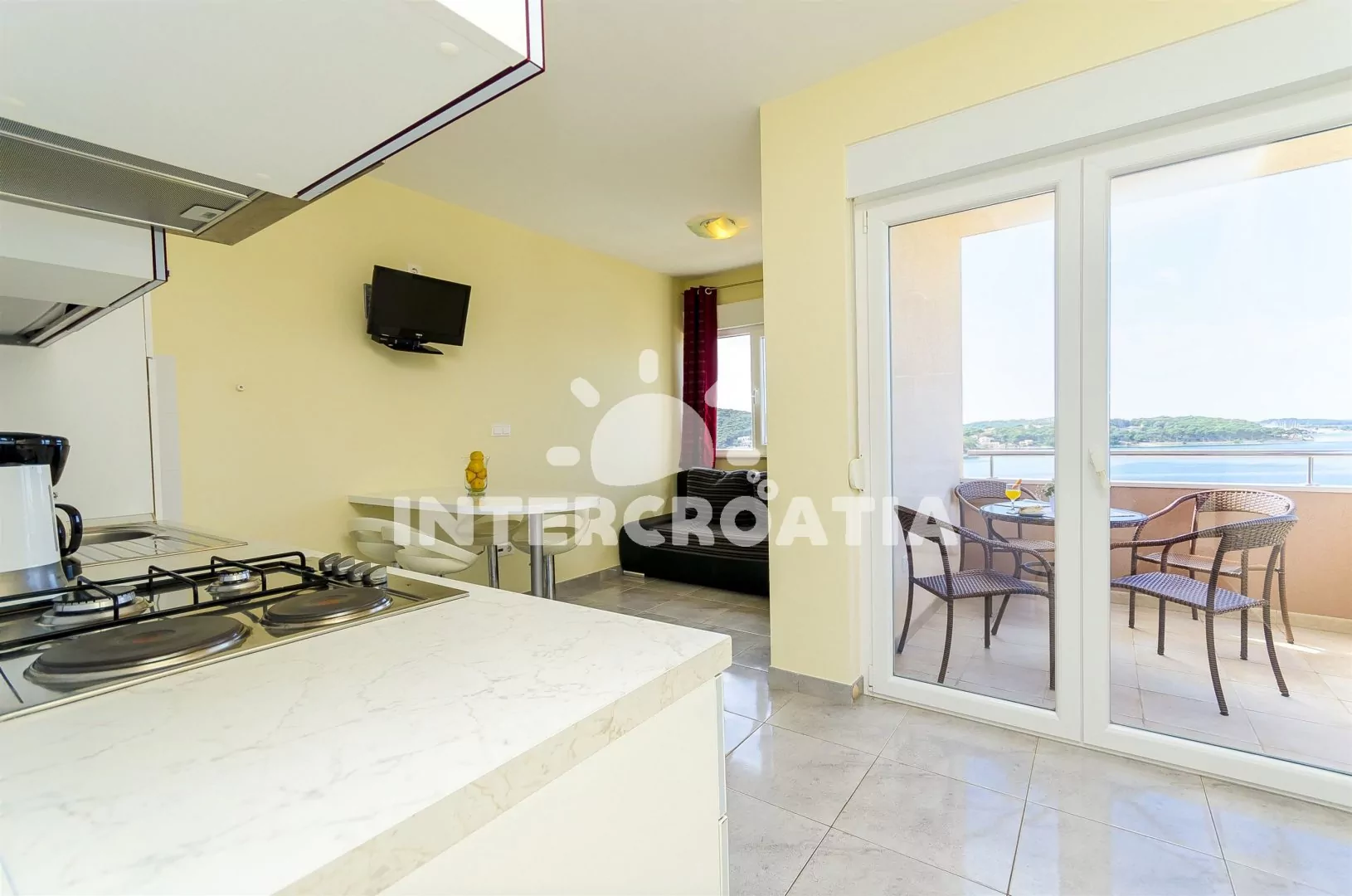 Moderně zařízený apartmán s balkonem, posezením a výhledem na moře, nacházející se v 1. patře domu. Vstup, obývací místnost spojená s kuchyní. Kuchyňská linka s varnou deskou (elektřina/plyn),…