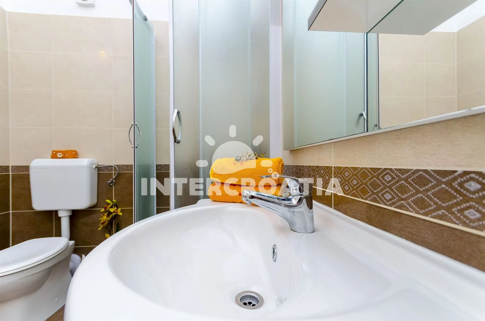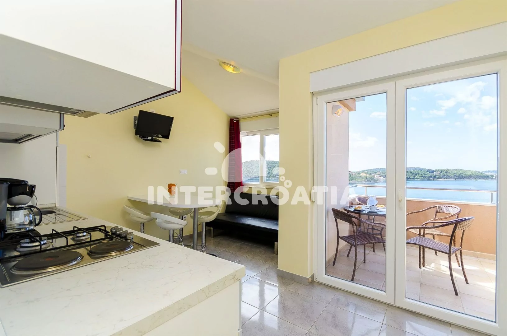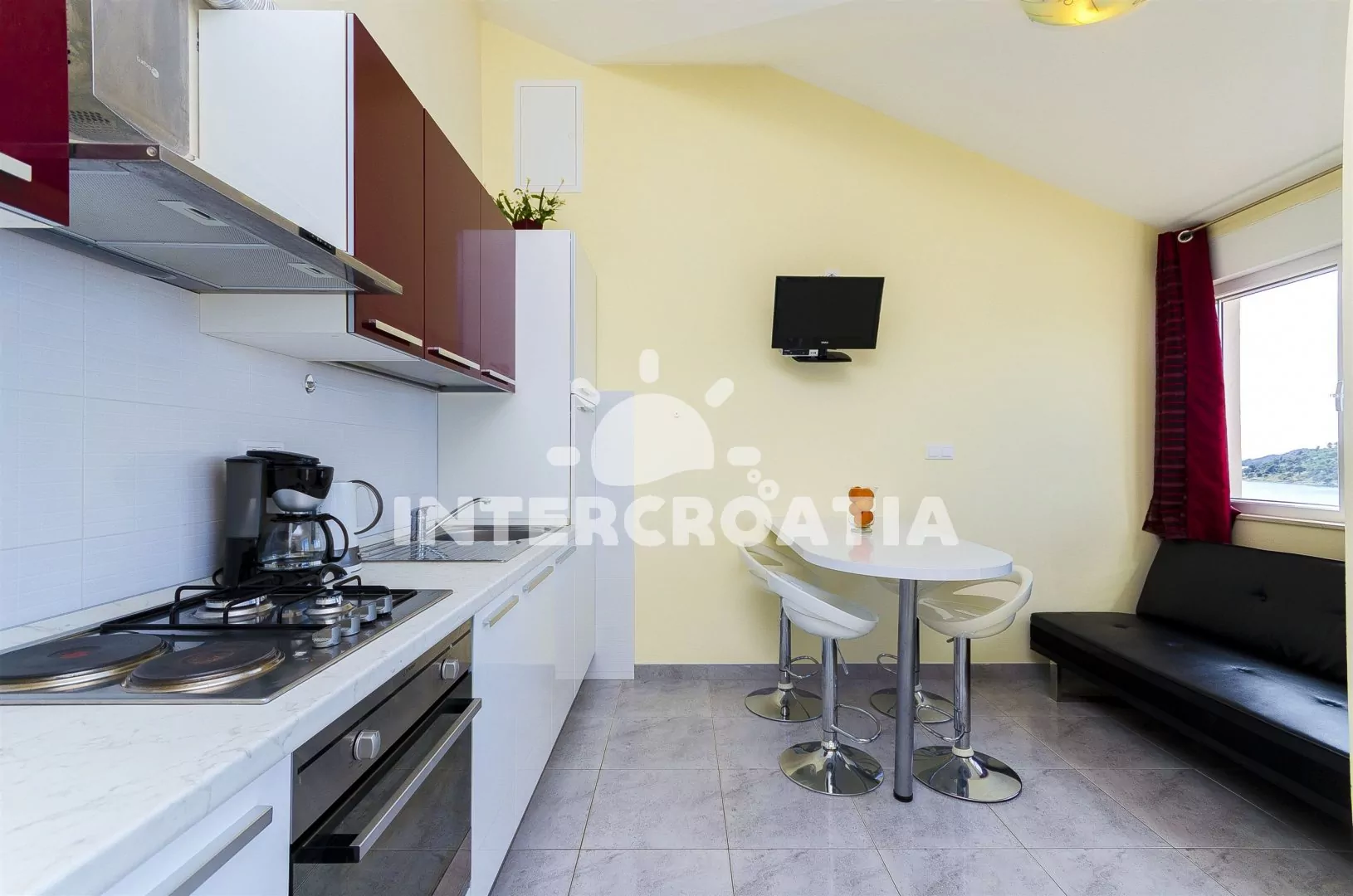 Vkusně a příjemně zařízený apartmán s balkonem, posezením a výhledem na moře, nacházející se v 2. patře domu. Vstup, obývací místnost spojená s kuchyní. Kuchyňská linka s varnou deskou (elektřina…