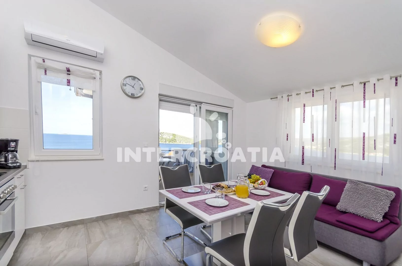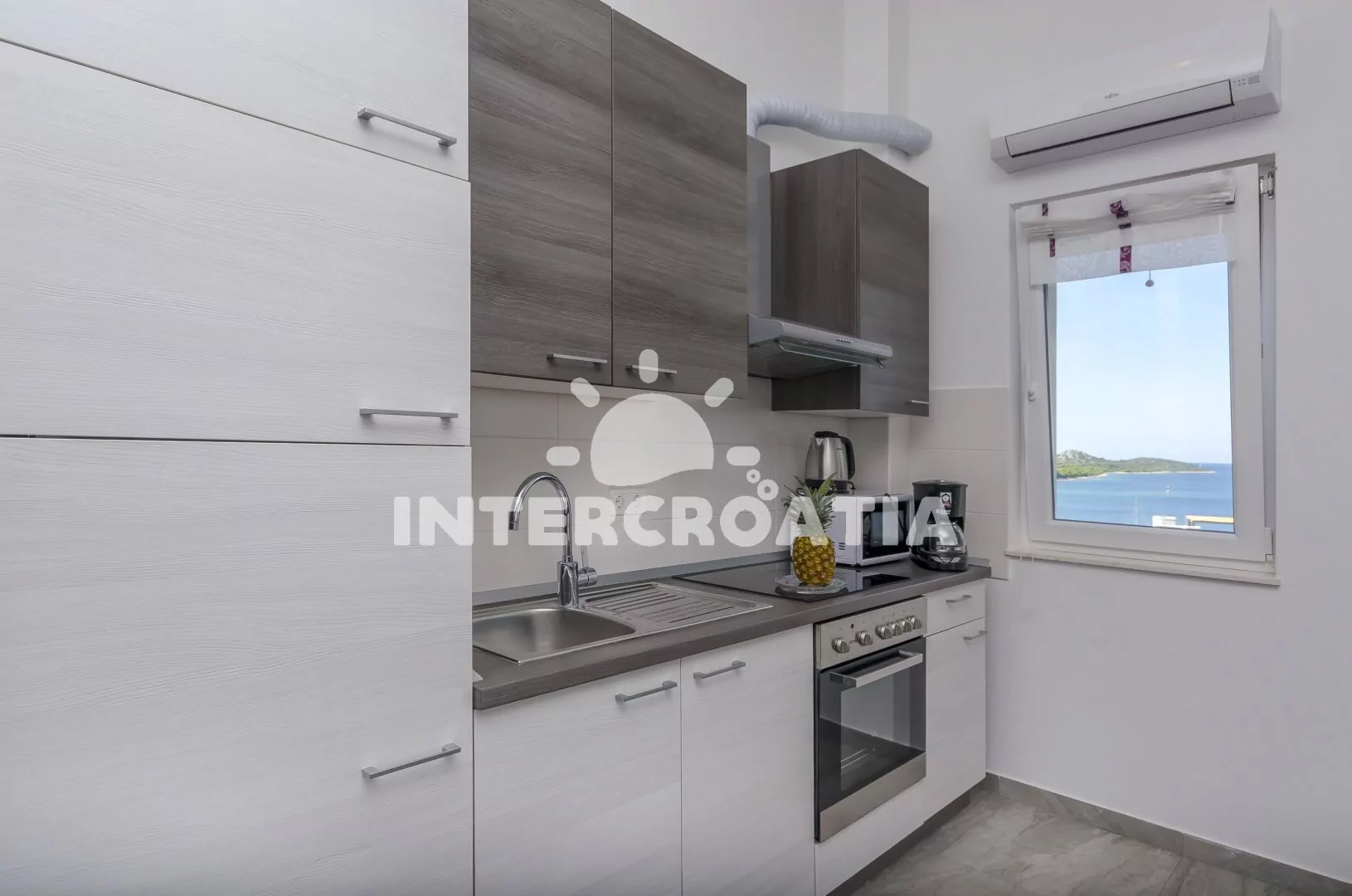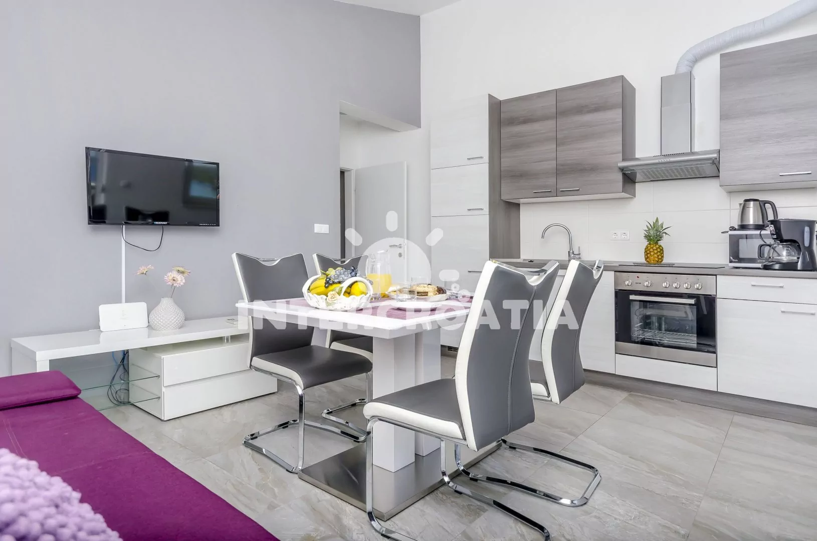 Moderně zařízený apartmán v přízemí vily, pro 3 až 4 osoby s výhledem na moře a venkovním posezením. Obývací pokoj spojený s kuchyní. Kuchyňská linka s varnou deskou, digestoří, vestavěnou troubou,…
