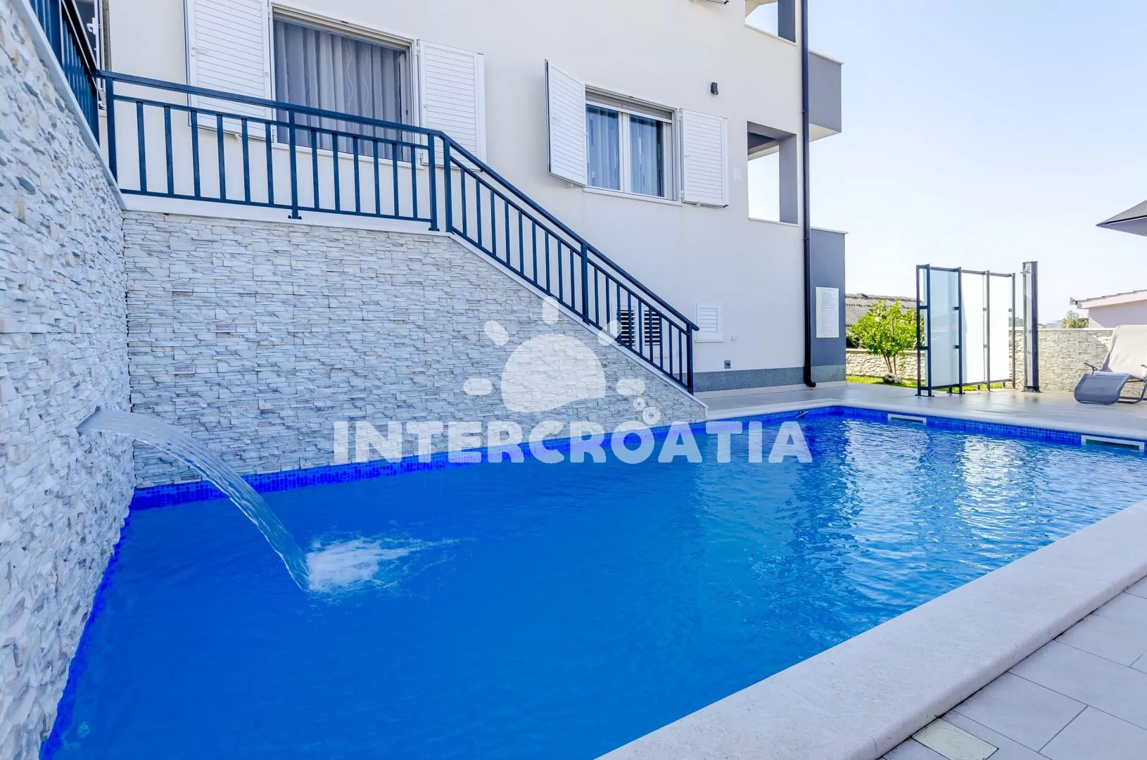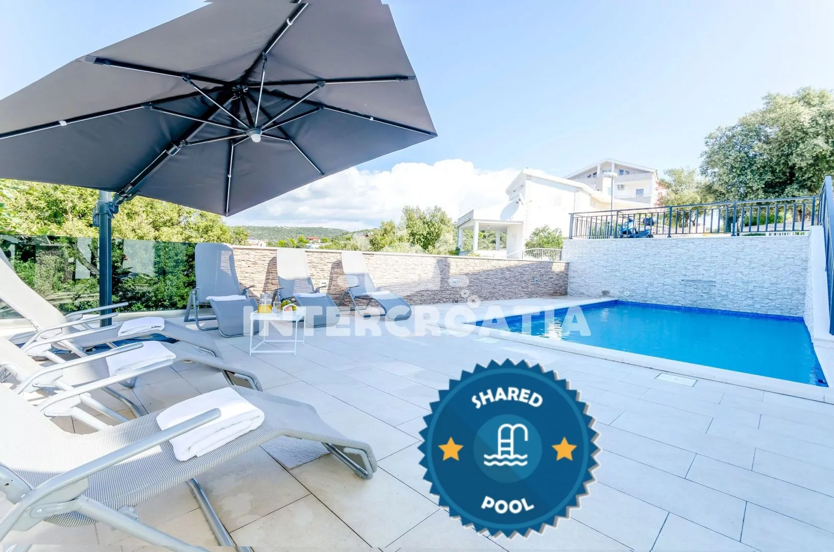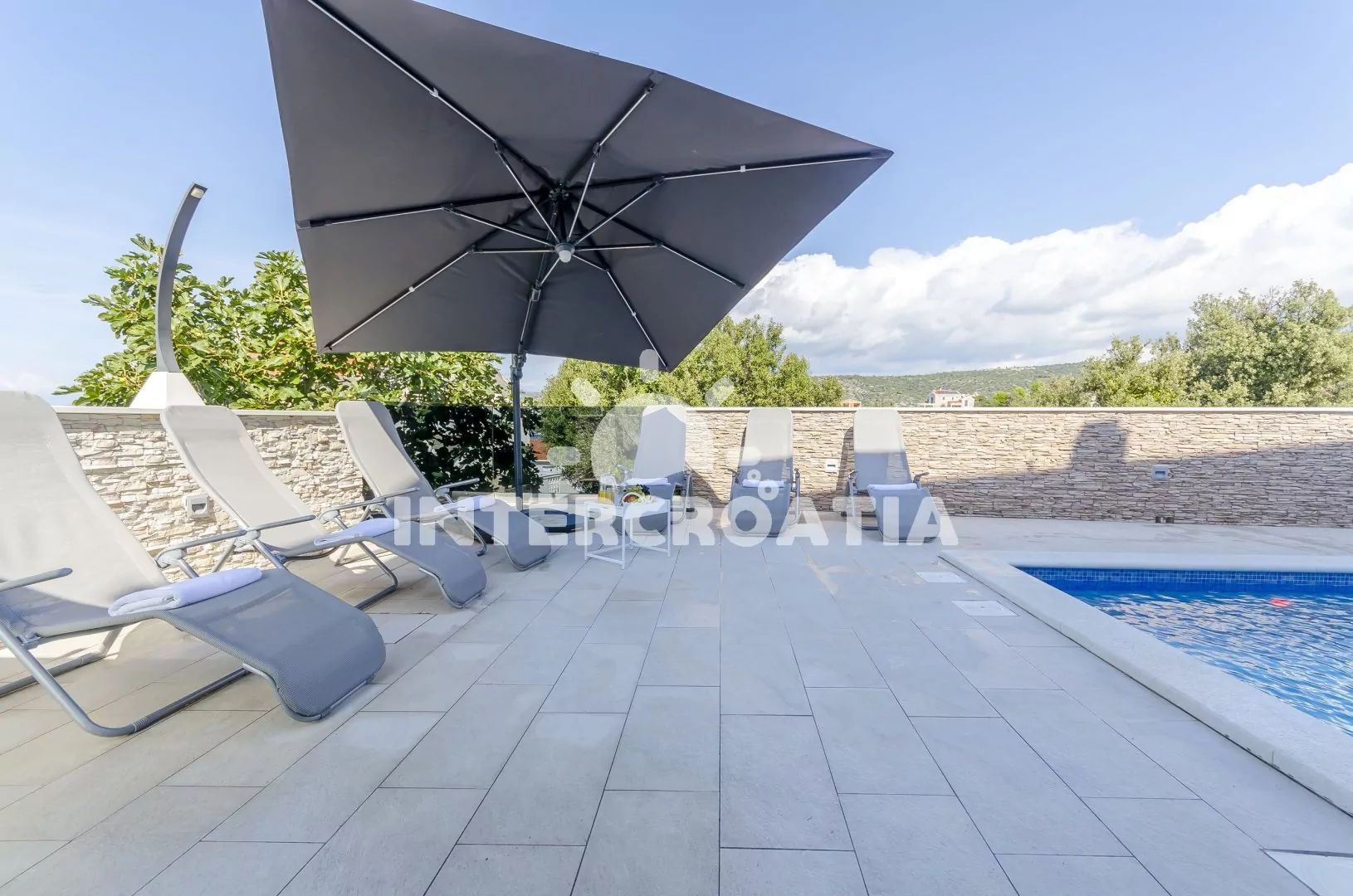 Luxusně zařízená vila s venkovním bazénem a výhledem na moře. U bazénu posezení s lehátky, k dispozici pergola s grilem.