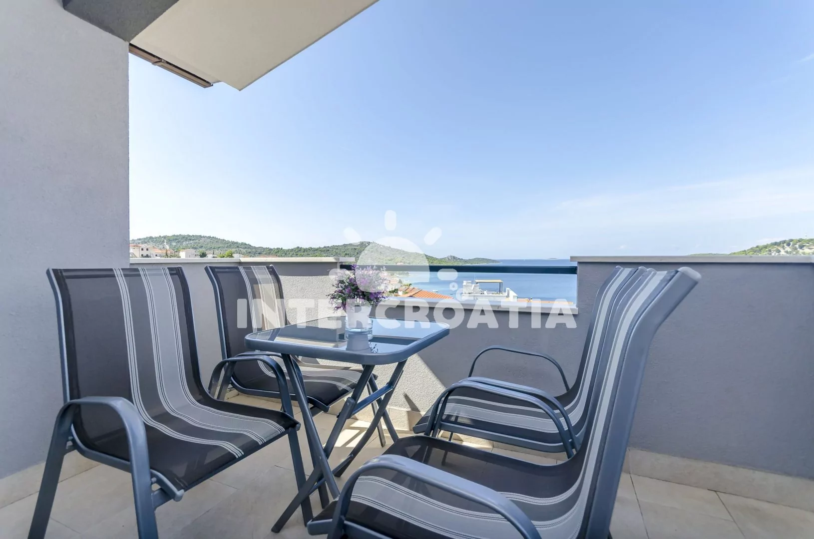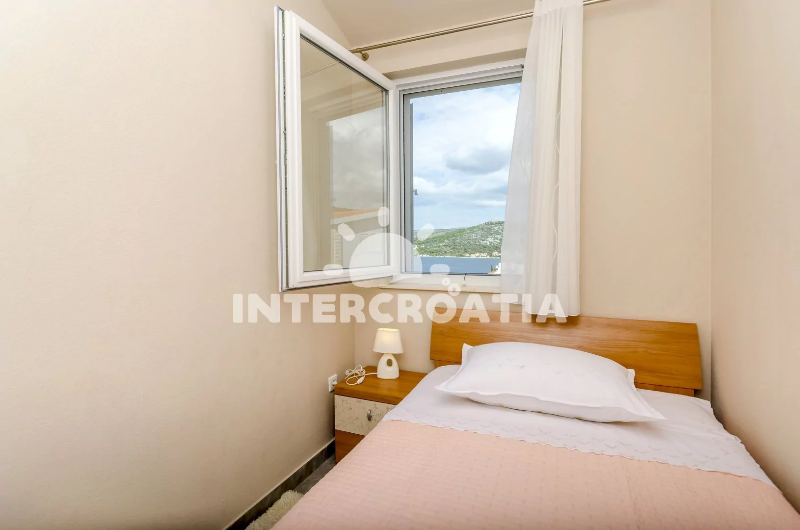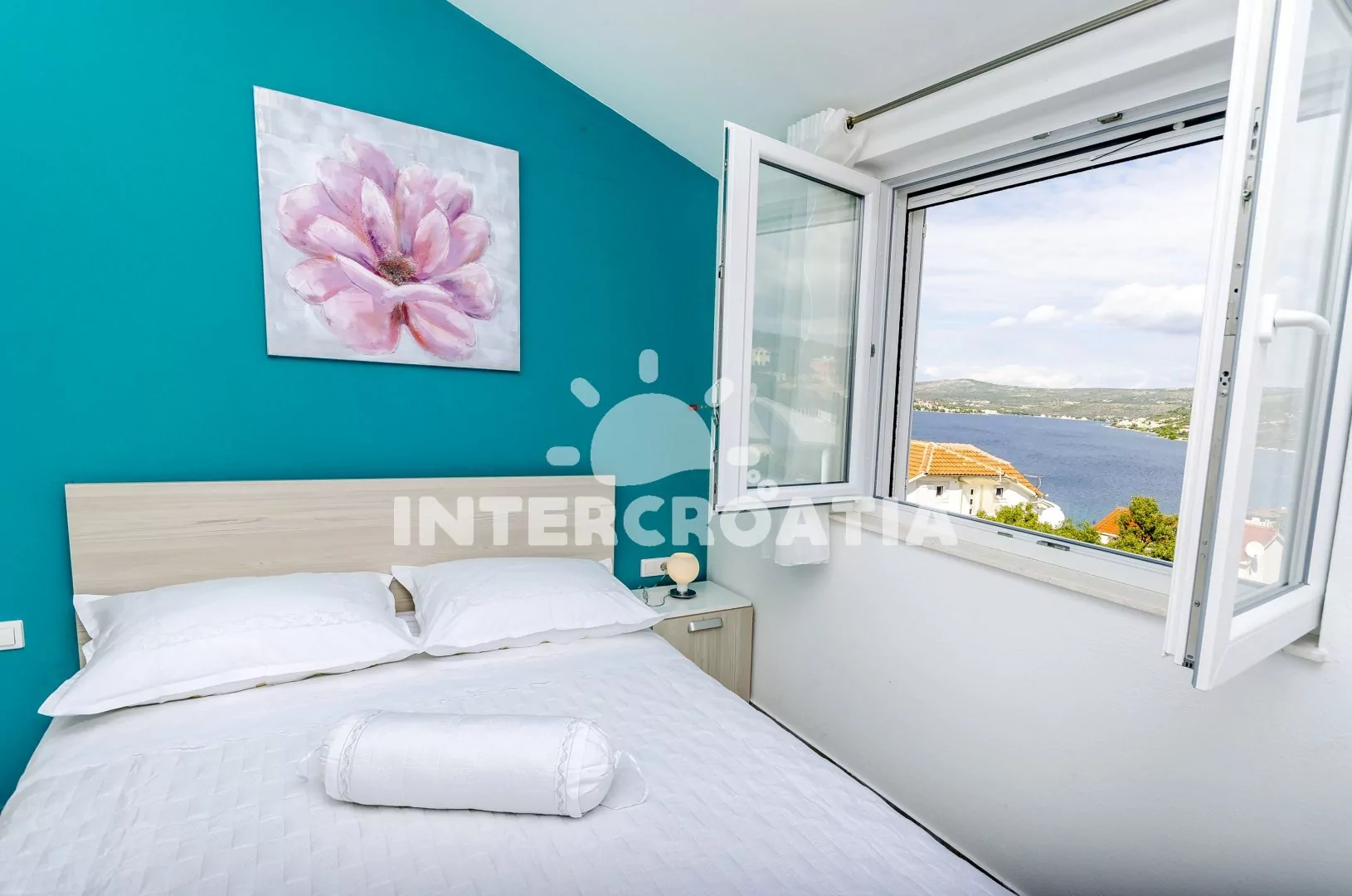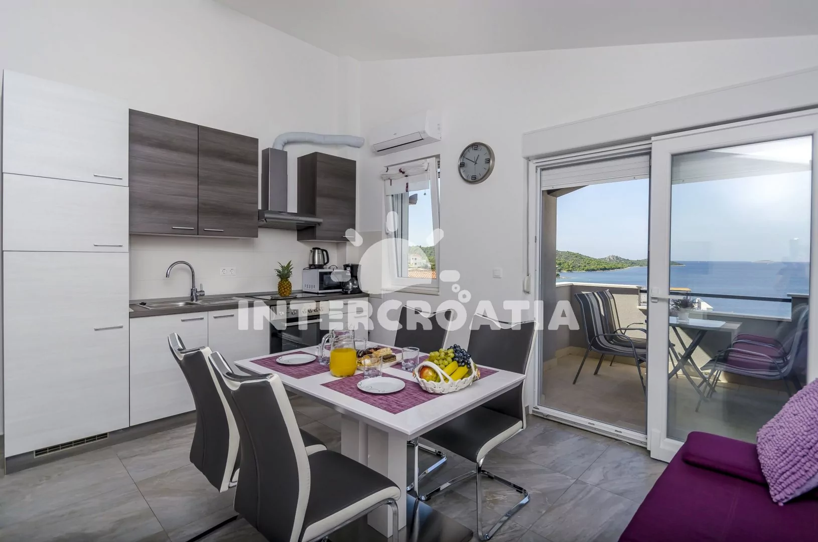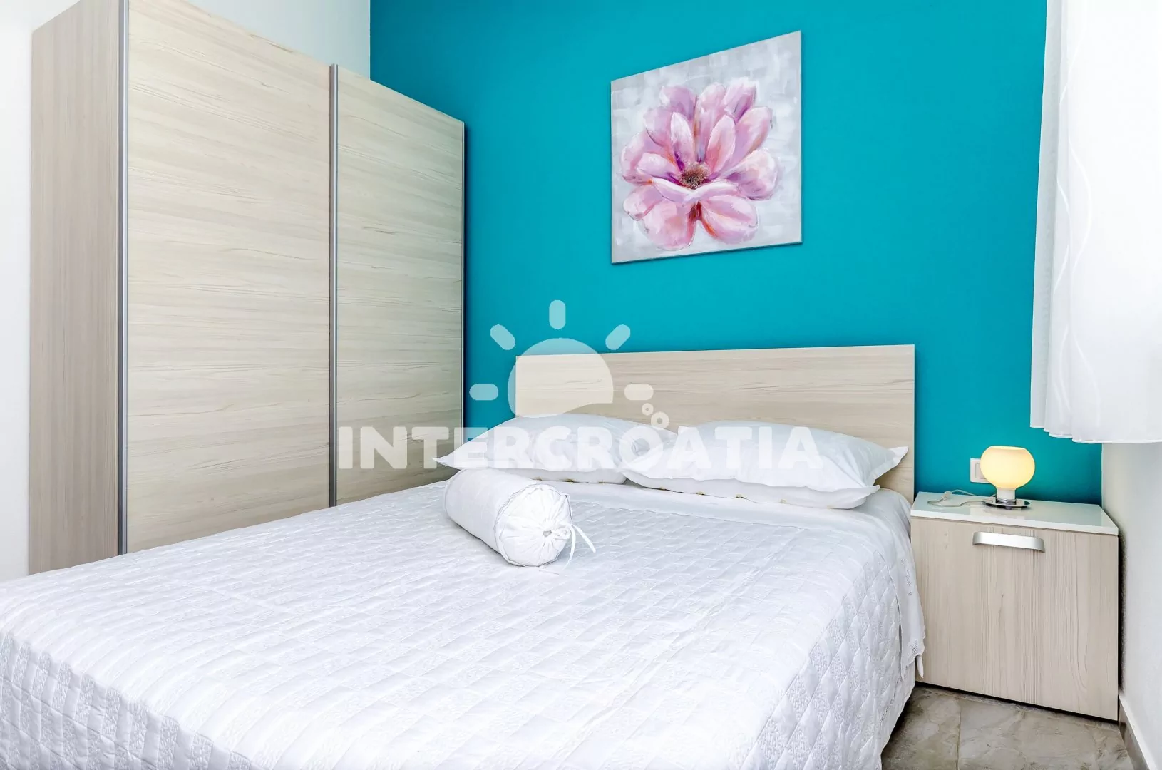 Moderně zařízený apartmán v přízemí vily, pro 3 až 4 osoby s výhledem na moře a venkovním posezením. Obývací pokoj spojený s kuchyní. Kuchyňská linka s varnou deskou, digestoří, vestavěnou troubou, mikrovlnnou troubou, rychlovarnou konvicí, kávovarem, nádobím a lednicí s mrazákem. Obývací pokoj s jídelním stolem pro 4 osoby, rozložitelnou pohovkou (extra lůžko pro 1 osobu), televizí se satelitním programem, klimatizací, francouzským oknem a vstupem na balkon. První ložnice s jedním dvoulůžkem. Druhá ložnice s jedním jednolůžkem. Koupelna se sprchovým koutem, umyvadlem, pračkou, fénem a wc. Hostům je k dispozici parkování u objektu zdarma.