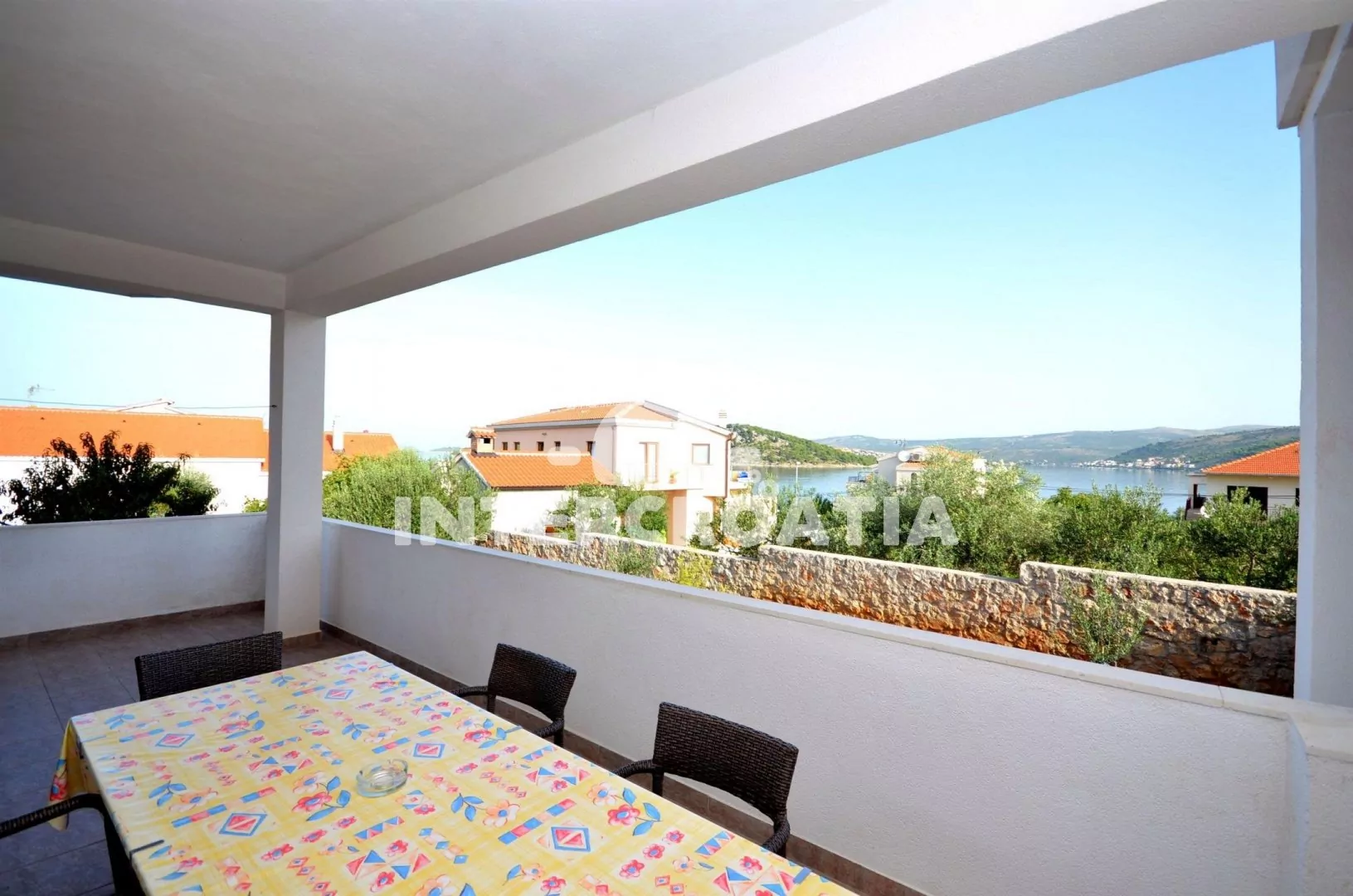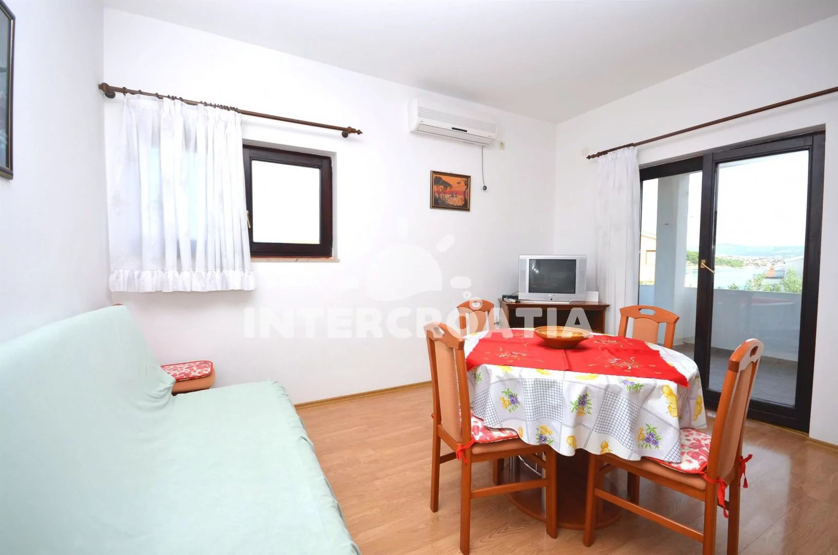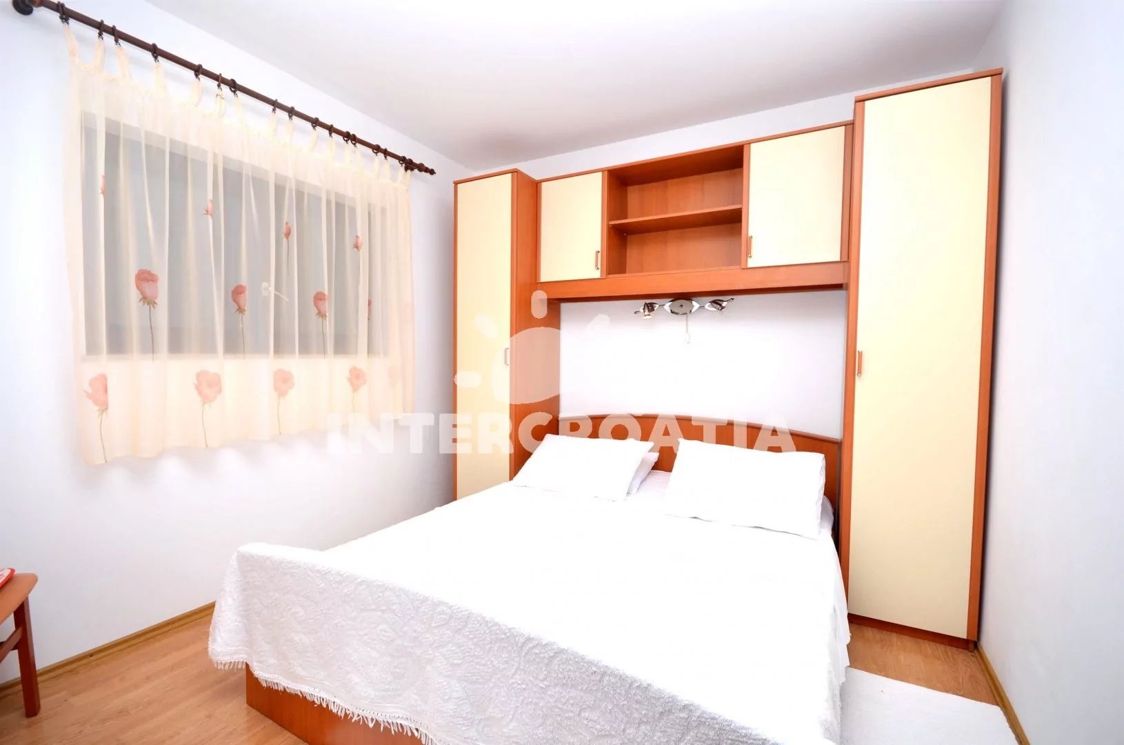 Apartmán se třemi pokoji a terasou s výhledem na moře, nacházející se ve zvýšeném přízemí. Obývací místnost spojená s kuchyní. Kuchyňská linka se sporákem, troubou, mikrovlnnou troubou, lednicí s mrazákem a nádobím. V obývací místnosti jídelní stůl pro 4 osoby, pohovka (rozložitelná na extra lůžko pro 2 osoby) a televize. Dvě ložnice, každá s dvoulůžkem. Koupelna se sprchovým koutem, umyvadlem a wc. Hosté mají k dispozici balkon s posezením a v zahradě společný gril. Parkování u objektu.