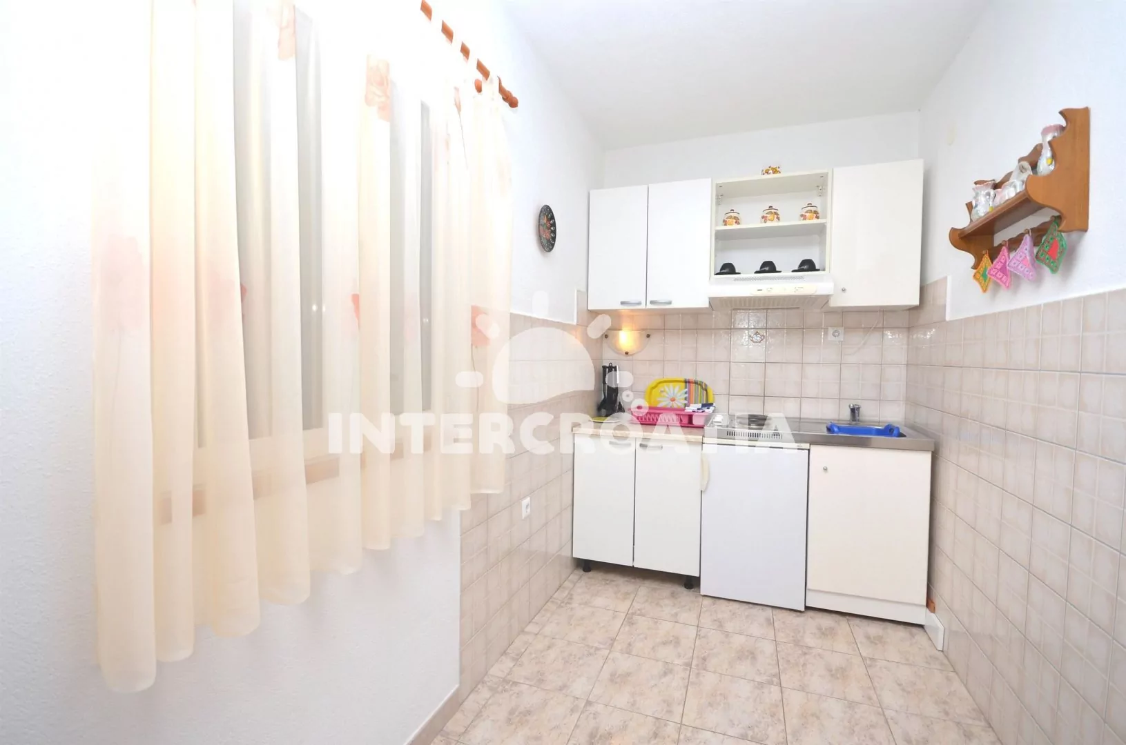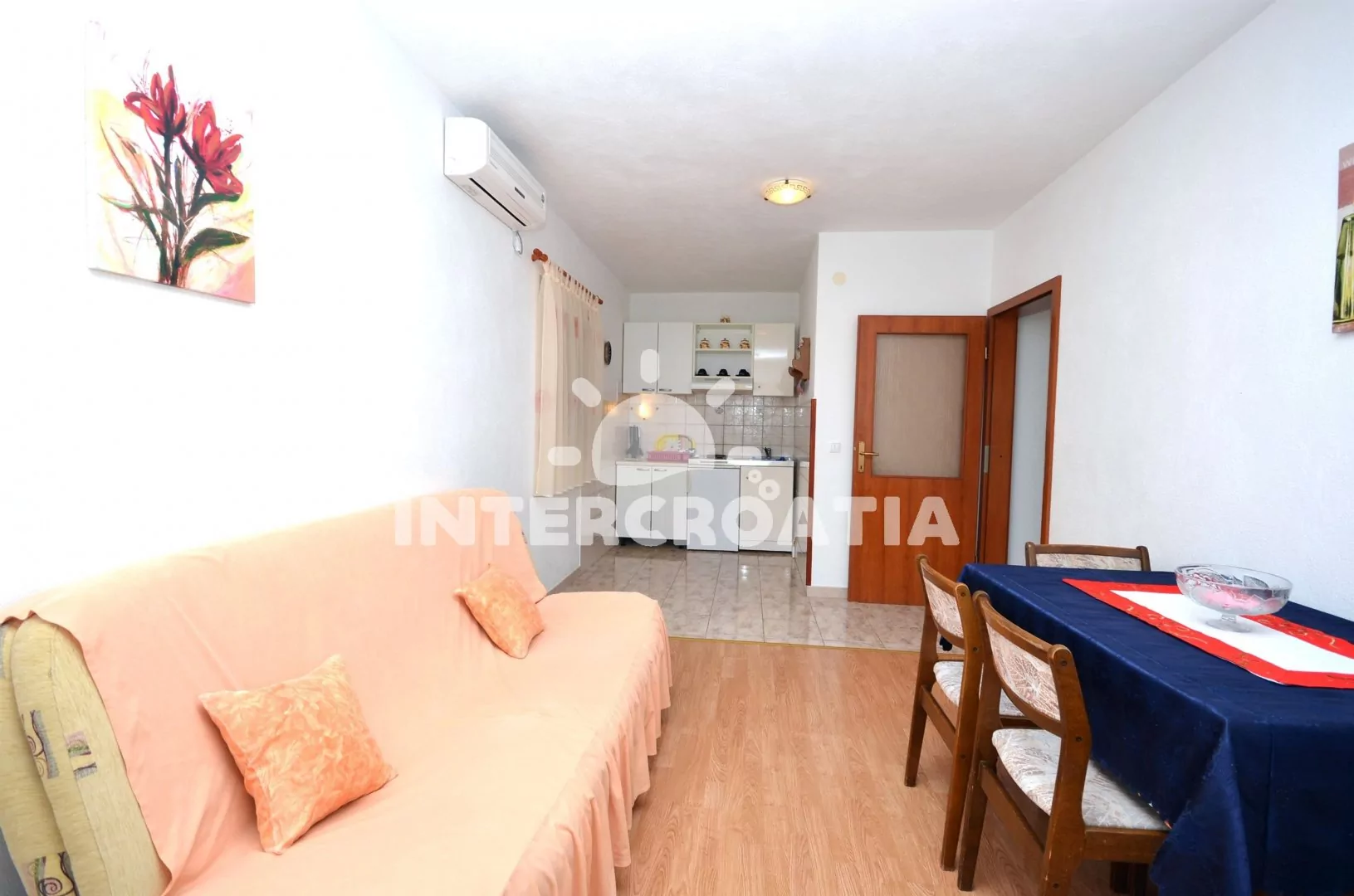 Dvoupokojový apartmán s balkonem a výhledem na moře, nacházející se v 1. patře domu. Obývací místnost spojená s kuchyní. Kuchyňská linka s dvouplotýnkovým elektrickým vařičem, lednicí s mrazákem a…