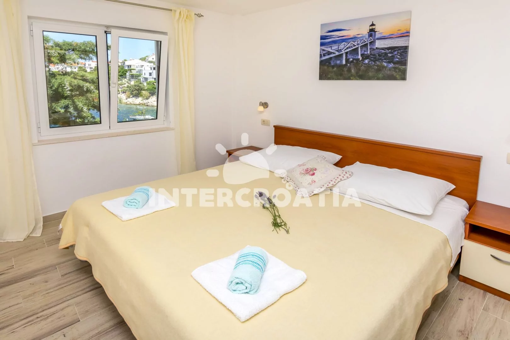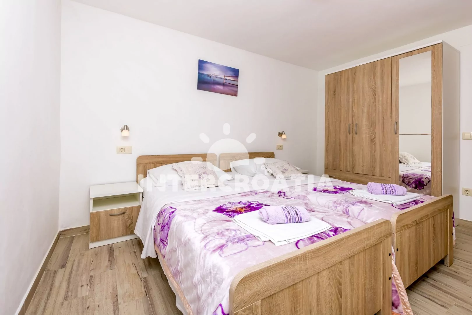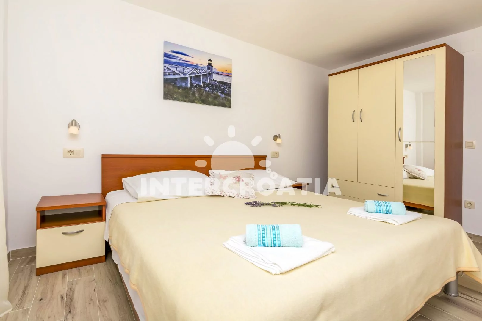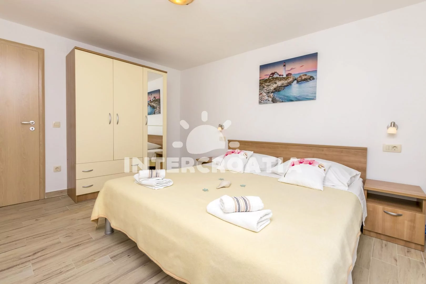 Moderně zařízený čtyřpokojový apartmán pro až 6 osob s výhledem na moře, nachází se v přízemí vilky. Obývací pokoj je spojený s kuchyní. Kuchyňská linka je vybavena sklokeramickou varnou deskou, vestavěnou troubou, myčkou na nádobí, mikrovlnnou troubou, rychlovarnou konvicí, nádobím a lednicí s mrazákem. Obývací pokoj s jídelním stolem pro 6 osob, pohovkou, televizí se satelitním programem, klimatizací a vstupem na terasu. První a druhá ložnice je vybavena vždy s jedním dvoulůžkem. Třetí ložnice s dvěma jednolůžky. Koupelna se sprchovým koutem, pračkou, umyvadlem, fénem, bidetem a wc. Dále samostatné wc s umyvadlem. Hostům je k dispozici parkování u objektu zdarma.