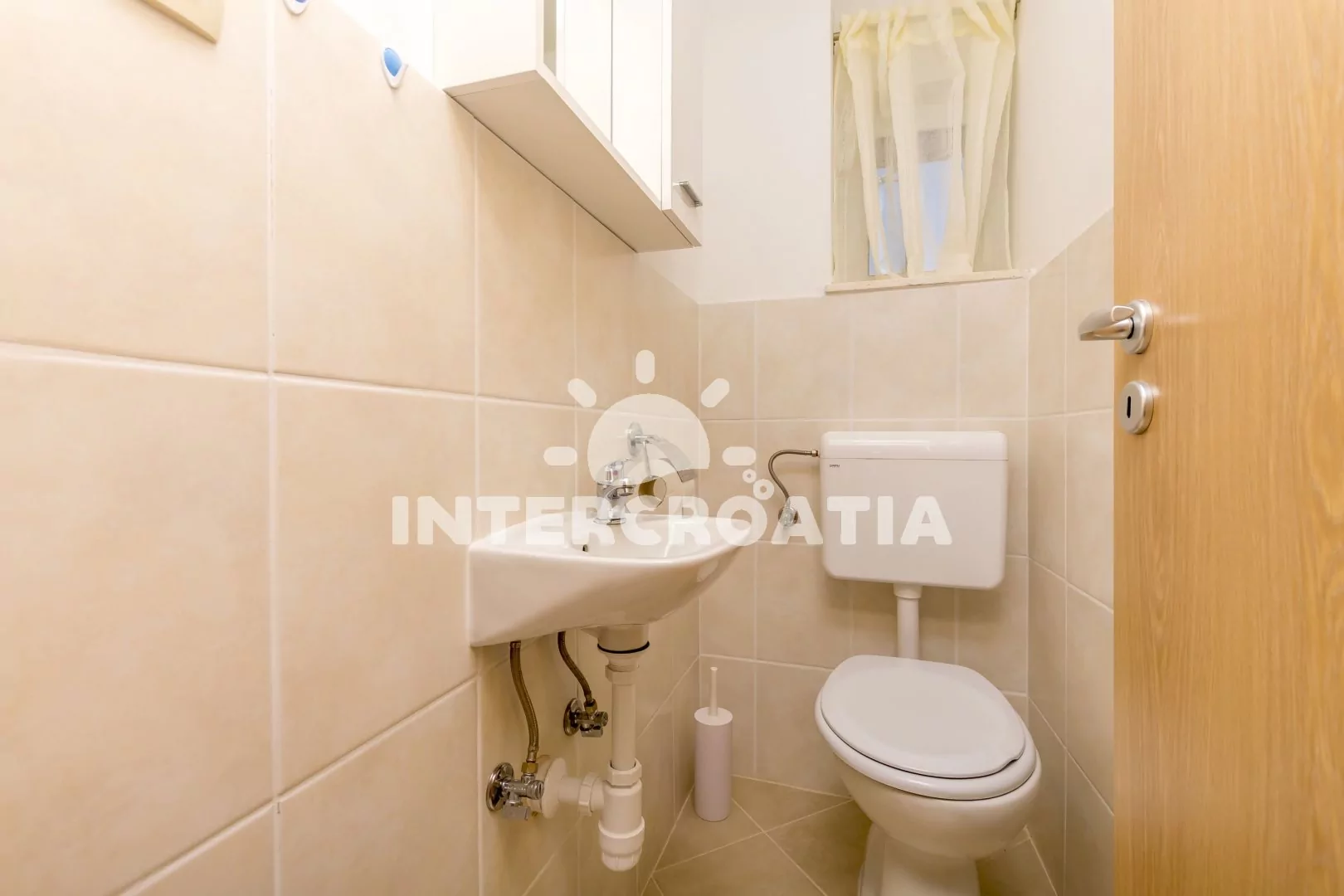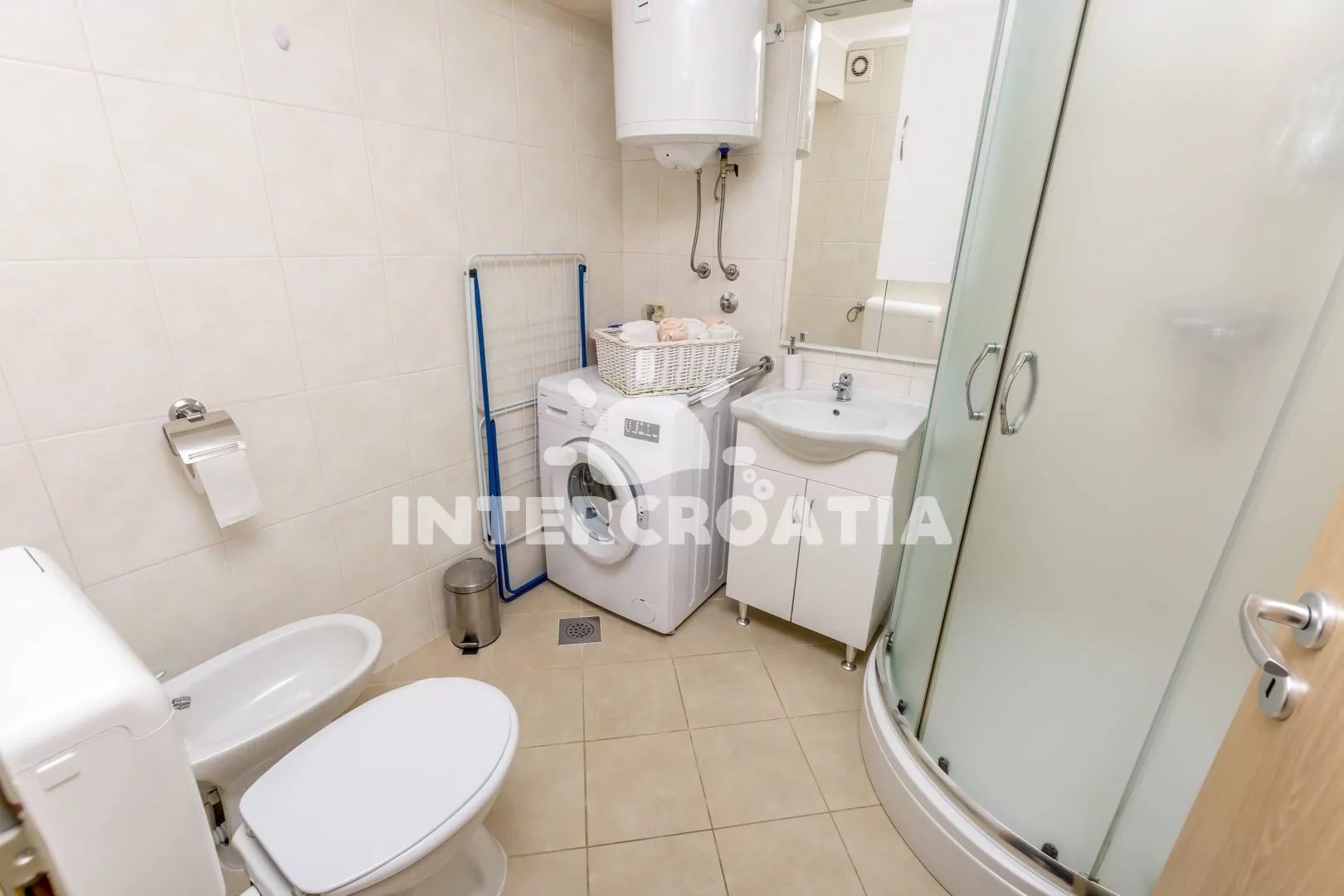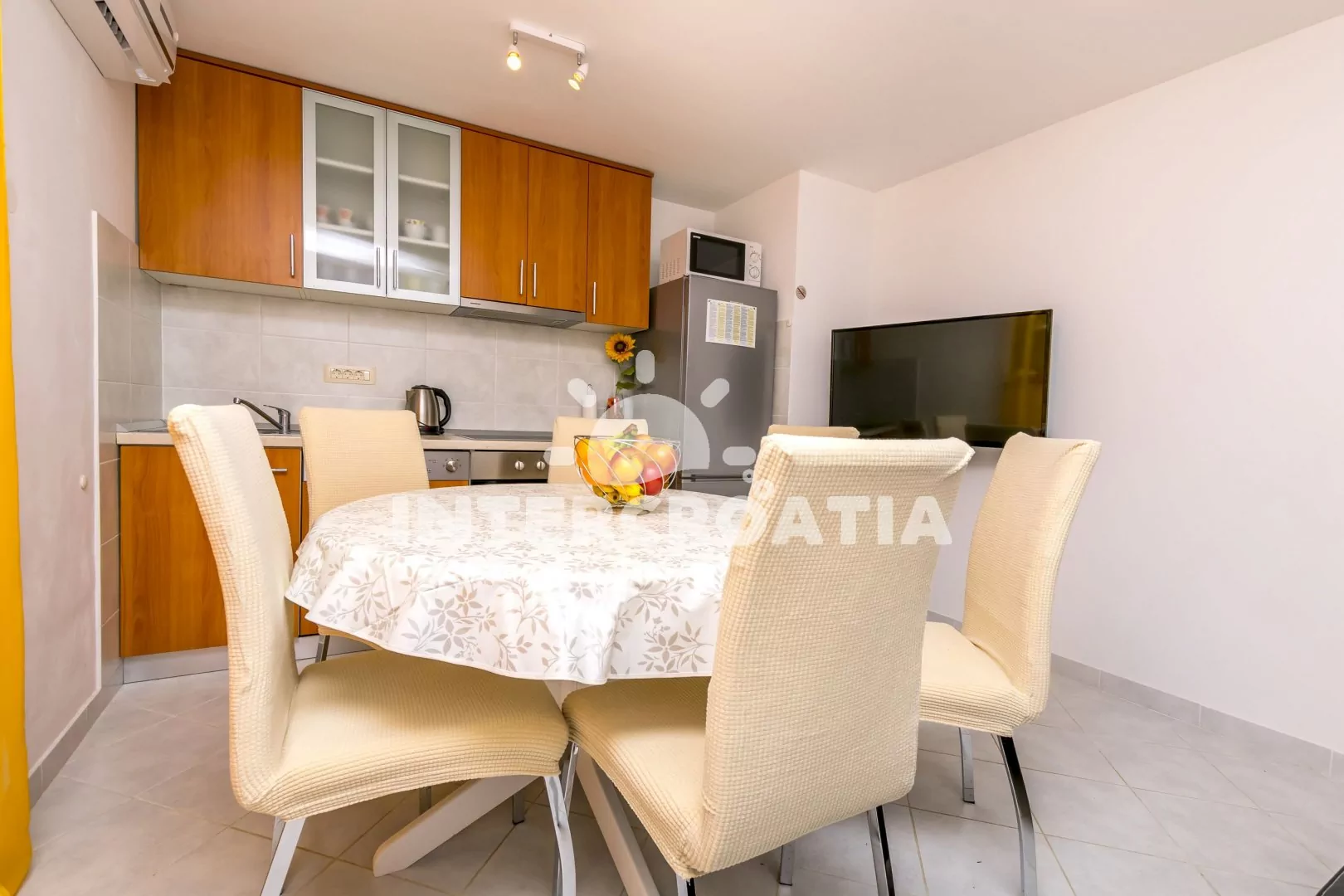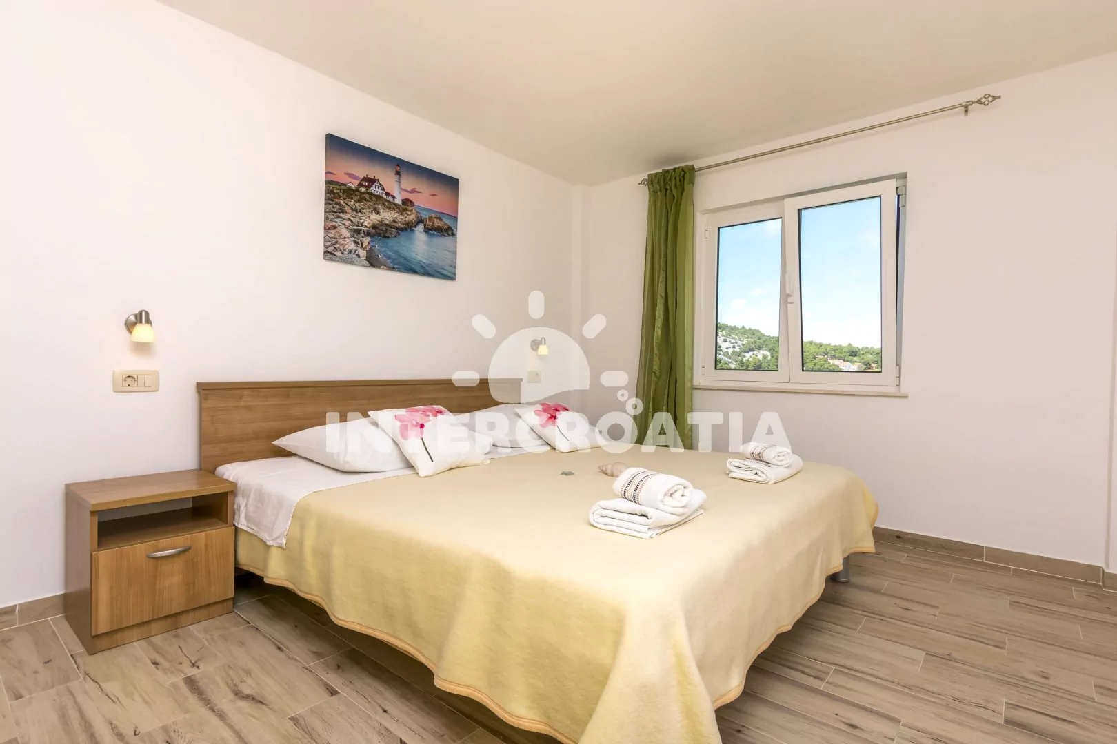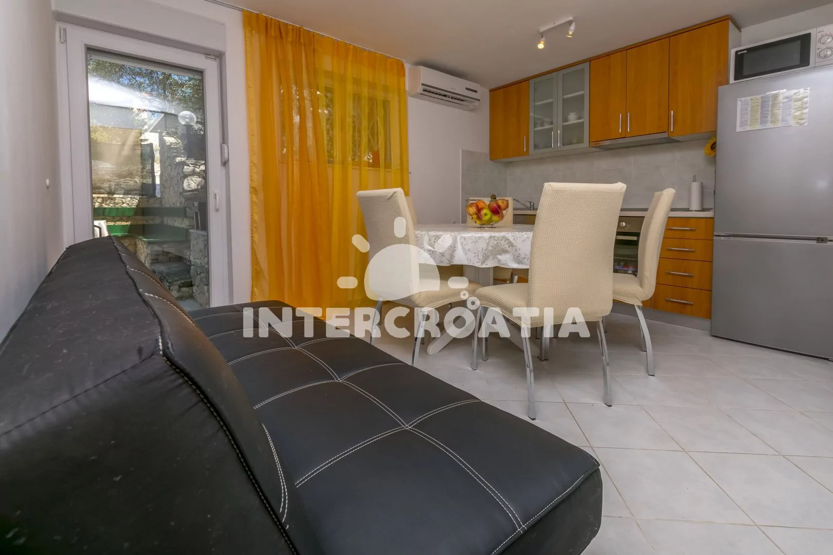 Moderně zařízený čtyřpokojový apartmán pro až 6 osob s výhledem na moře, nachází se v přízemí vilky. Obývací pokoj je spojený s kuchyní. Kuchyňská linka je vybavena sklokeramickou varnou deskou, vestavěnou troubou, myčkou na nádobí, mikrovlnnou troubou, rychlovarnou konvicí, nádobím a lednicí s mrazákem. Obývací pokoj s jídelním stolem pro 6 osob, pohovkou, televizí se satelitním programem, klimatizací a vstupem na terasu. První a druhá ložnice je vybavena vždy s jedním dvoulůžkem. Třetí ložnice s dvěma jednolůžky. Koupelna se sprchovým koutem, pračkou, umyvadlem, fénem, bidetem a wc. Dále samostatné wc s umyvadlem. Hostům je k dispozici parkování u objektu zdarma.