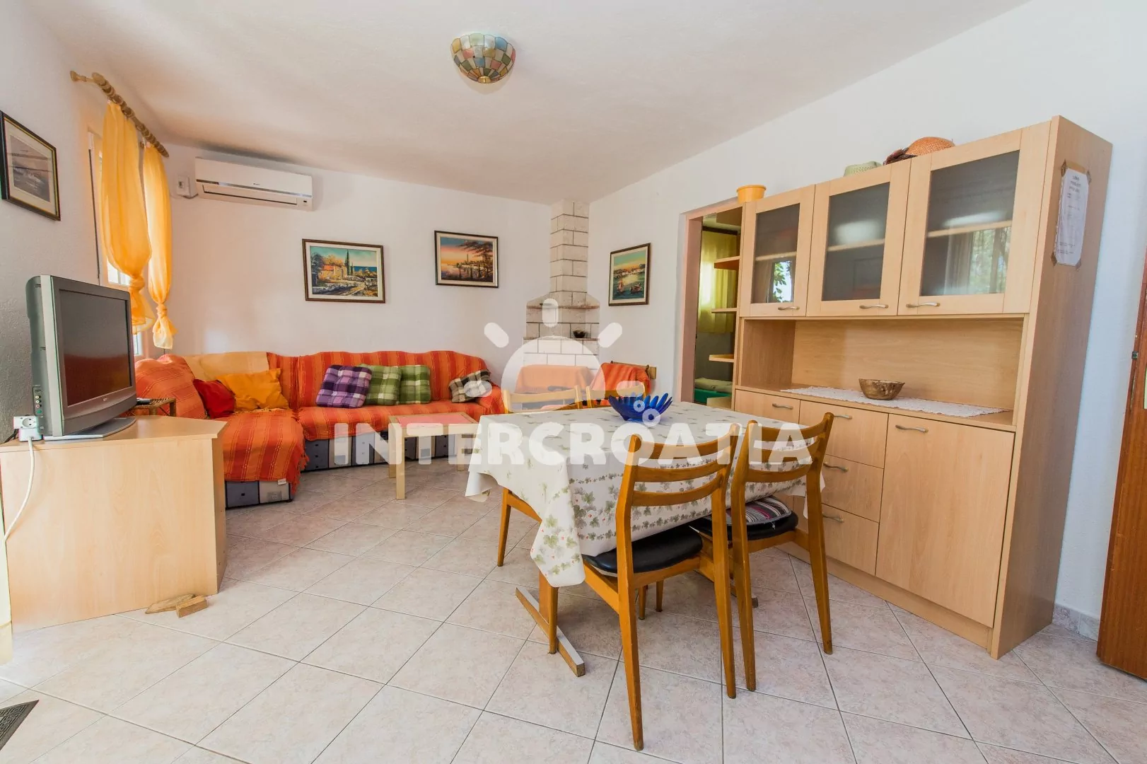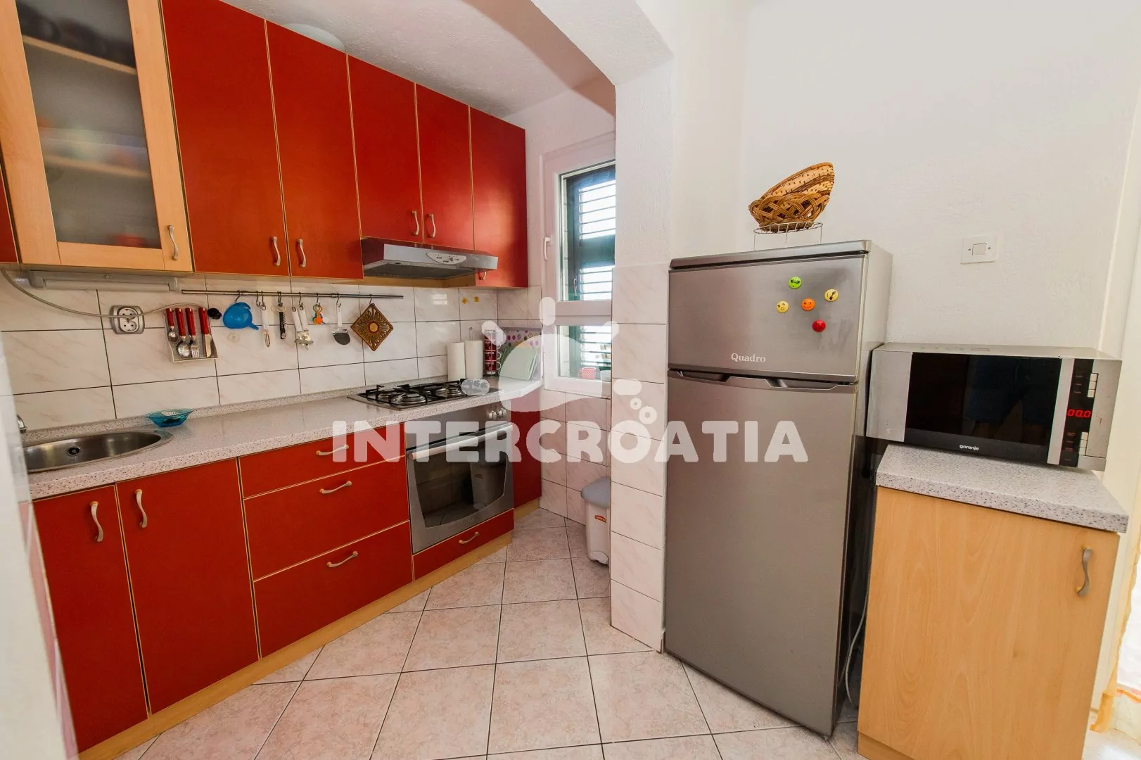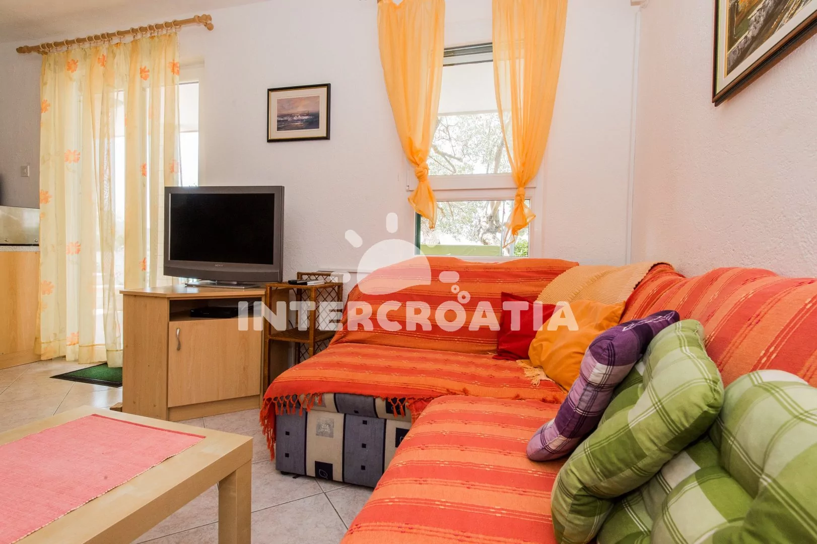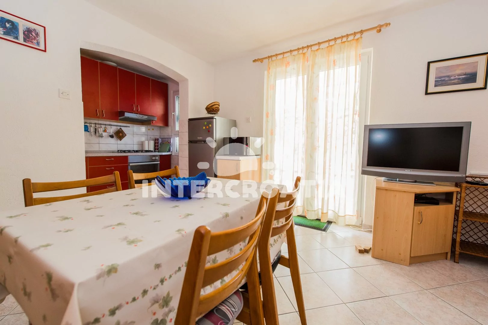 Třípokojový apartmán s terasou a výhledem na moře, nacházející se v přízemí. Obývací pokoj spojený s kuchyní. Kuchyňská linka se sporákem, troubou, mikrovlnnou troubou, lednicí s mrazákem, kávovarem, toustovačem, rychlovarnou konvicí a nádobím. V obývacím pokoji jídelní stůl pro 4 osoby, sedací souprava, rádio a LCD televize. První ložnice s dvoulůžkem. Druhá ložnice s dvěma jednolůžky. Koupelna se sprchovým koutem, umyvadlem a wc. Hosté mají k dispozici terasu s posezením a v zahradě společný gril. Parkování u objektu.