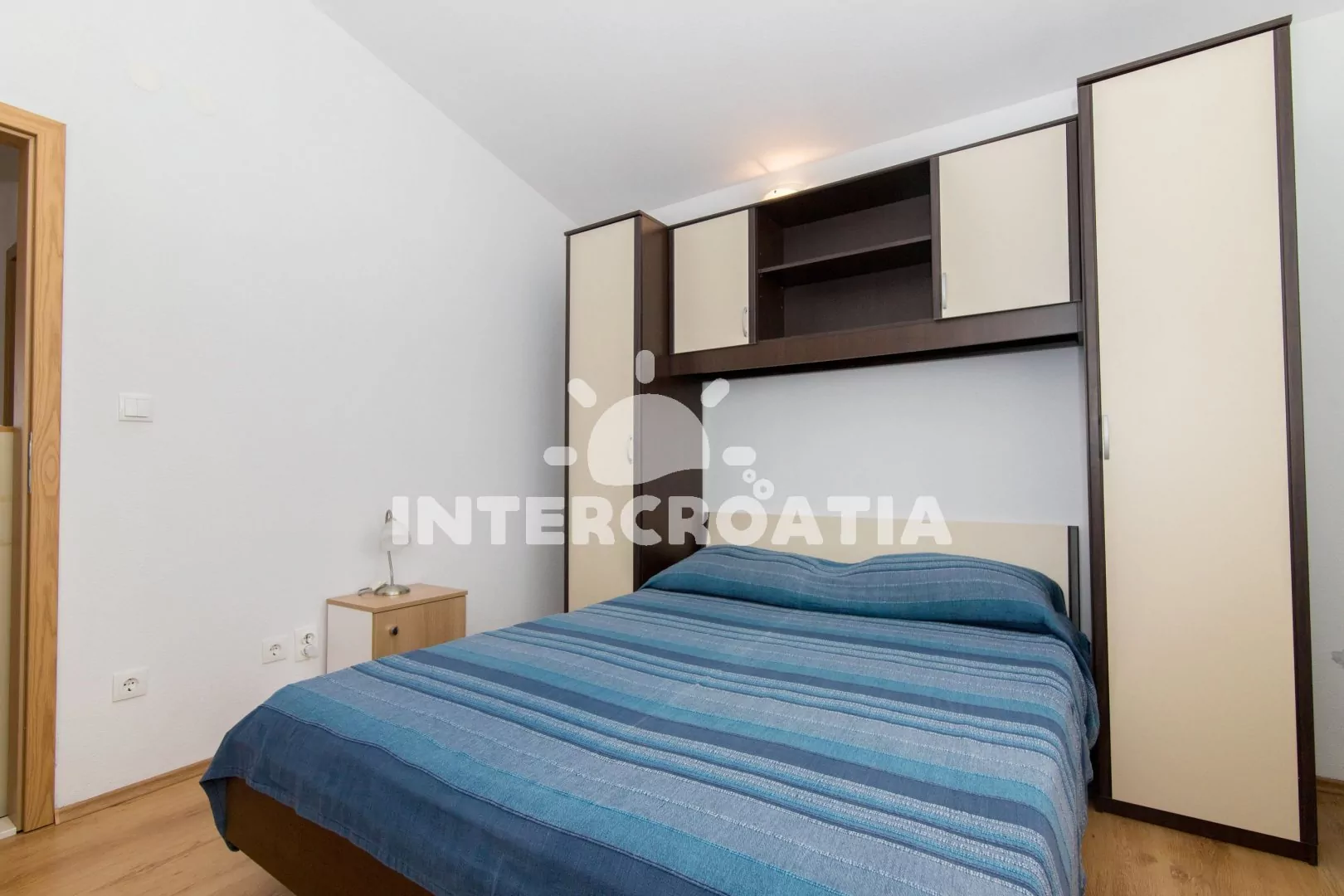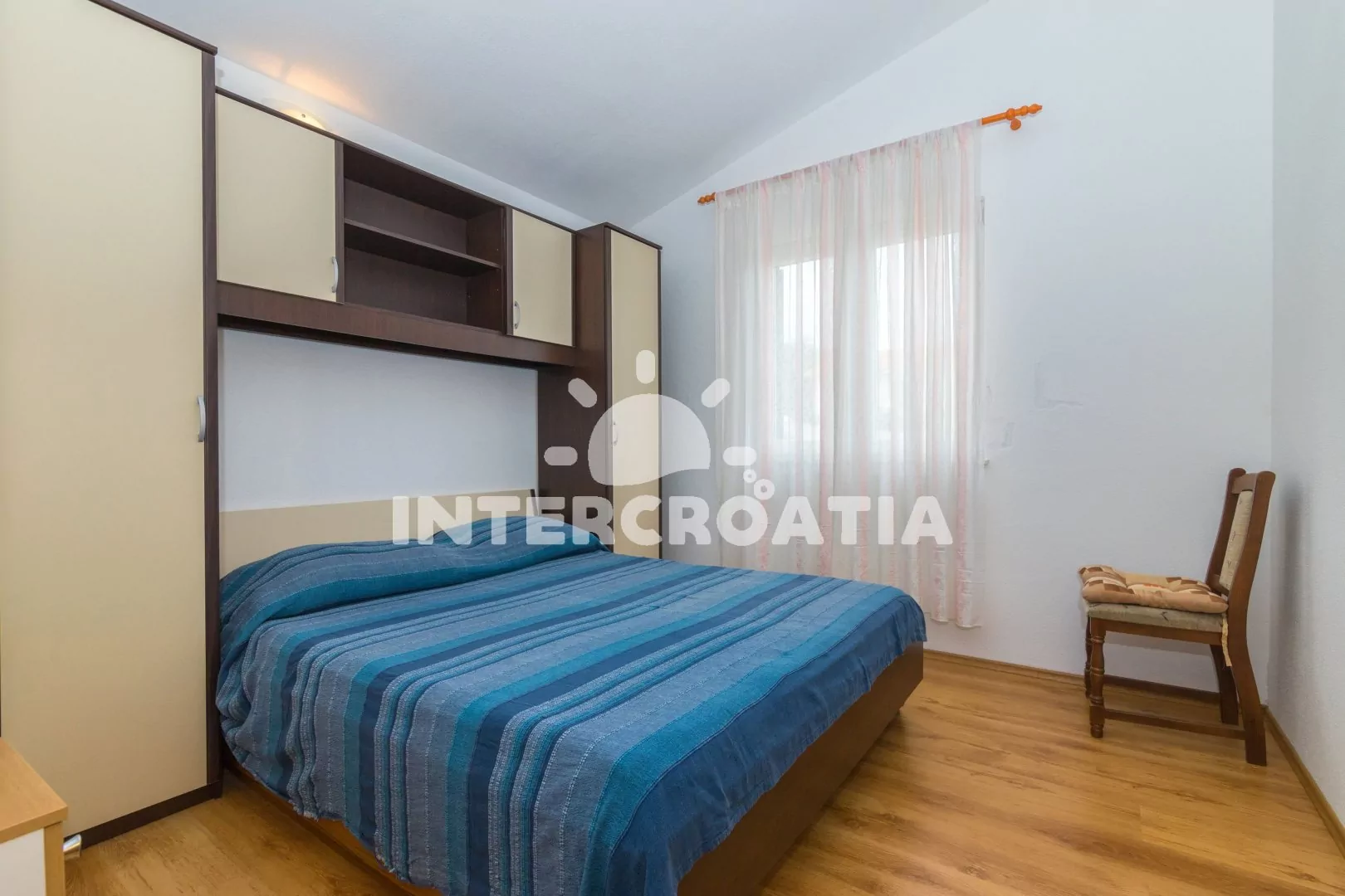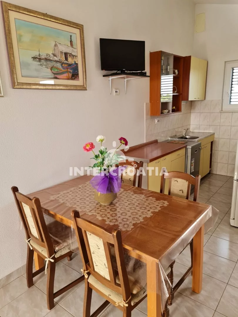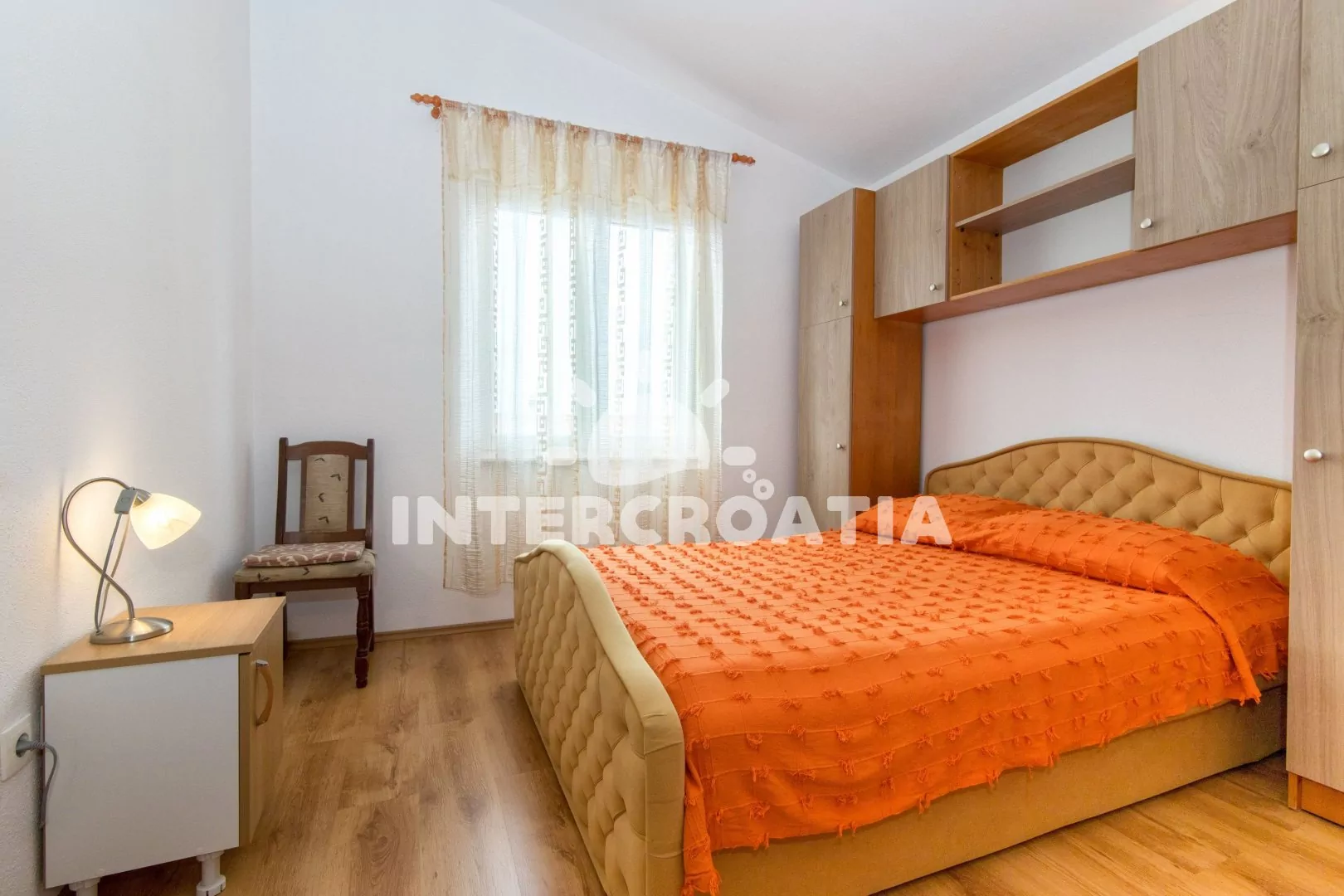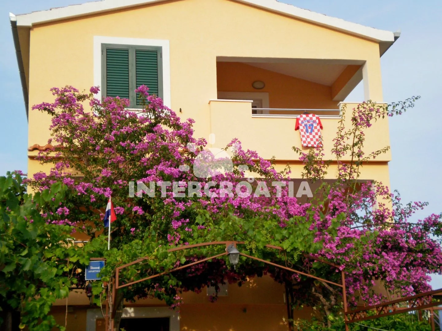 Apartmán s terasou a výhledem na moře se nachází v druhém patře a je vhodný pro 4 až 5 osob. Obývací pokoj je spojený s kuchyní. Kuchyňská linka se sporákem, troubou, myčkou na nádobí, rychlovarnou konvicí, kávovarem, toustovačem, nádobím a lednicí s mrazákem. Obývací pokoj s jídelním stolem pro 4 osoby, rohovou pohovkou, televizí se satelitním programem, klimatizací a vstupem na terasu. První ložnice s jedním dvoulůžkem a jedním jednolůžkem. Druhá ložnice s dvoulůžkem. Koupelna se sprchovým koutem, umyvadlem, pračkou a wc. Hostům je k dispozici parkování u objektu zdarma.