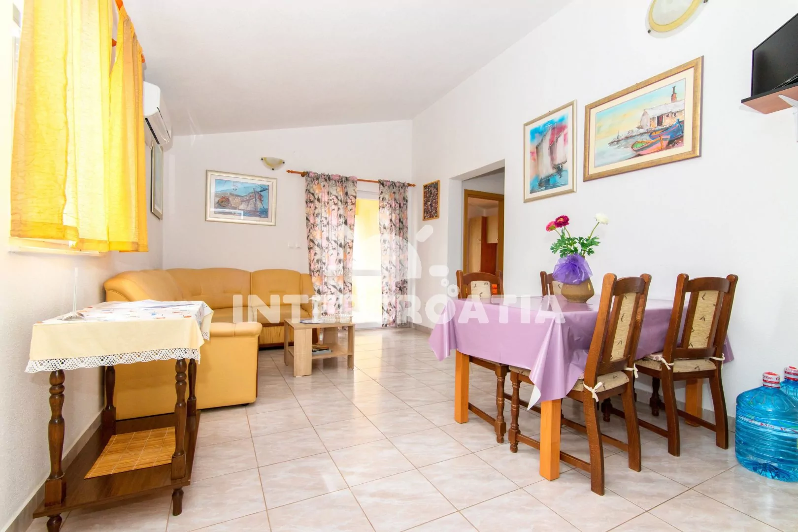 Apartmán s terasou a výhledem na moře se nachází v druhém patře a je vhodný pro 4 až 5 osob. Obývací pokoj je spojený s kuchyní. Kuchyňská linka se sporákem, troubou, myčkou na nádobí, rychlovarnou…