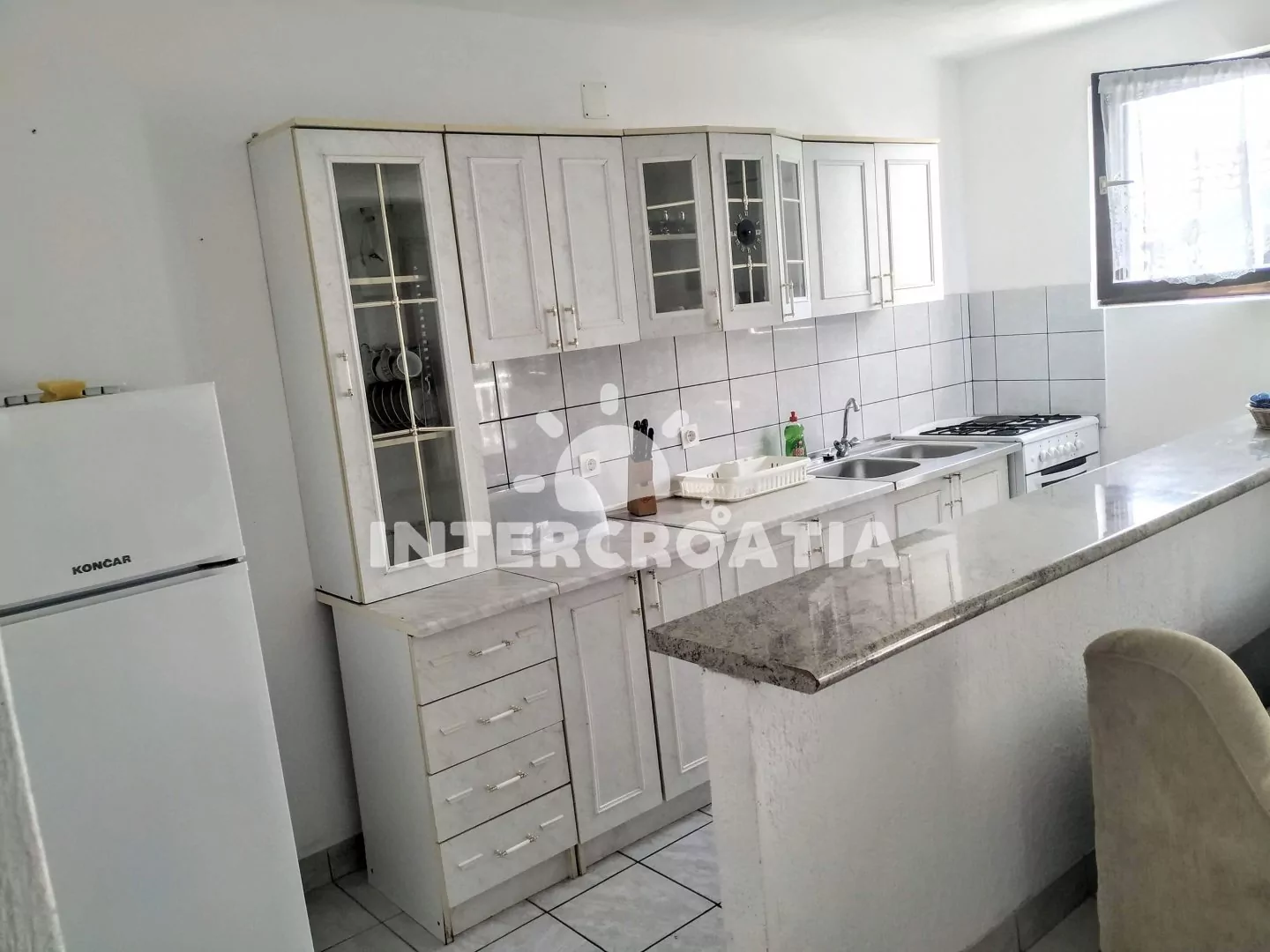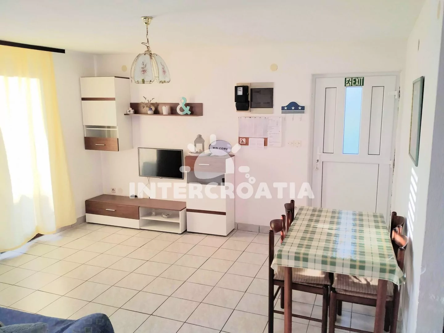 Apartmán pro 4 osoby, nachází se v přízemí a disponuje terasou s venkovním posezením a výhledem na moře. Obývací pokoj je spojený s kuchyní. Kuchyňská linka se sporákem, troubou, nádobím a lednicí s…