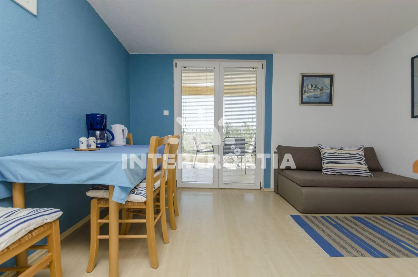 Vkusně zařízený apartmán v prvním patře, s výhledem na moře a vlastním balkonem s posezením. Apartmán je vhodný pro 2 až 3 osoby. Obývací pokoj je spojený s kuchyní. Kuchyňská linka je vybavena dvouplotýnkovým sporákem, mikrovlnnou troubou, kávovarem, nádobím a lednicí s mrazákem. Obývací pokoj s jídelním stolem pro 4 osoby, pohovkou (rozložitelná na extra lůžko pro 1 osobu), televizí se satelitním programem a vstupem na balkon. Ložnice je vybavena jedním dvoulůžkem. Koupelna se sprchovým koutem, umyvadlem a wc. Hostům je k dispozici parkování u objektu zdarma.