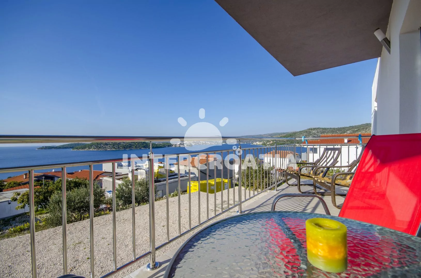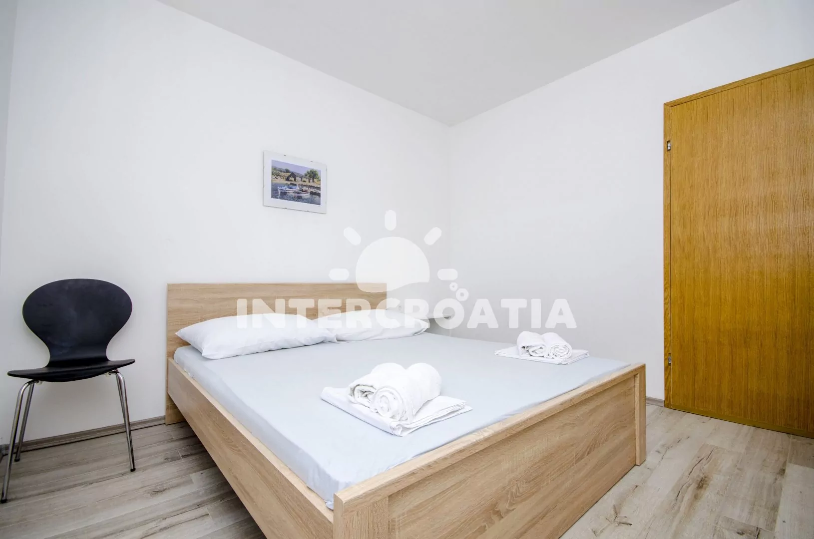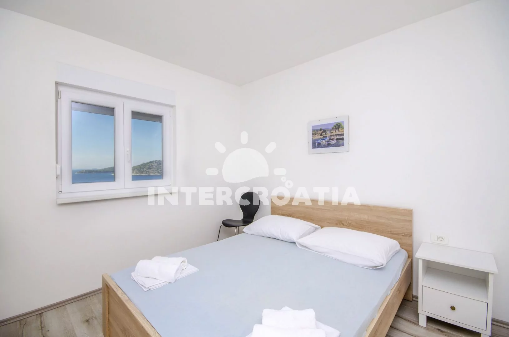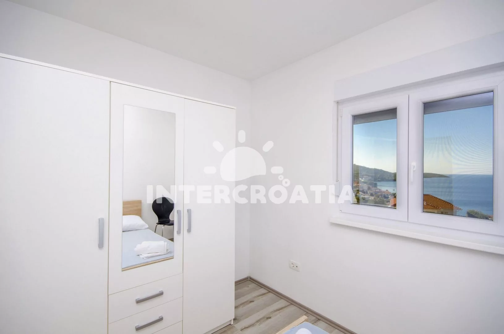 Apartmán (90 m2) s výhledem na moře a lodžií s venkovním posezením se nachází v 1. patře domu a je vhodný pro až 4 osoby. Obývací pokoj je spojený s kuchyní. Kuchyňská linka je vybavena sporákem, troubou, myčkou na nádobí, toustovačem, nádobím a lednicí s mrazákem. Obývací pokoj s jídelním stolem pro 6 osob, televizí, klimatizací a vstupem na balkon. První ložnice s dvoulůžkem. Druhá ložnice s dvoulůžkem. Koupelna se sprchovým koutem, umyvadlem, bidetem, pračkou a wc. Dále samostatné wc s umyvadlem. Hostům je k dispozici parkování u objektu zdarma.