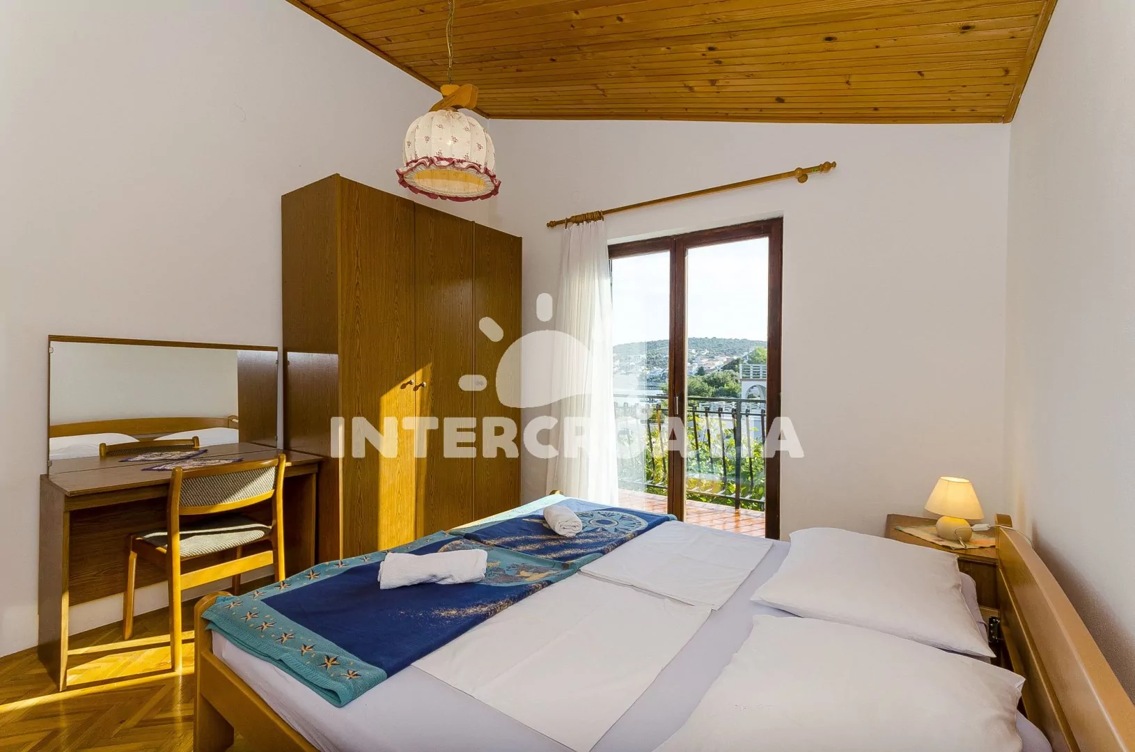 Apartmán (90 m2) s terasou, výhledem na moře a venkovním posezením se nachází v 2. patře domu. Apartmán je vhodný pro 4 až 6 osob. Obývací pokoj je spojený s kuchyní. Kuchyňská linka je vybavena sporákem s troubou, rychlovarnou konvicí, mikrovlnnou troubou, nádobím a lednicí s mrazákem. Obývací pokoj s jídelním stolem pro 6 osob, sedací soupravou s pohovkami, přistýlkou (extra lůžko pro 1 osobu), televizí se satelitním programem a vstupem na terasu. První ložnice s dvoulůžkem a vstupem na terasu. Druhá ložnice s dvoulůžkem a jedním jednolůžkem. Koupelna s vanou, umyvadlem a wc. Hostům je k dispozici parkování u objektu zdarma.