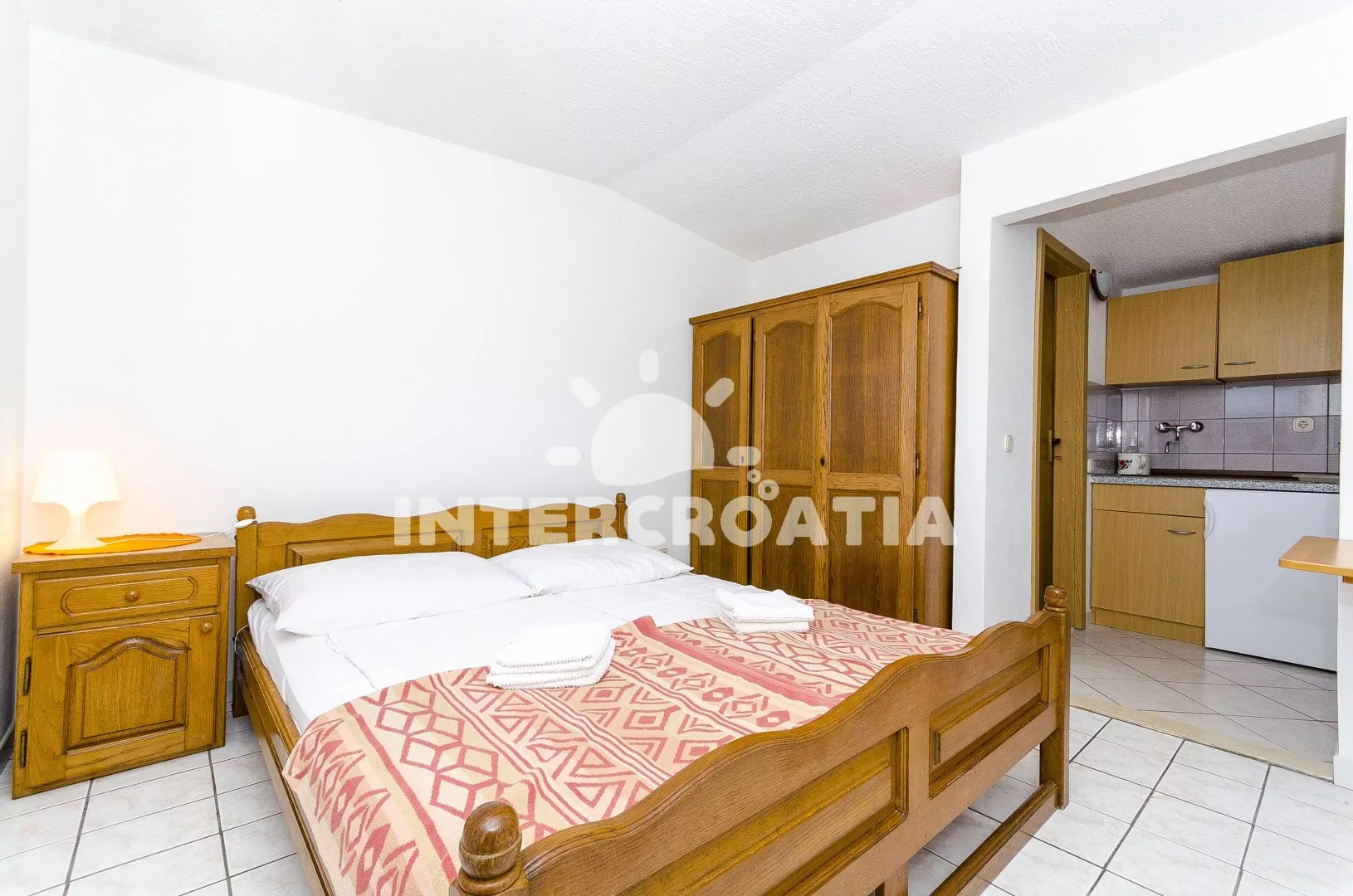 Apartmán (25 m2) typu studio se sdílenou terasou, výhledem na moře a venkovním posezením se nachází v přízemí domu. Apartmán je vhodný pro 2 osoby. Obývací místnost je spojena s kuchyní. Kuchyňská linka je vybavena dvouplotýnkovým vařičem, rychlovarnou konvicí, nádobím a lednicí s mrazákem. Obývací místnost s dvoulůžkem a televizí se satelitním programem. Koupelna se sprchovým koutem, umyvadlem a wc. Hostům je k dispozici parkování u objektu zdarma.
