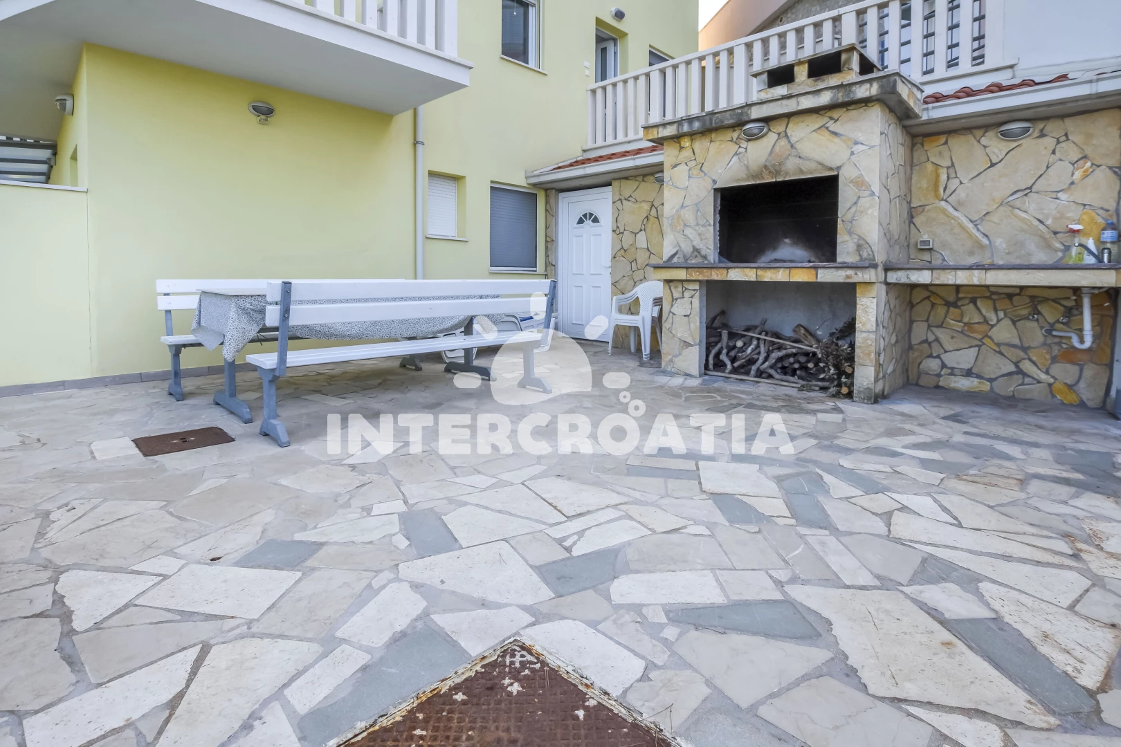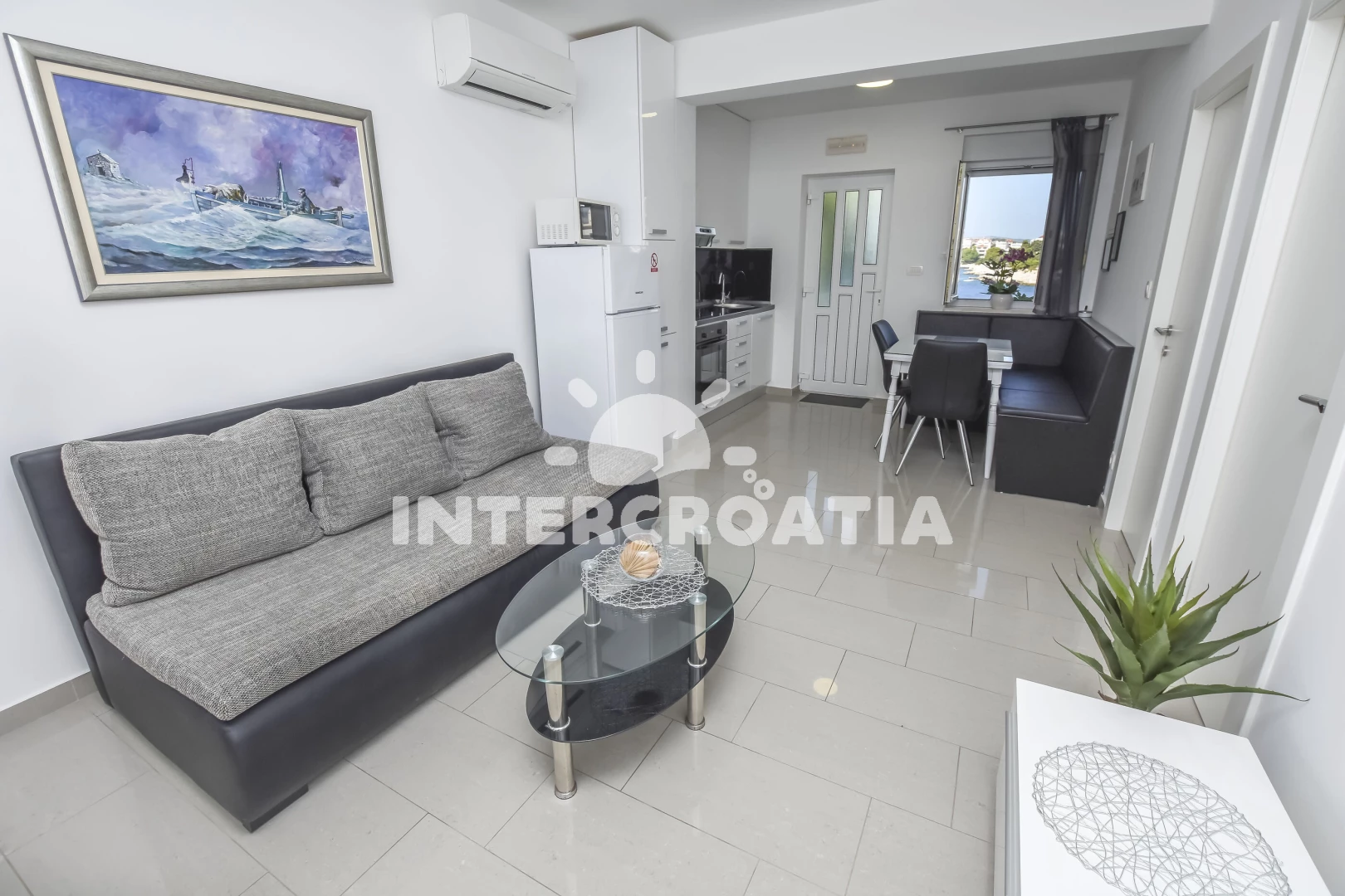 Apartmán se nachází 10 m od moře a pláže. Pláž je betonové desky. U objektu je k dispozici společná zahrada s posezením a grilem.